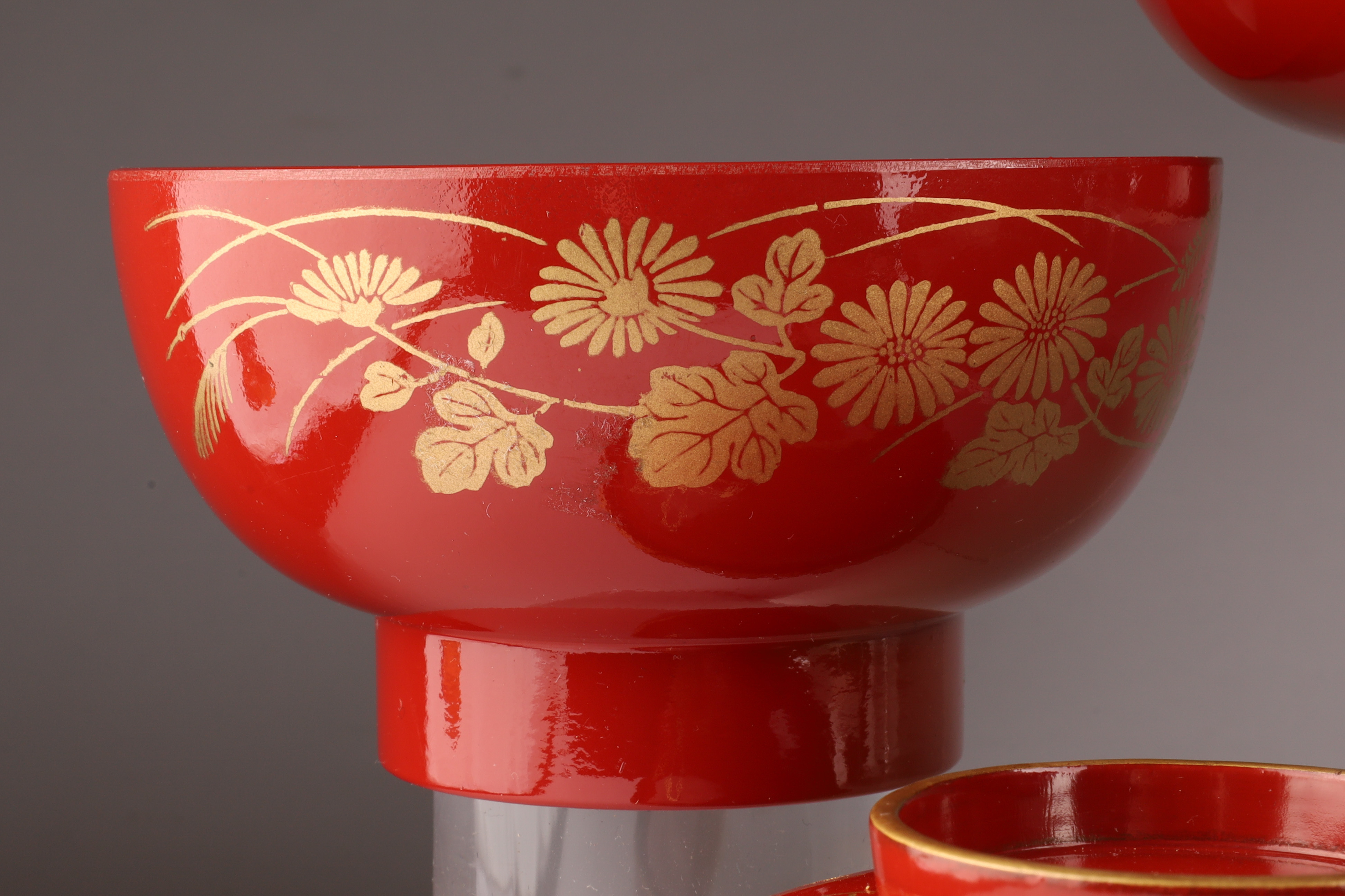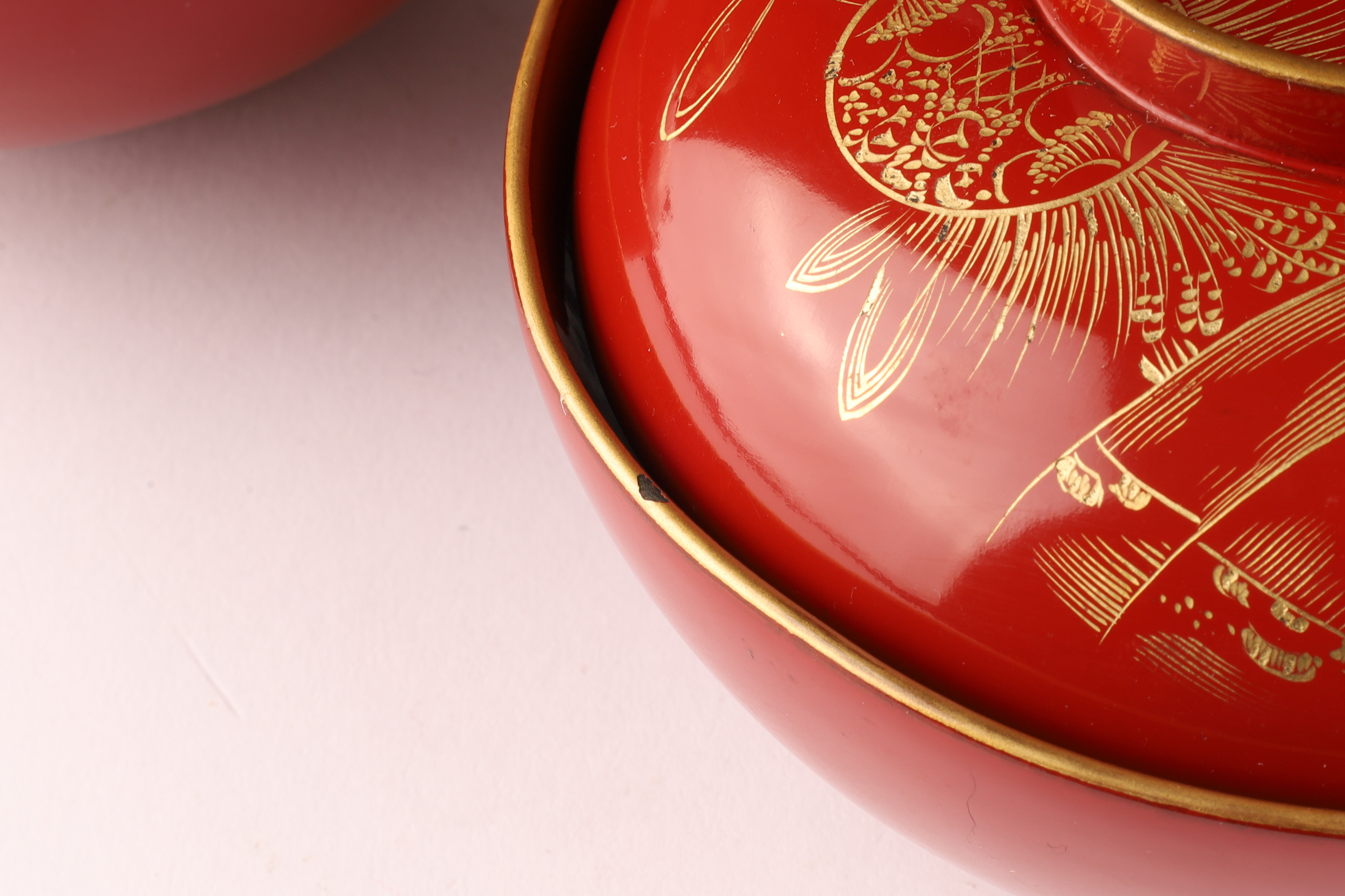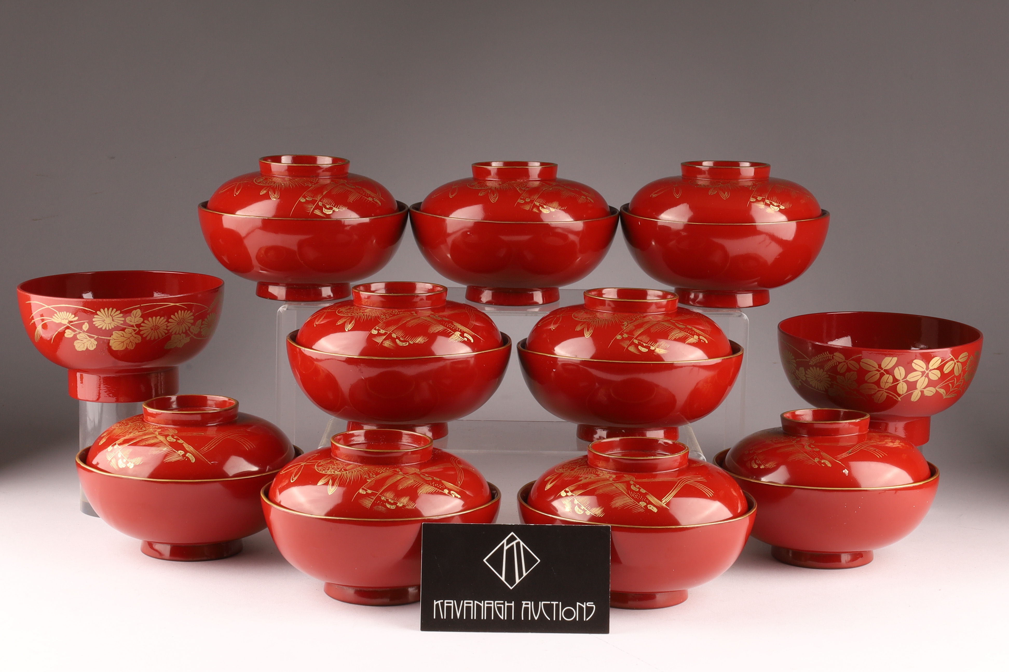 Set of 9 Chinese or Japanese Gilt Lacquer Lidded Bowls, 2 Bowls