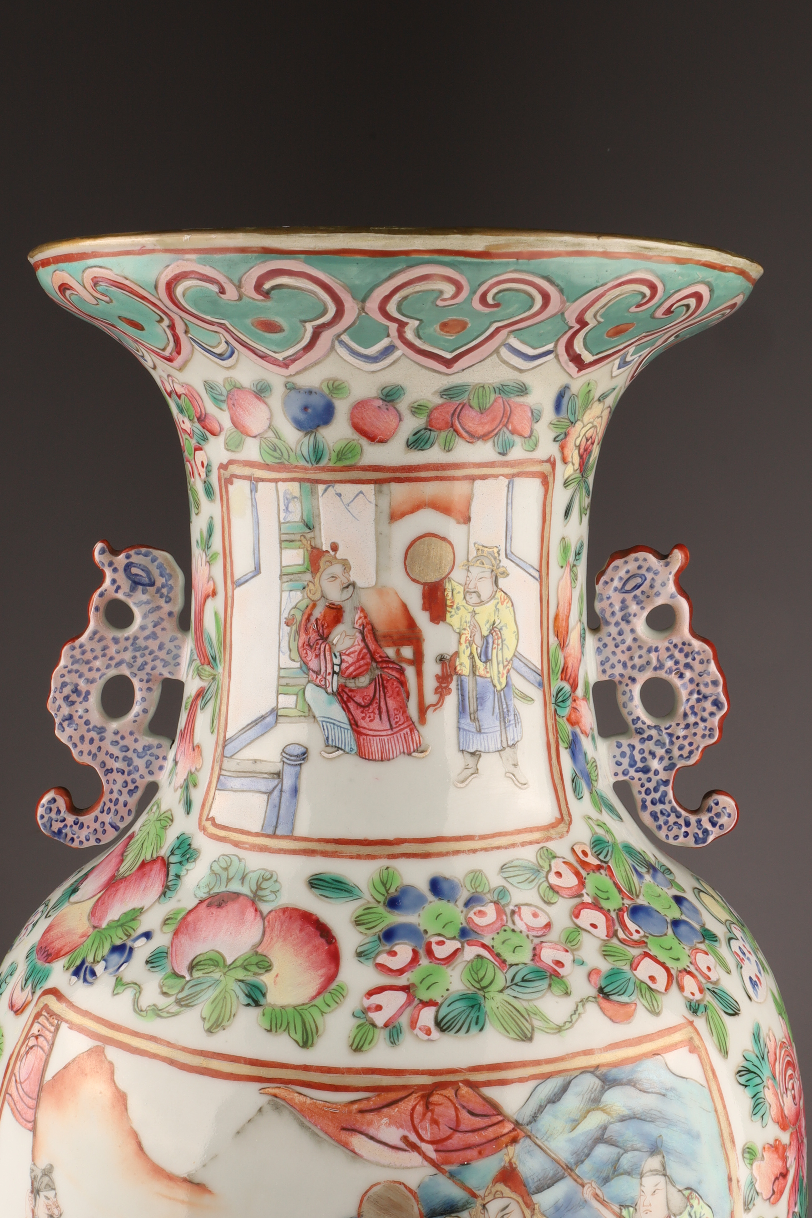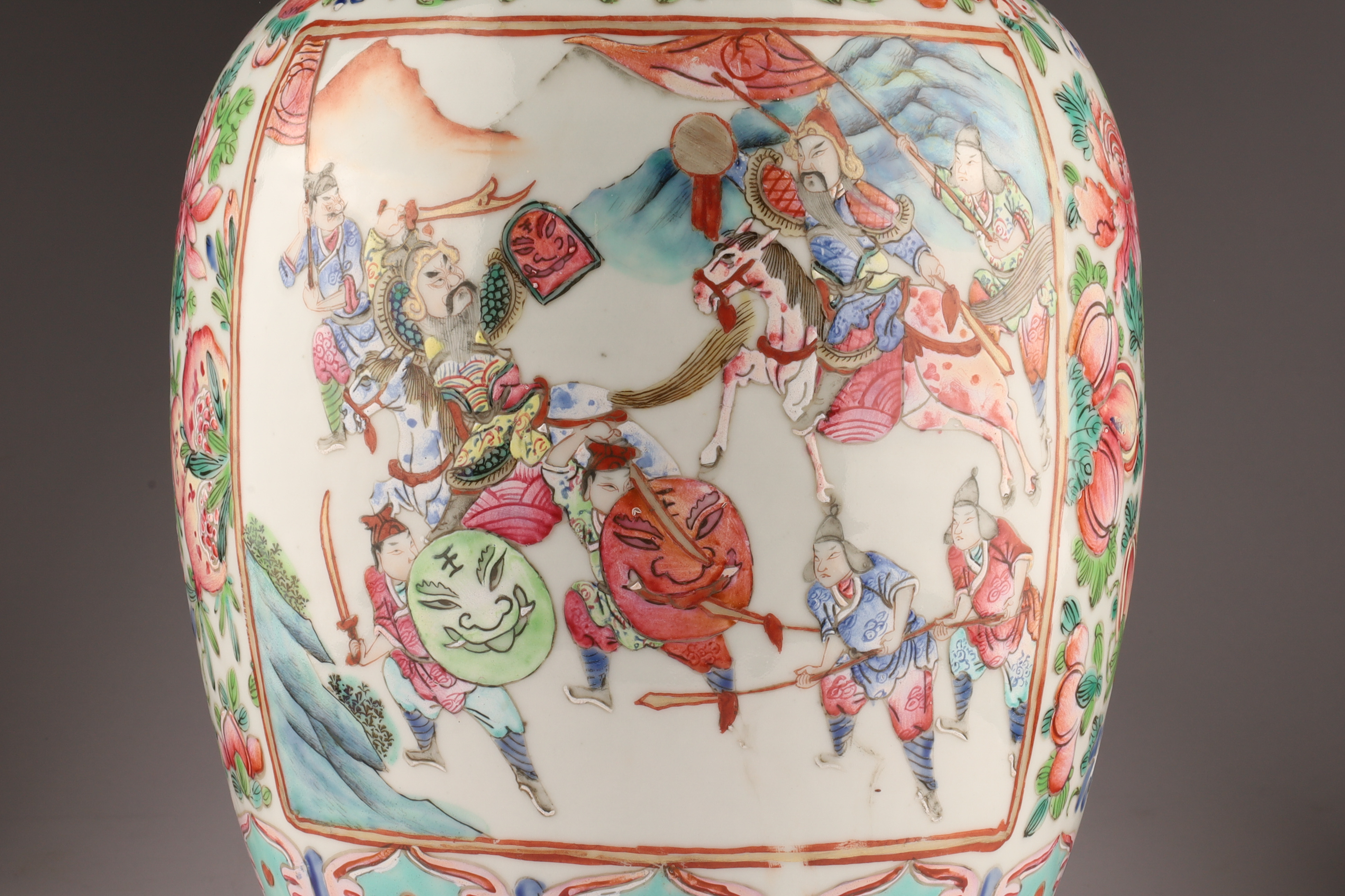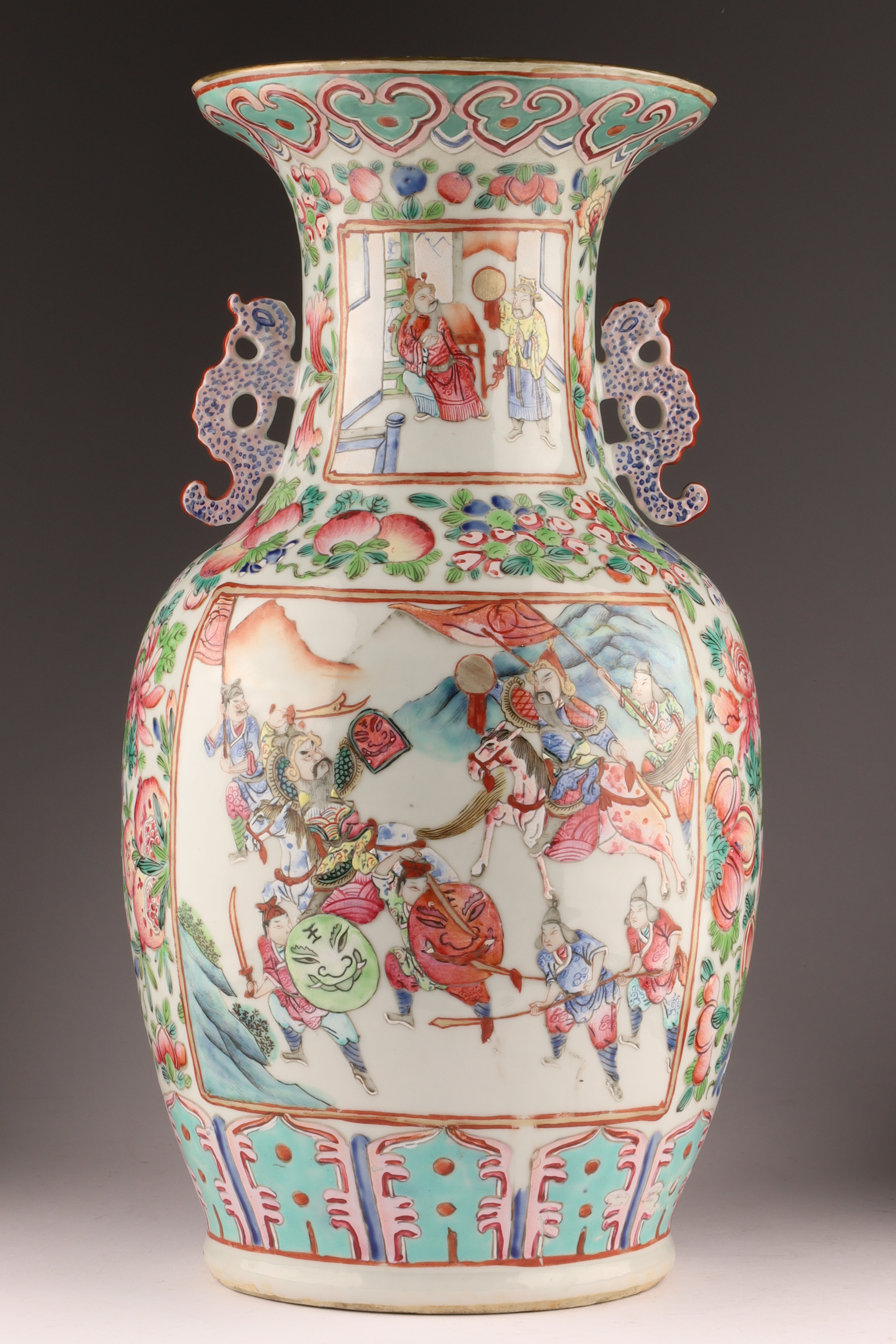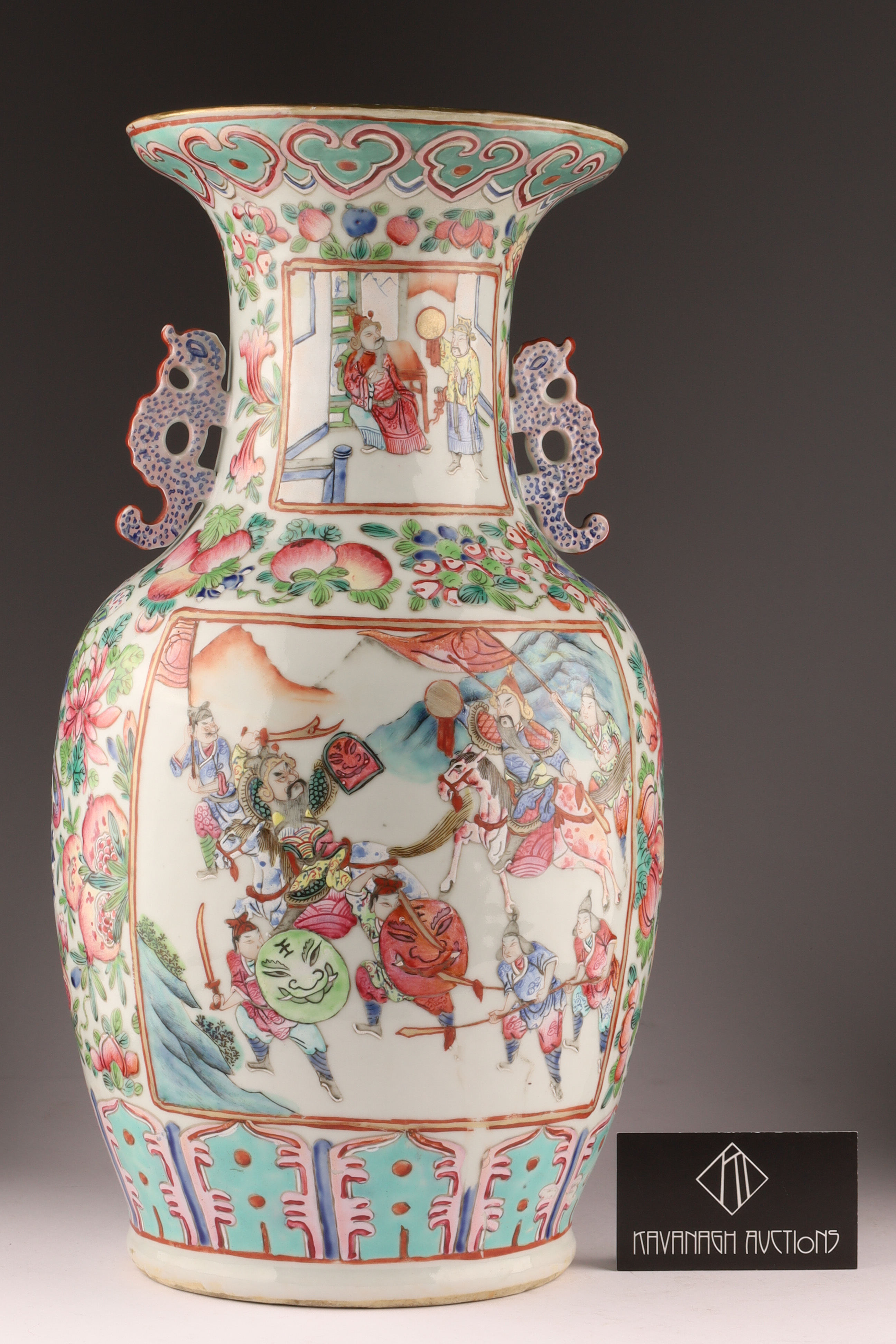Hand-painted famille rose enamels; continuous warrior procession around the body, auspicious peaches and blossoms at the shoulder, and a figural interior scene panel at the neck. Applied pierced dragon-form handles. Unglazed footrim with old collector’s label; typical firing speckles. Height approx. 16 inches. Republic Period (early-mid 20th century).
