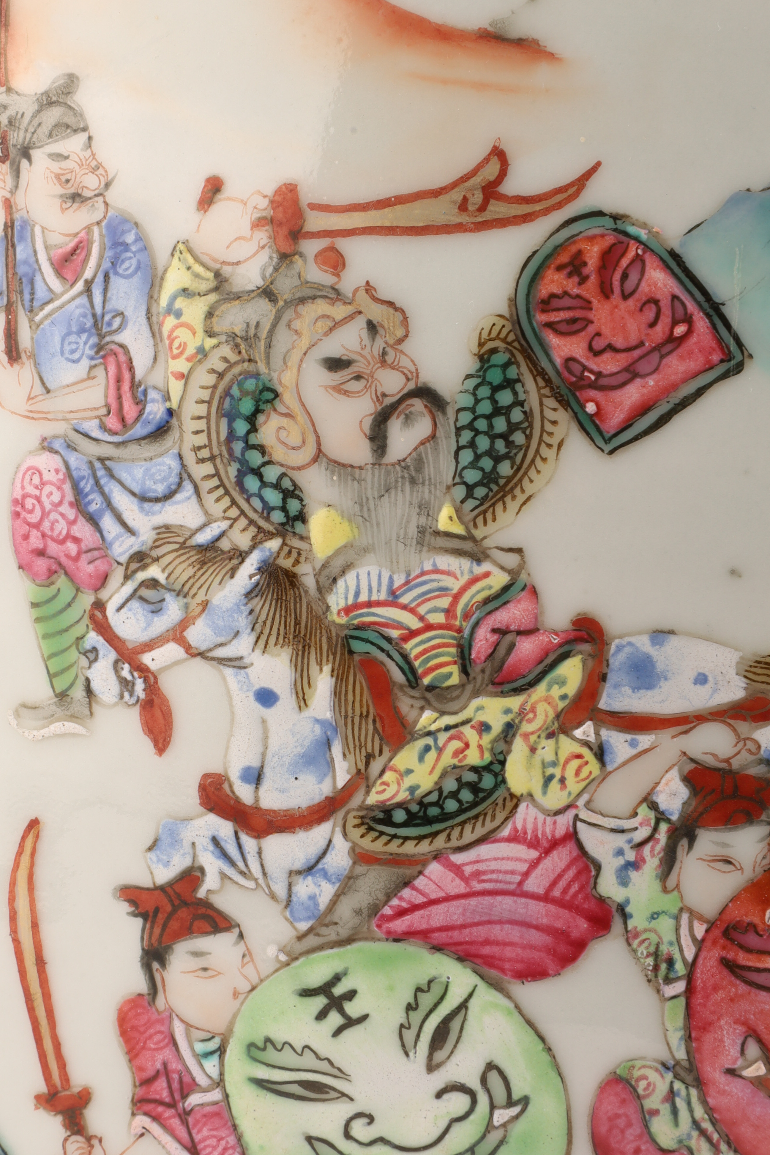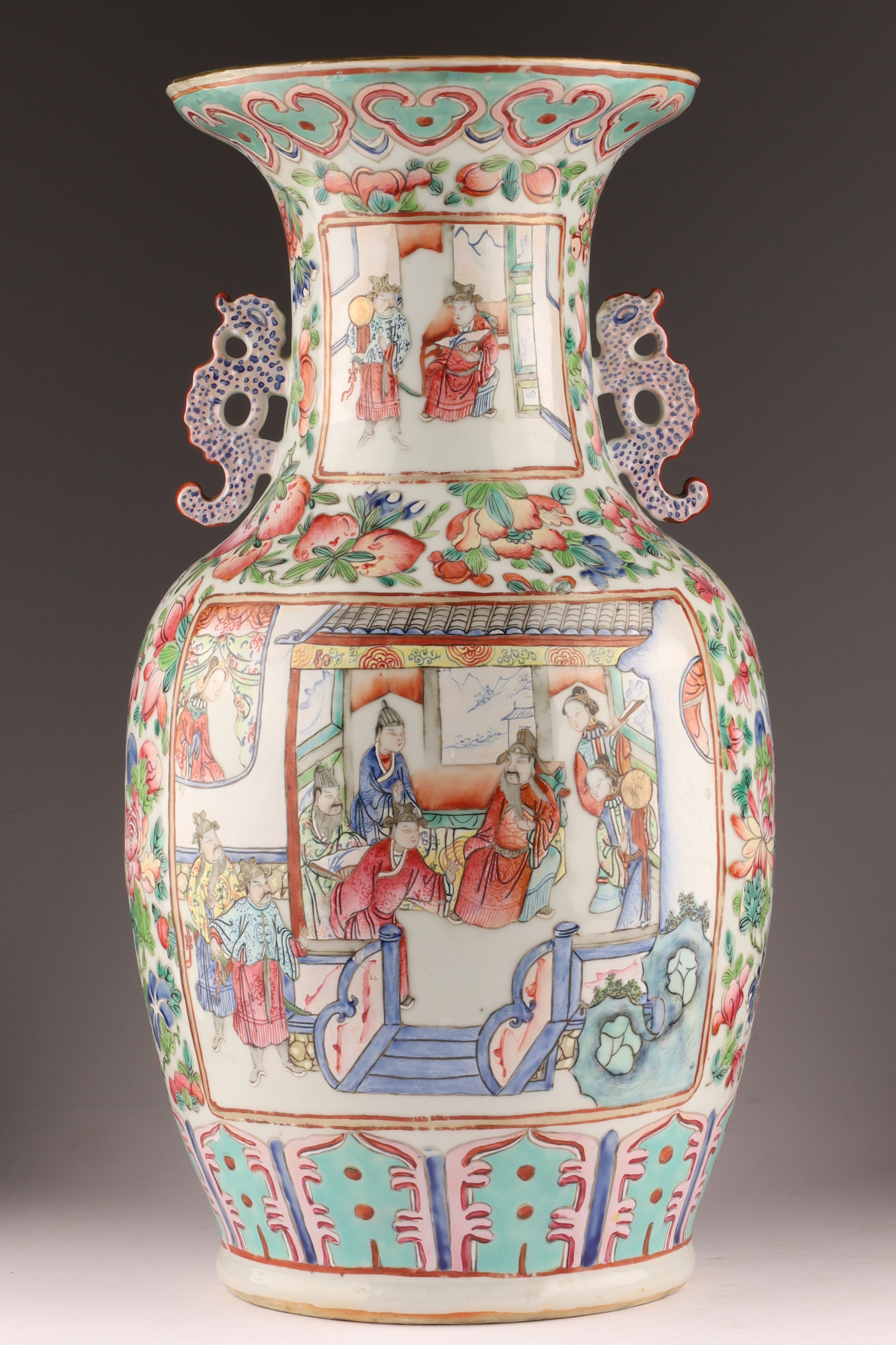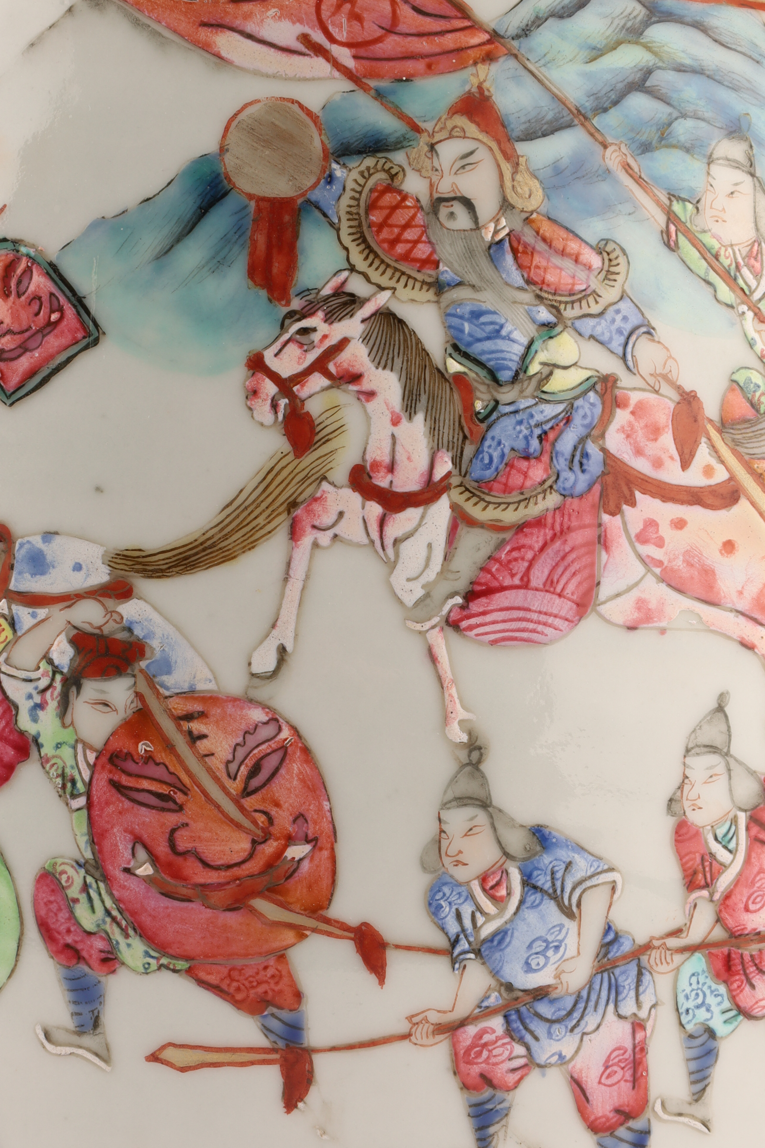 Hand-painted famille rose enamels; continuous warrior procession around the body, auspicious peaches and blossoms at the shoulder, and a figural interior scene panel at the neck. Applied pierced dragon-form handles. Unglazed footrim with old collector’s label; typical firing speckles. Height approx. 16 inches. Republic Period (early-mid 20th century).
