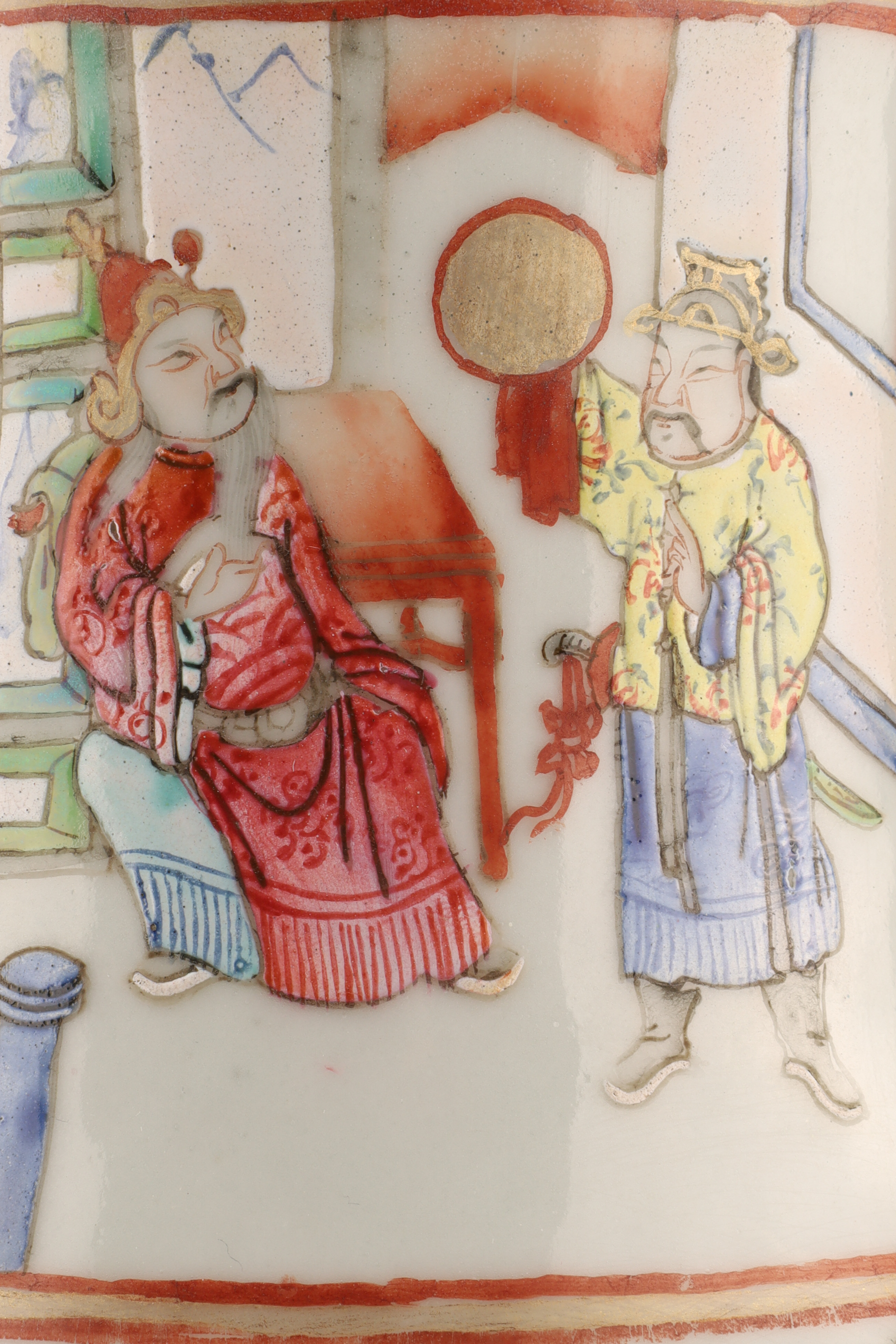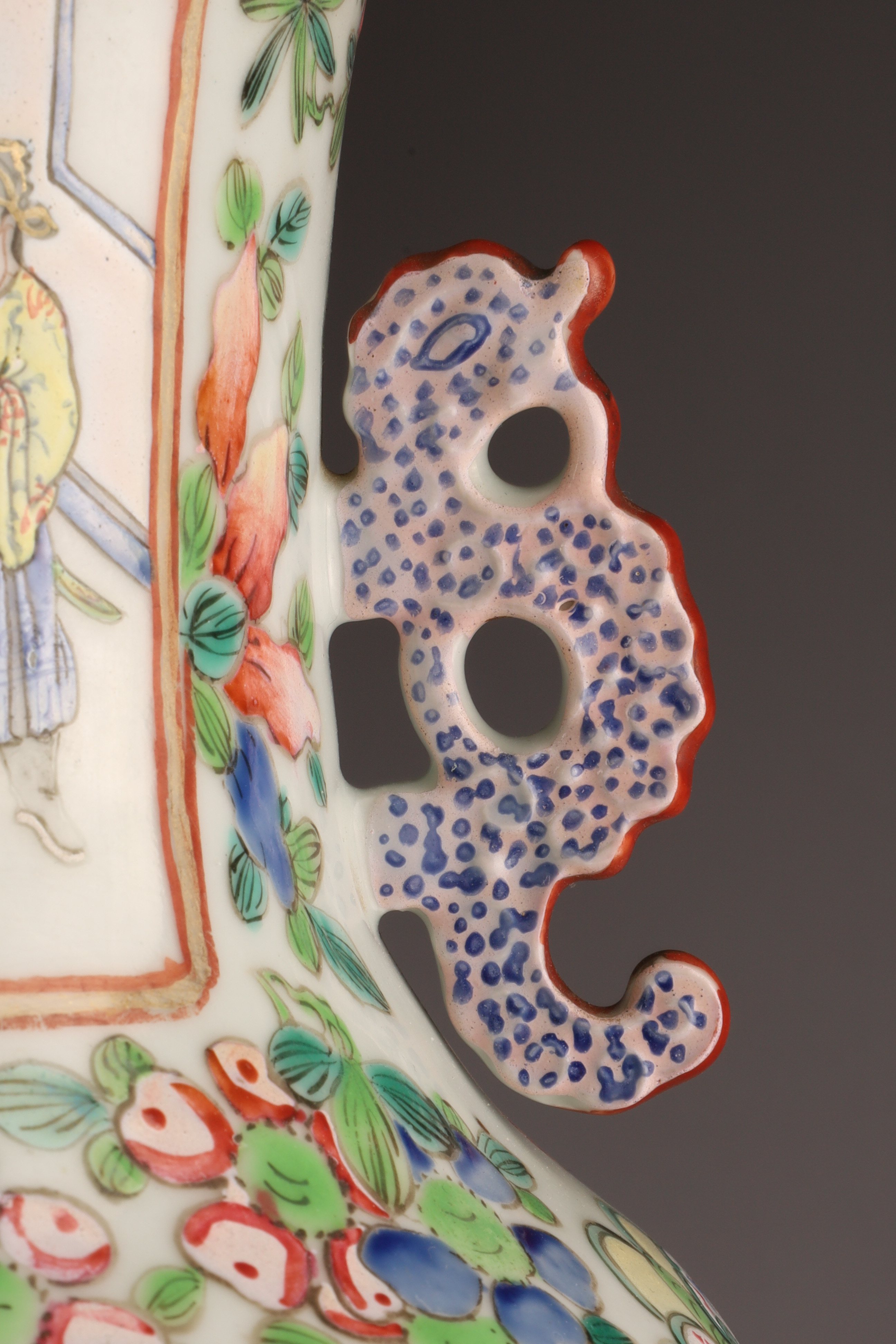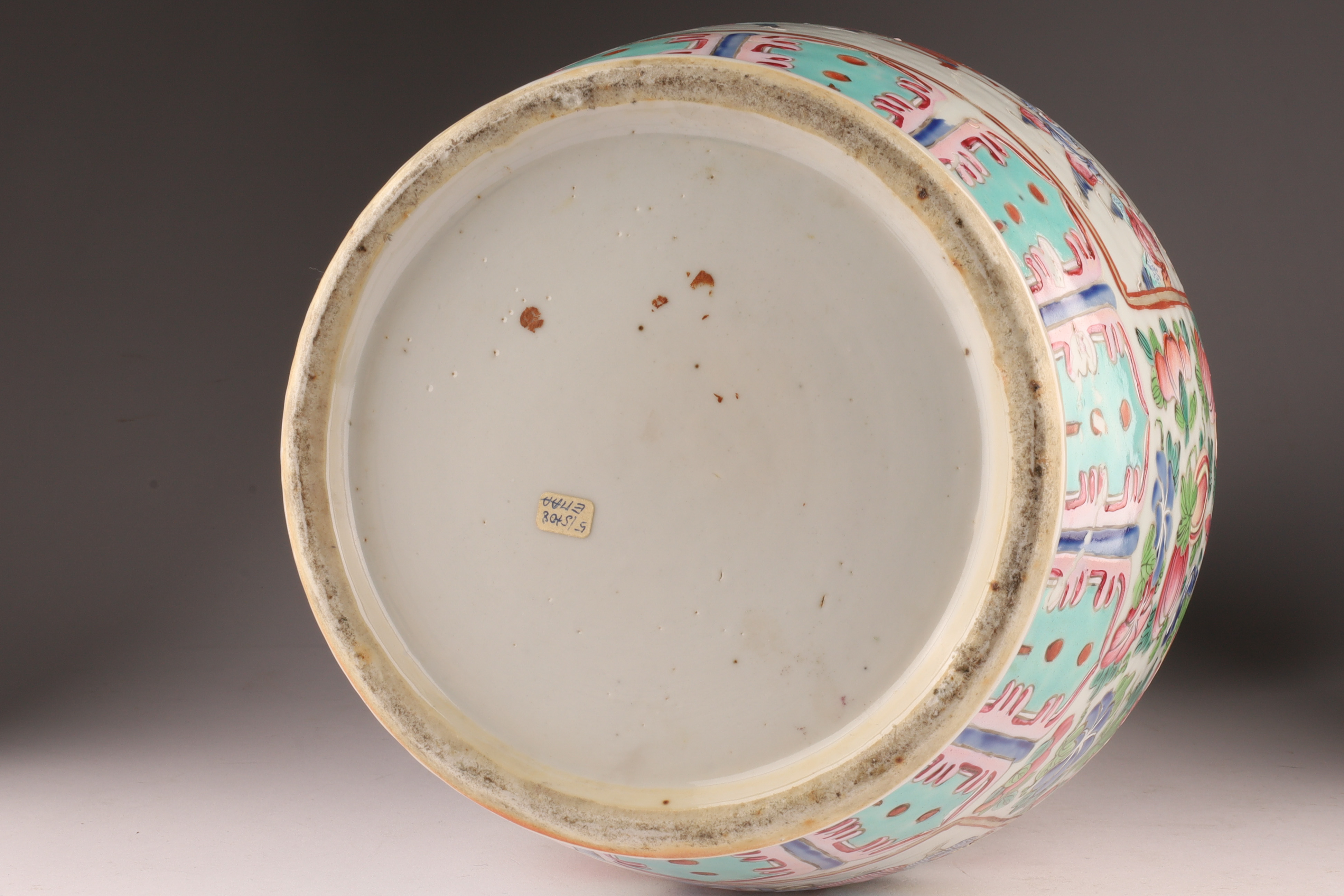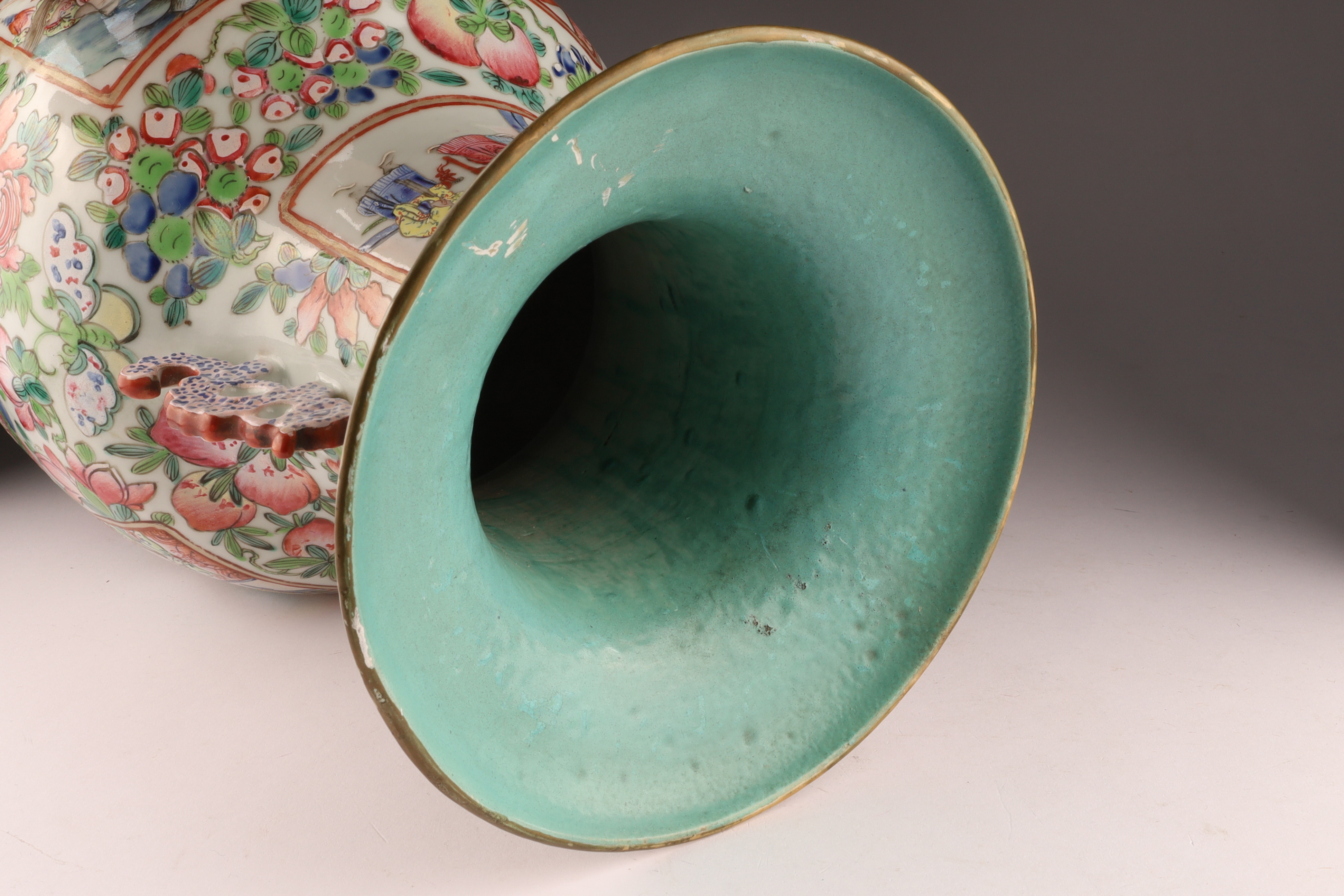 Hand-painted famille rose enamels; continuous warrior procession around the body, auspicious peaches and blossoms at the shoulder, and a figural interior scene panel at the neck. Applied pierced dragon-form handles. Unglazed footrim with old collector’s label; typical firing speckles. Height approx. 16 inches. Republic Period (early-mid 20th century).