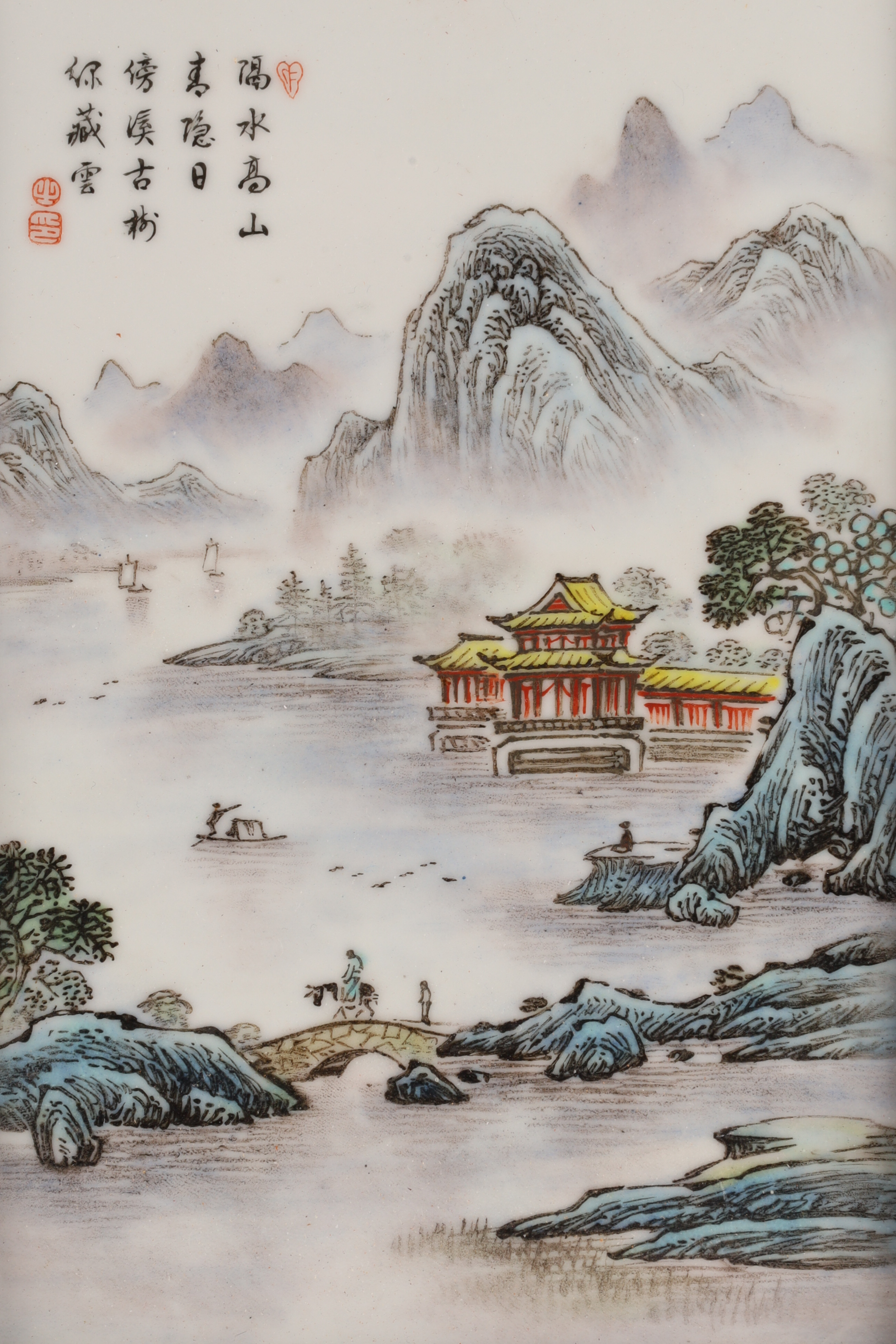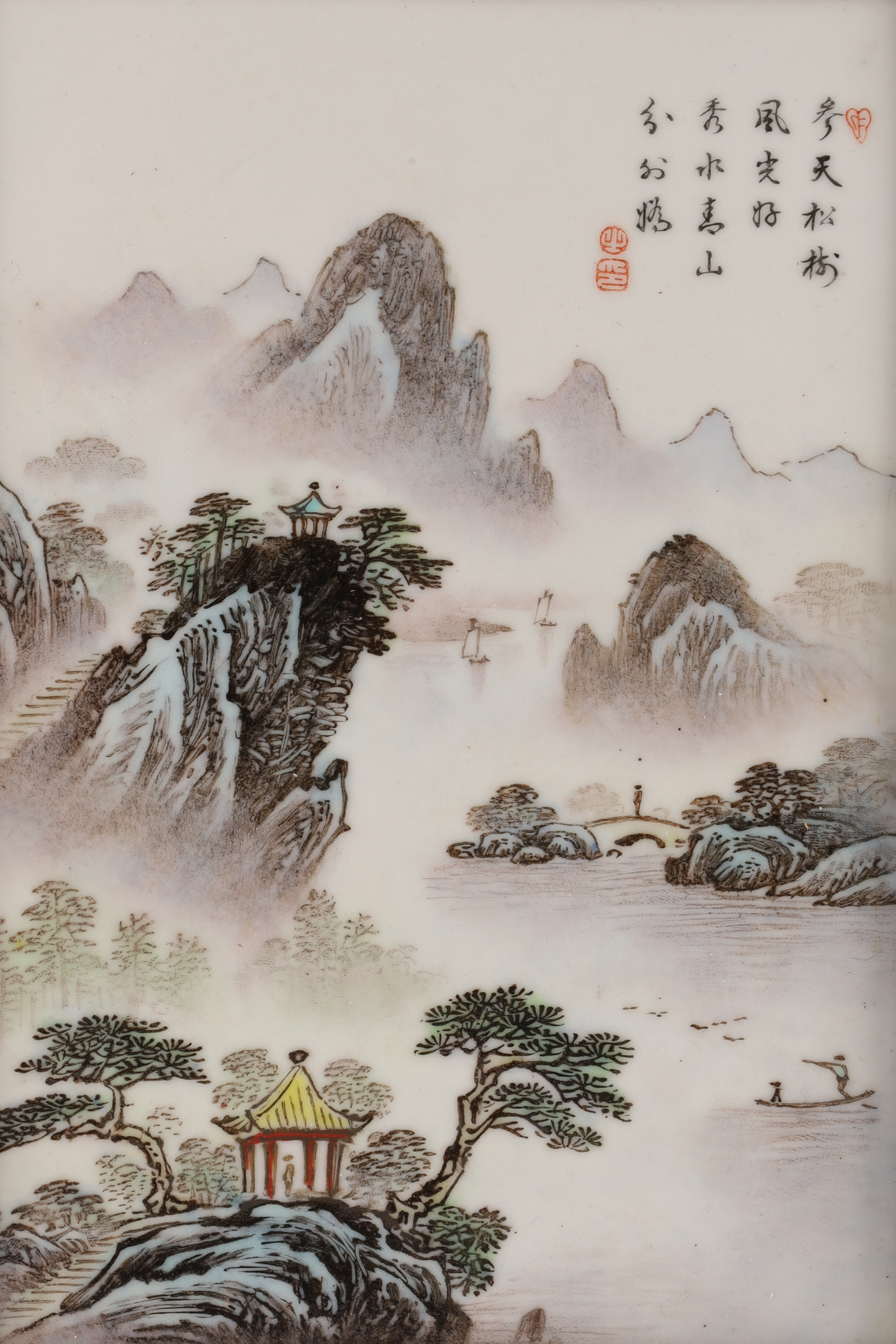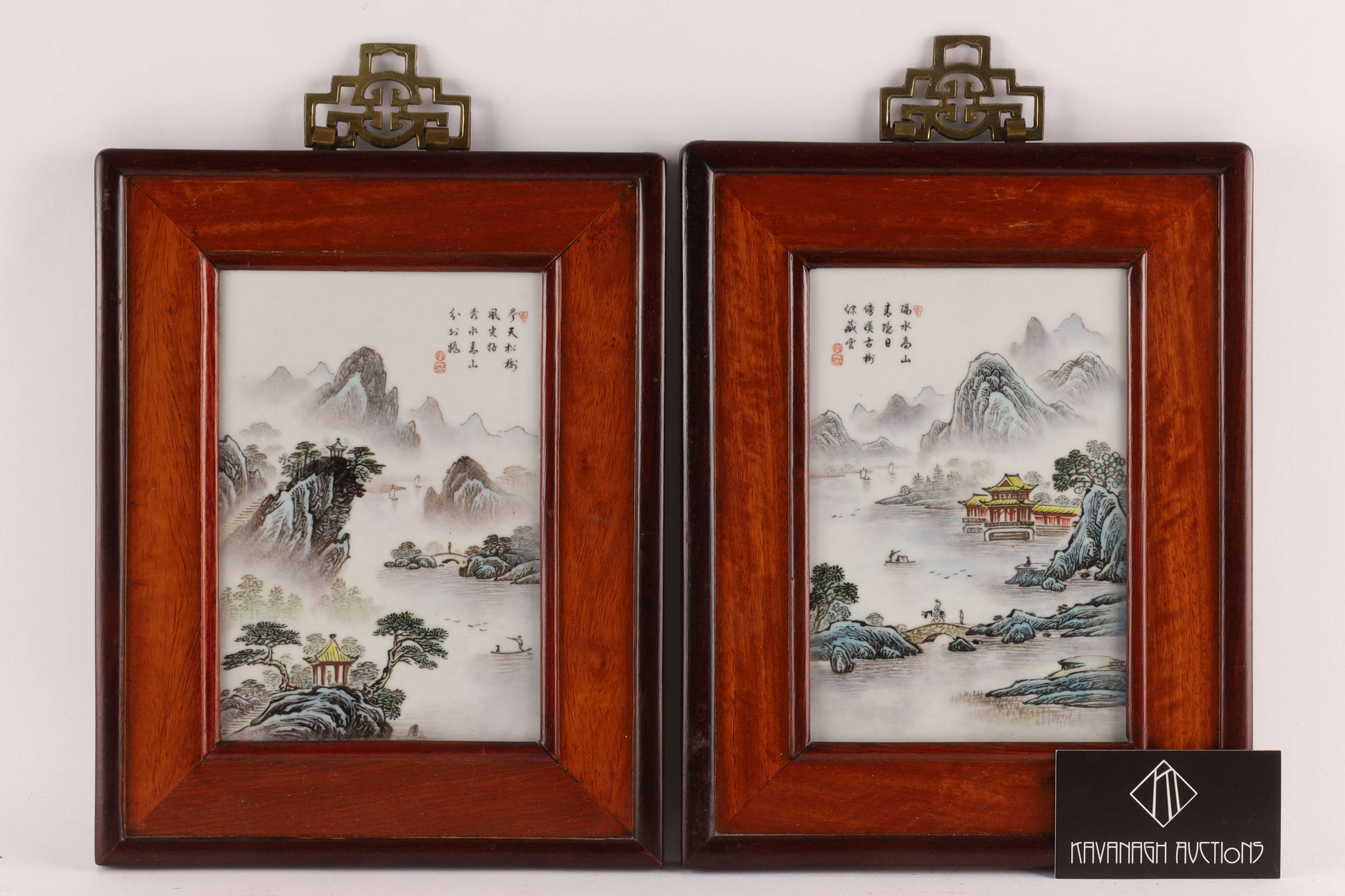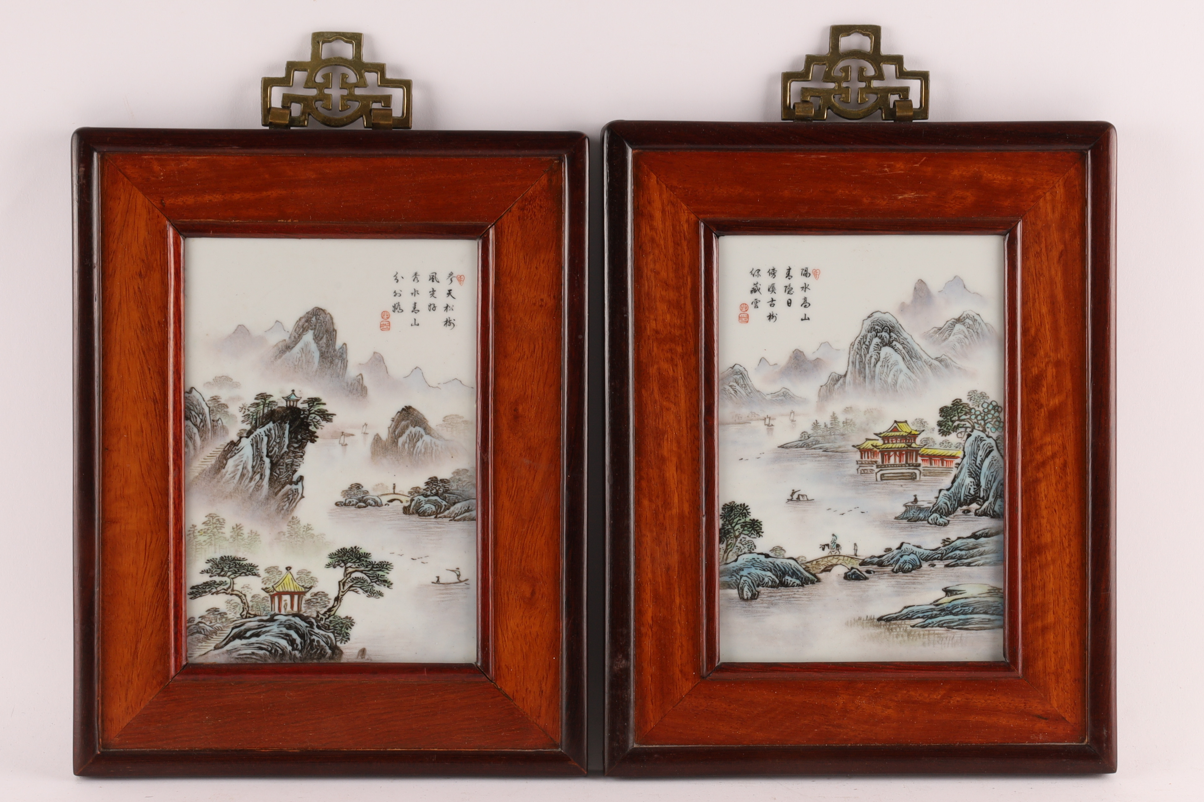 Finely painted porcelain plaques depicting misty scholar’s landscapes with pavilions, mountains, bridges, and boatmen. Each bears poetic inscriptions and artist seals. Presented in hardwood frames with brass hanging mounts.