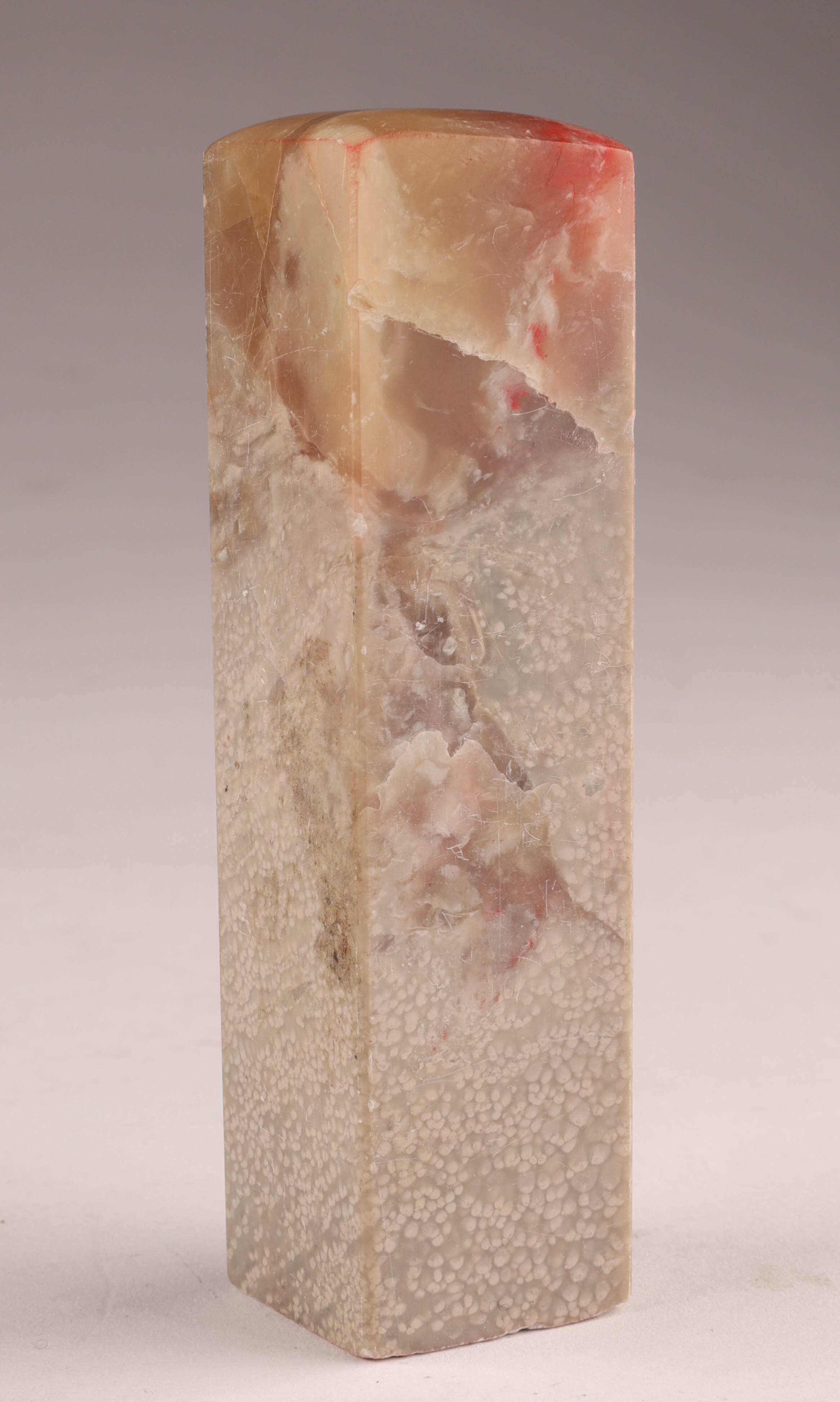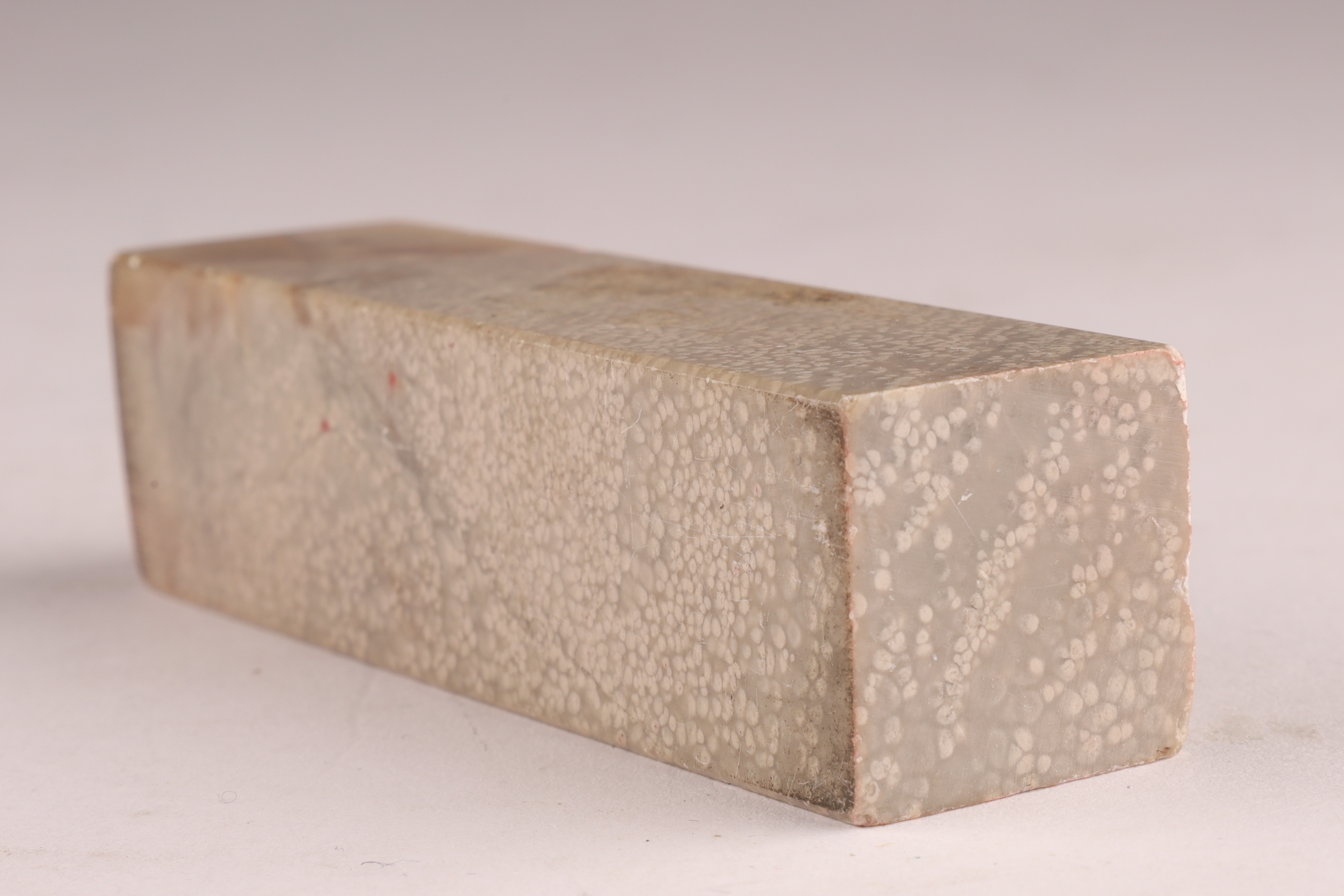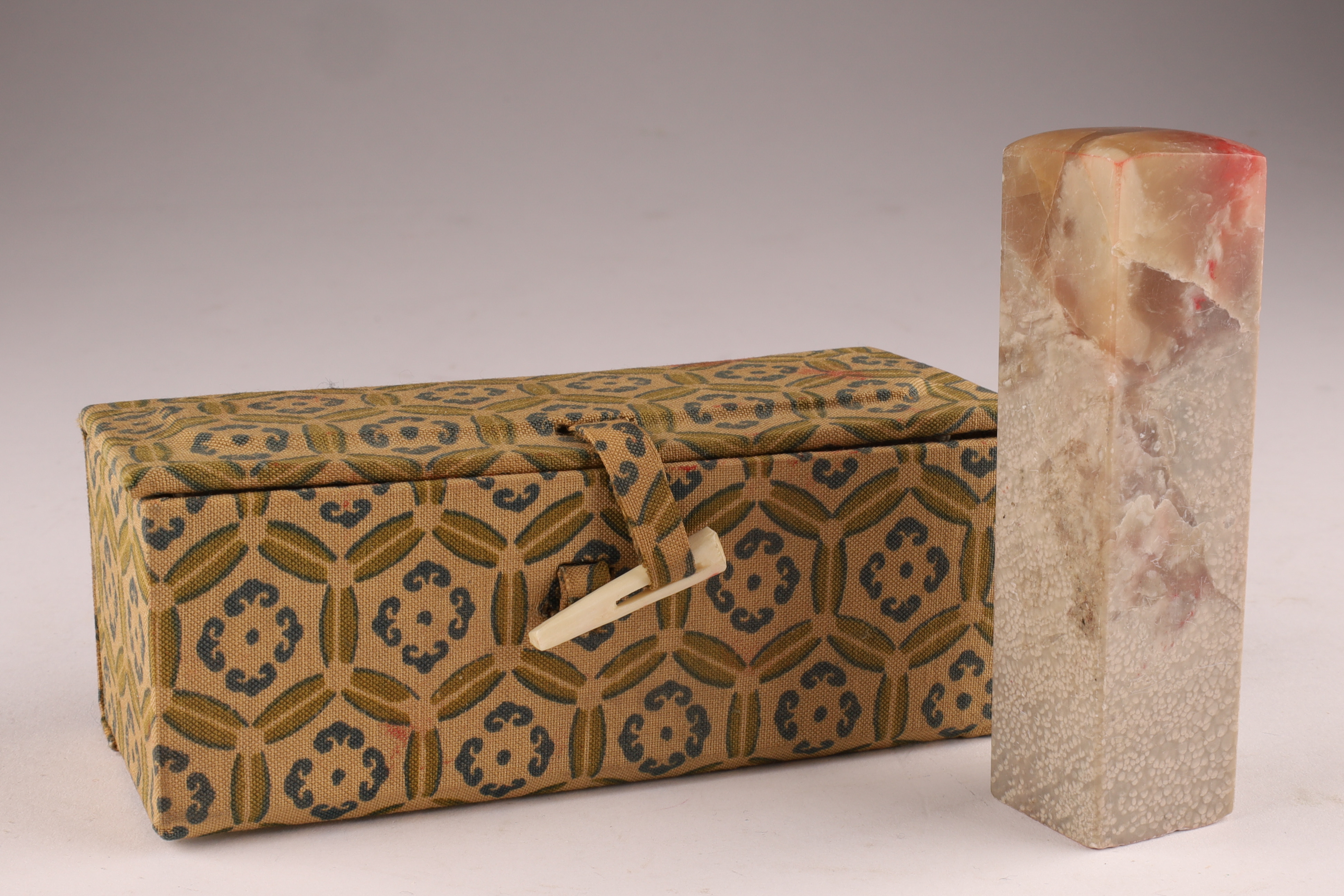 Mid-20th century carved soapstone seal blank, presented in its original patterned brocade case with red ink pad interior. Typical of traditional personal name chop sets. Approx. 3 inches H