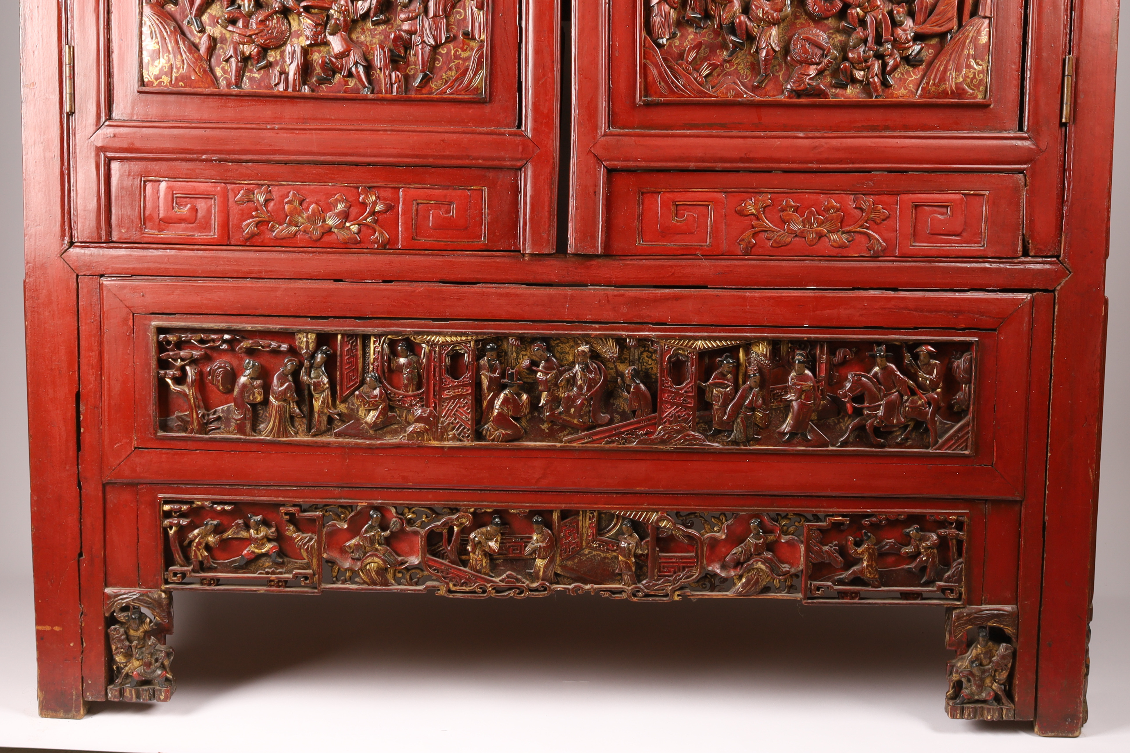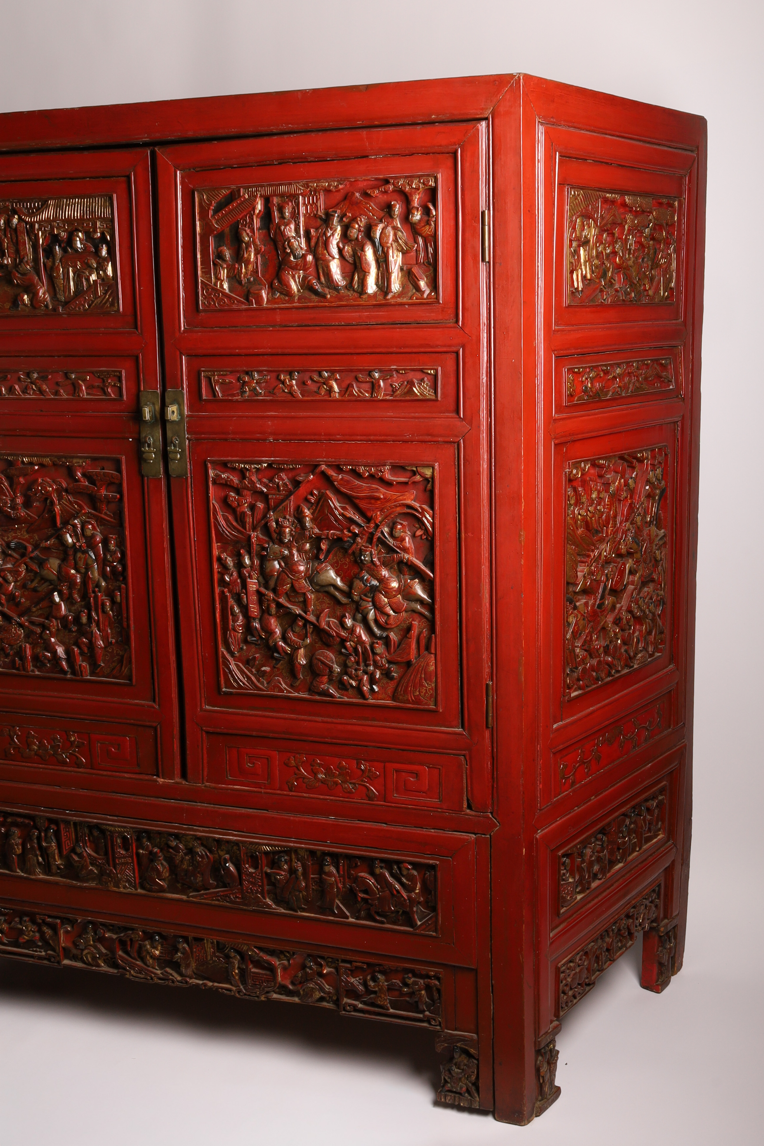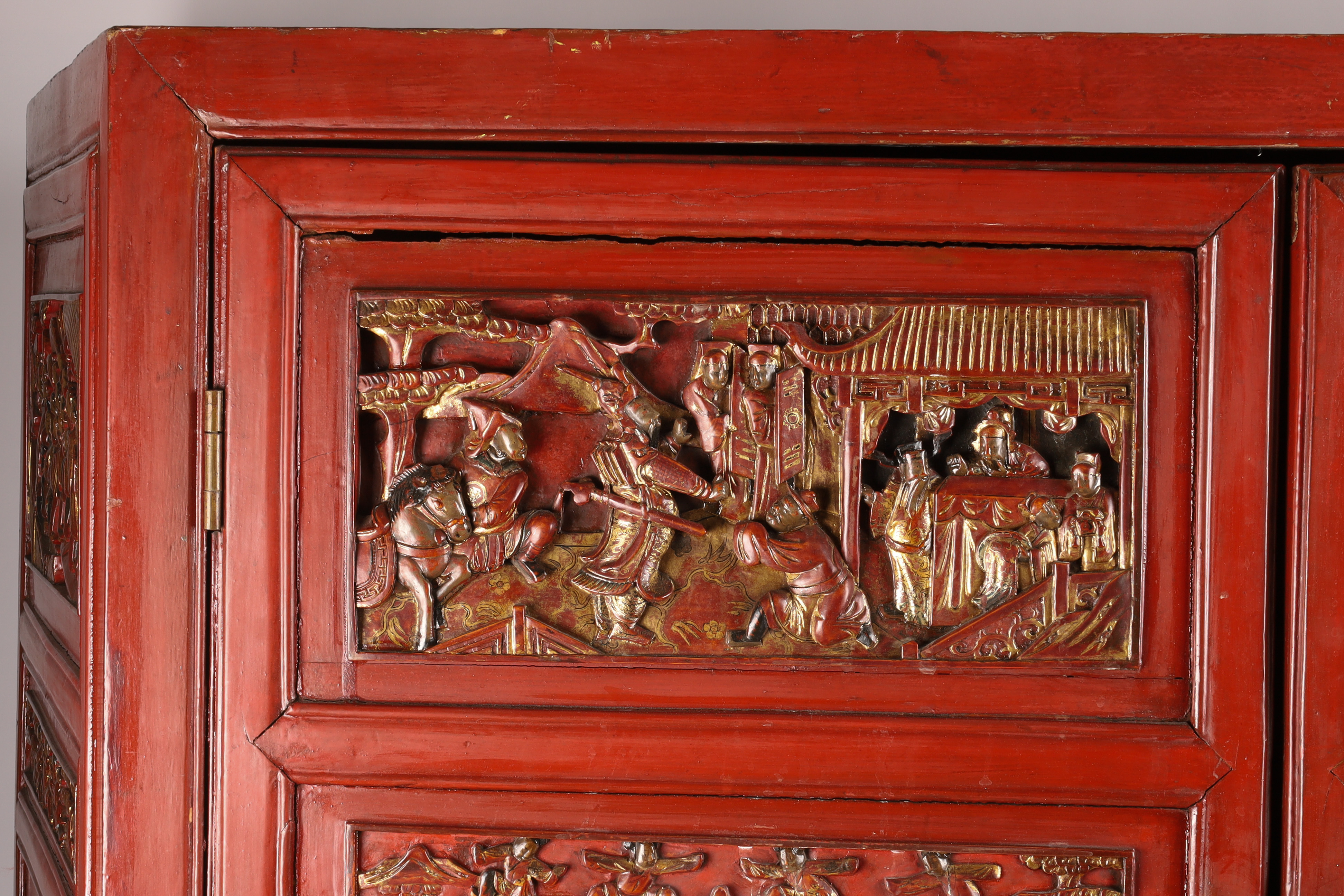A monumental and richly carved hardwood cabinet, its surfaces decorated with deep multi-figure relief panels depicting imperial court scenes, scholars, attendants, and dramatic battle tableaux reminiscent of Romance of the Three Kingdoms. The cabinet retains its original red lacquer with gilt highlights and features complex sculptural panels characteristic of high-quality Canton and Fujian workshop production of the period.