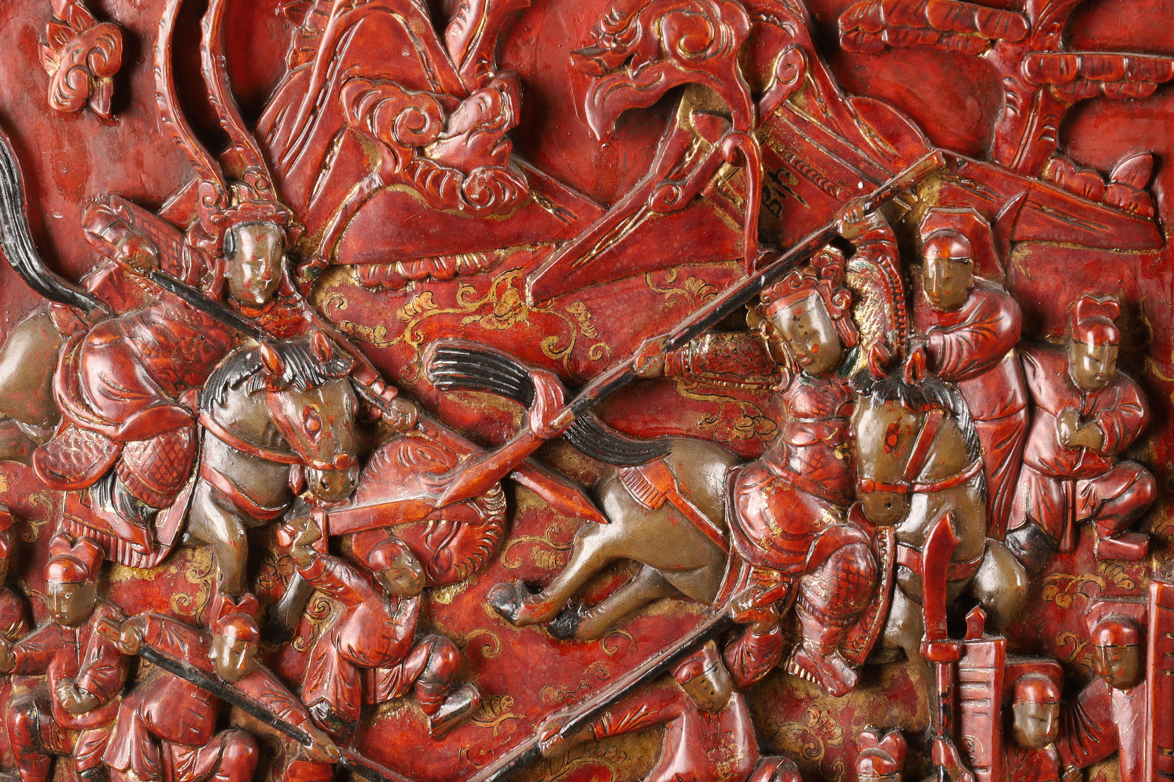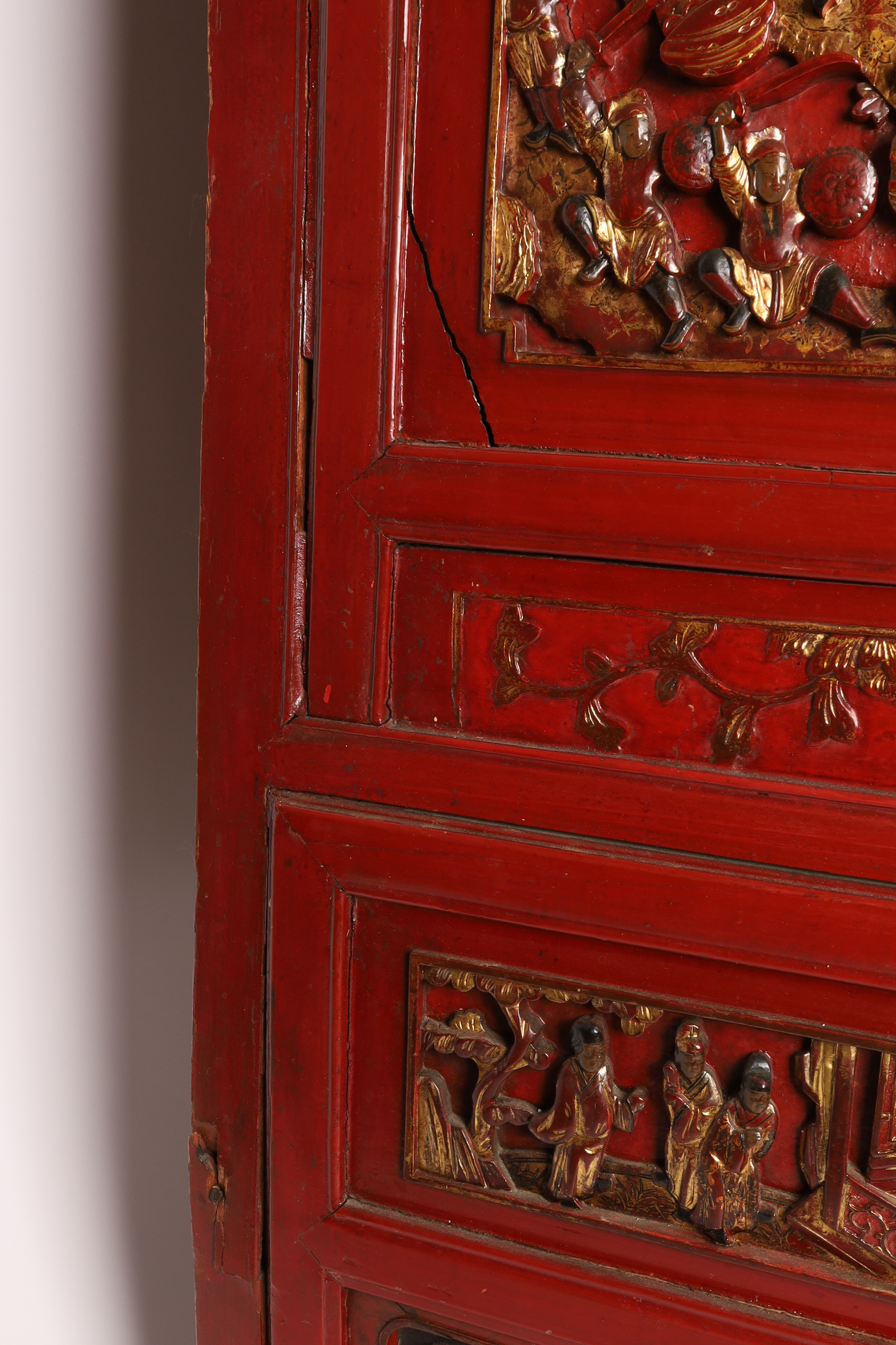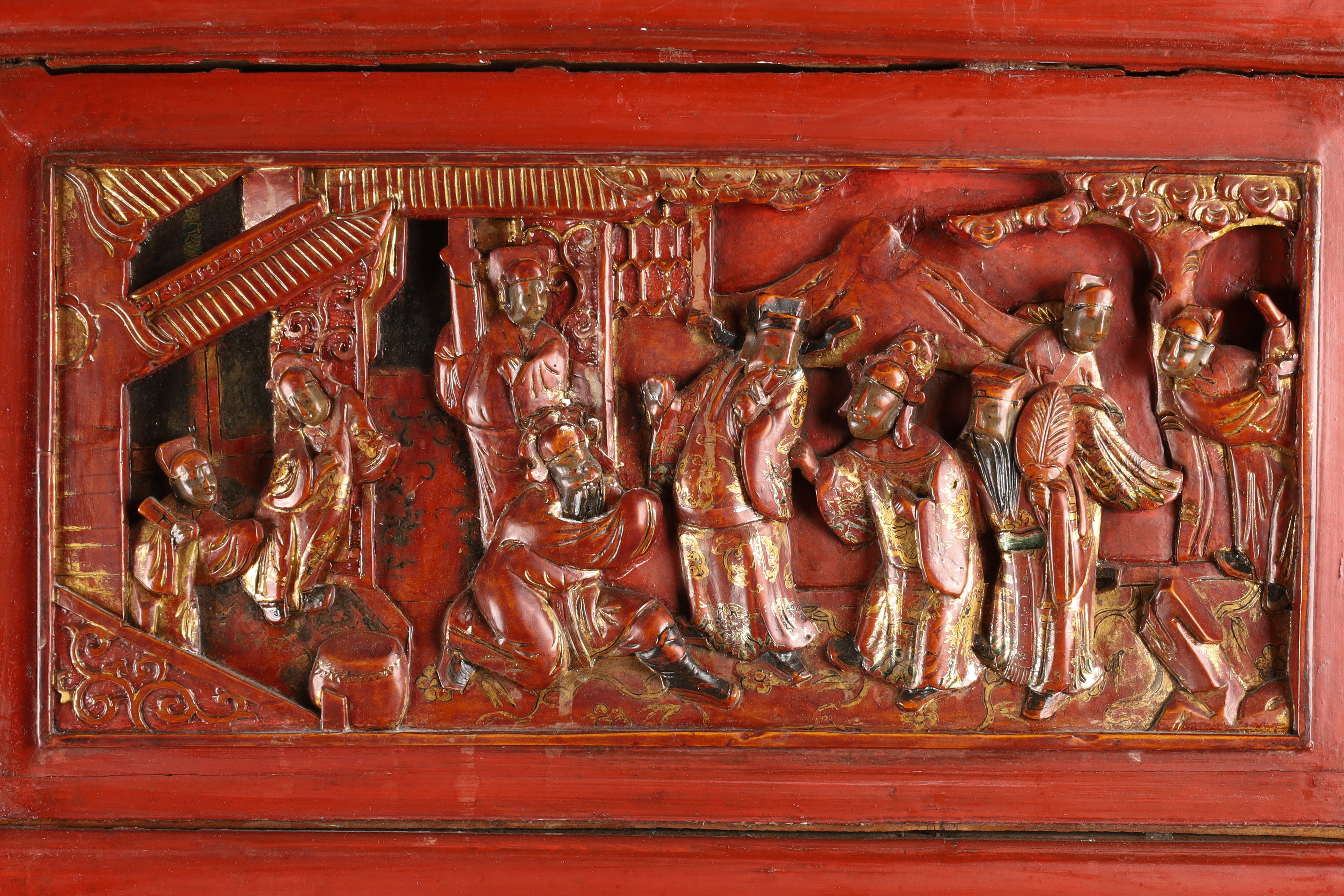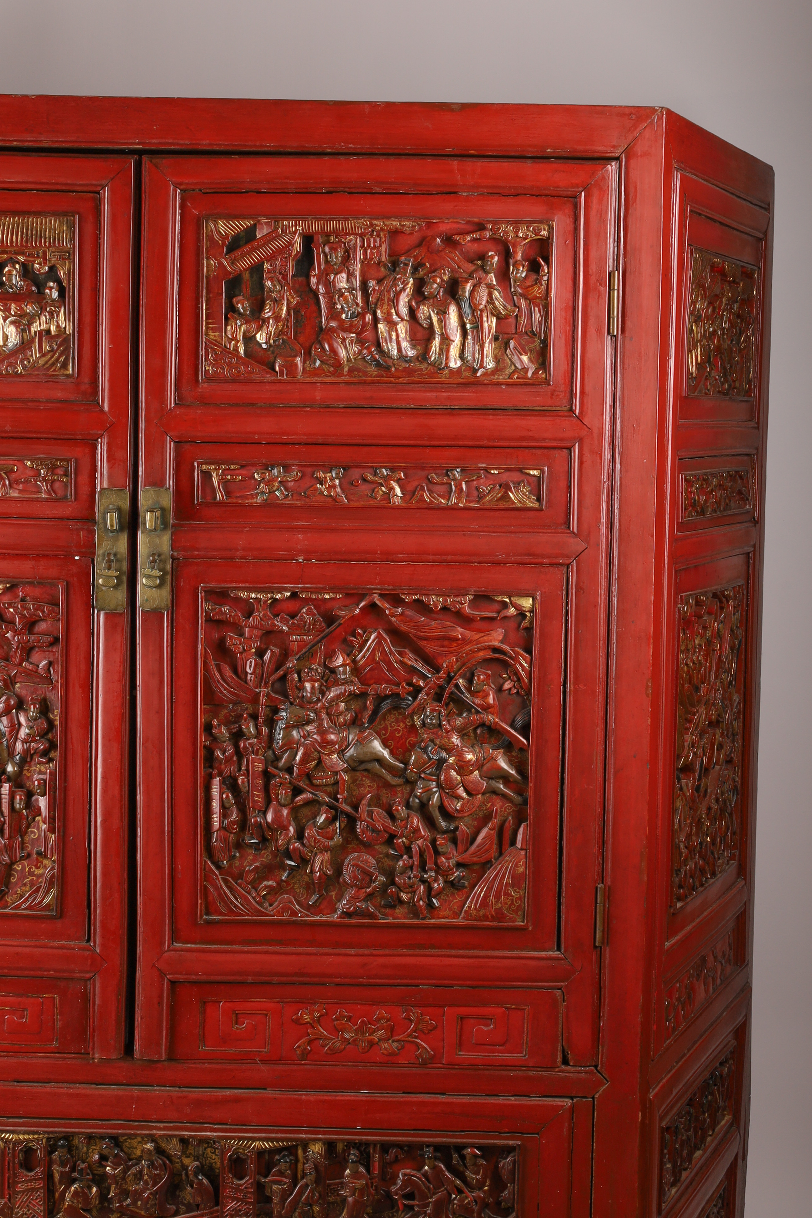 A monumental and richly carved hardwood cabinet, its surfaces decorated with deep multi-figure relief panels depicting imperial court scenes, scholars, attendants, and dramatic battle tableaux reminiscent of Romance of the Three Kingdoms. The cabinet retains its original red lacquer with gilt highlights and features complex sculptural panels characteristic of high-quality Canton and Fujian workshop production of the period.