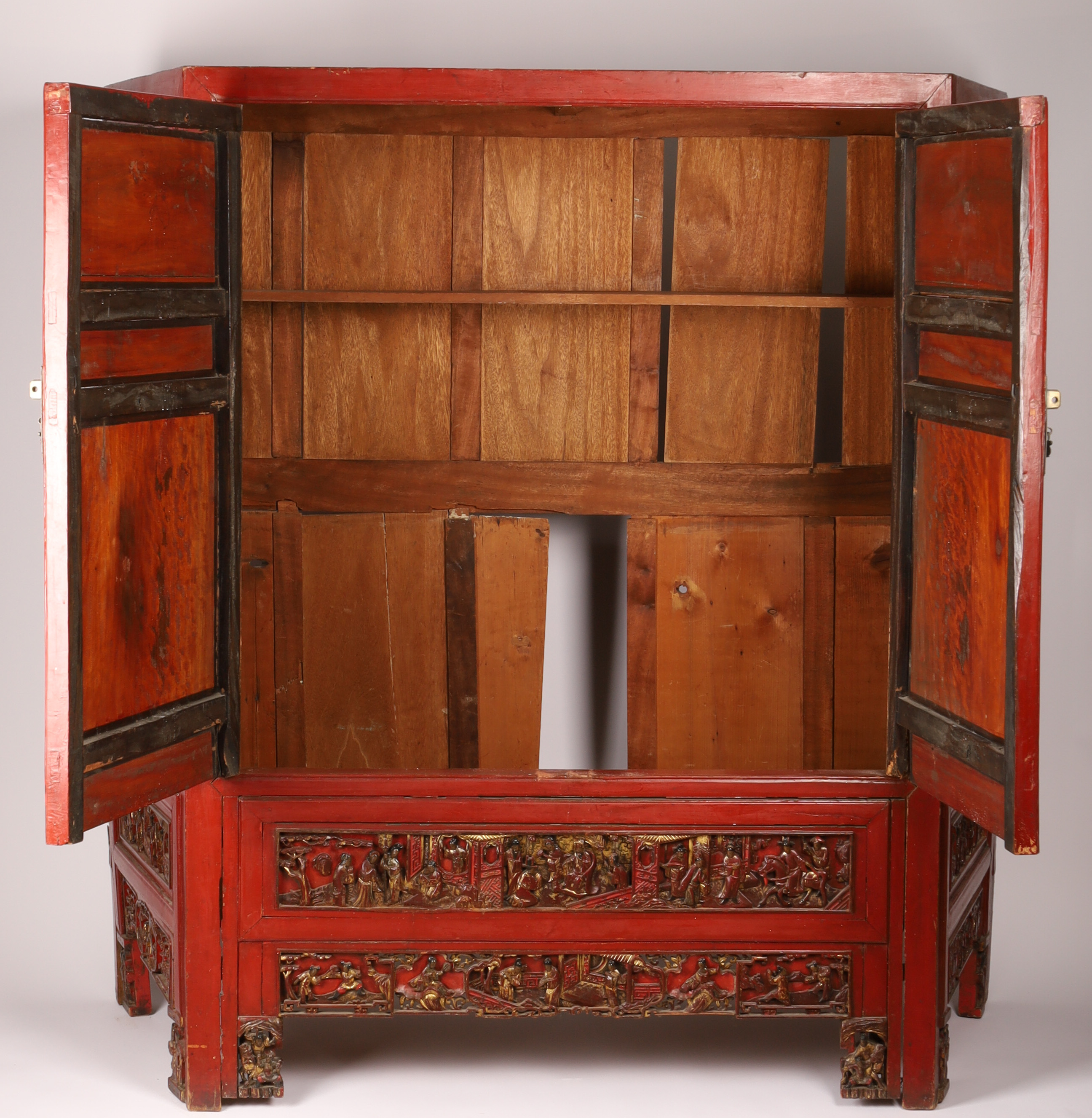 Large Antique Chinese Qing Carved Red Lacquer Wedding / Temple Cabinet, Unusually Shaped