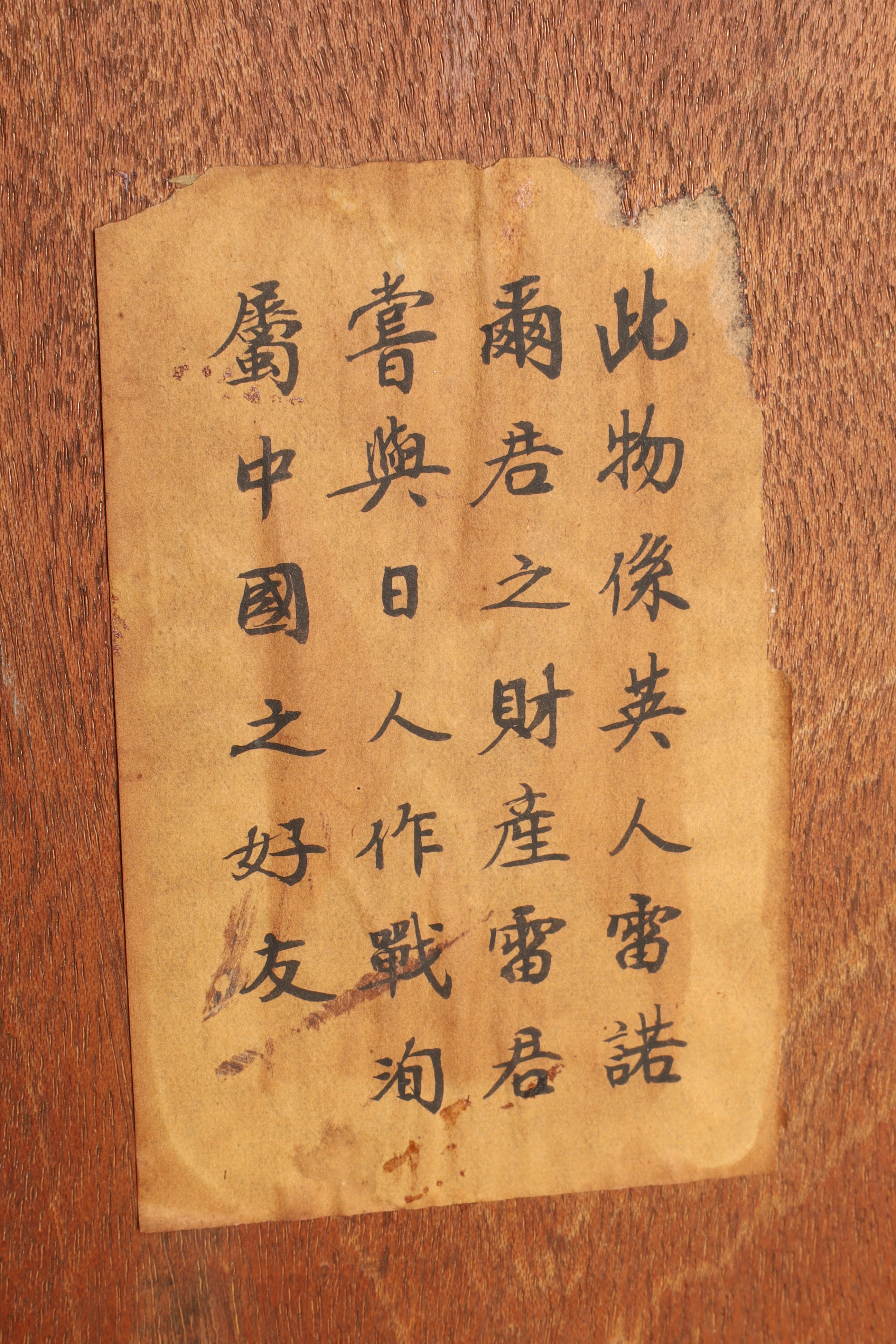 The reverse bears a highly unusual and historically important wartime protective label, handwritten in traditional Chinese characters, reading: