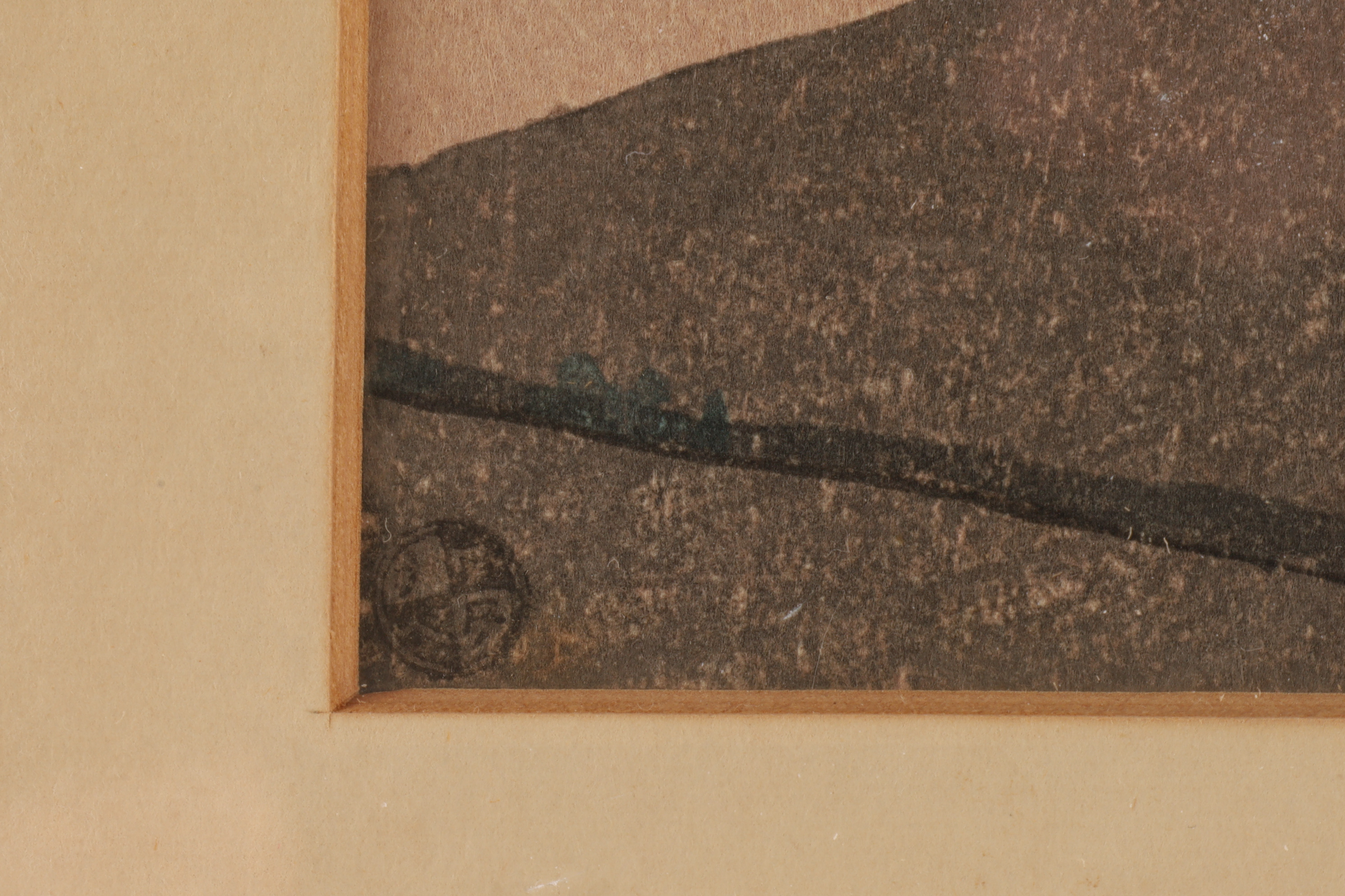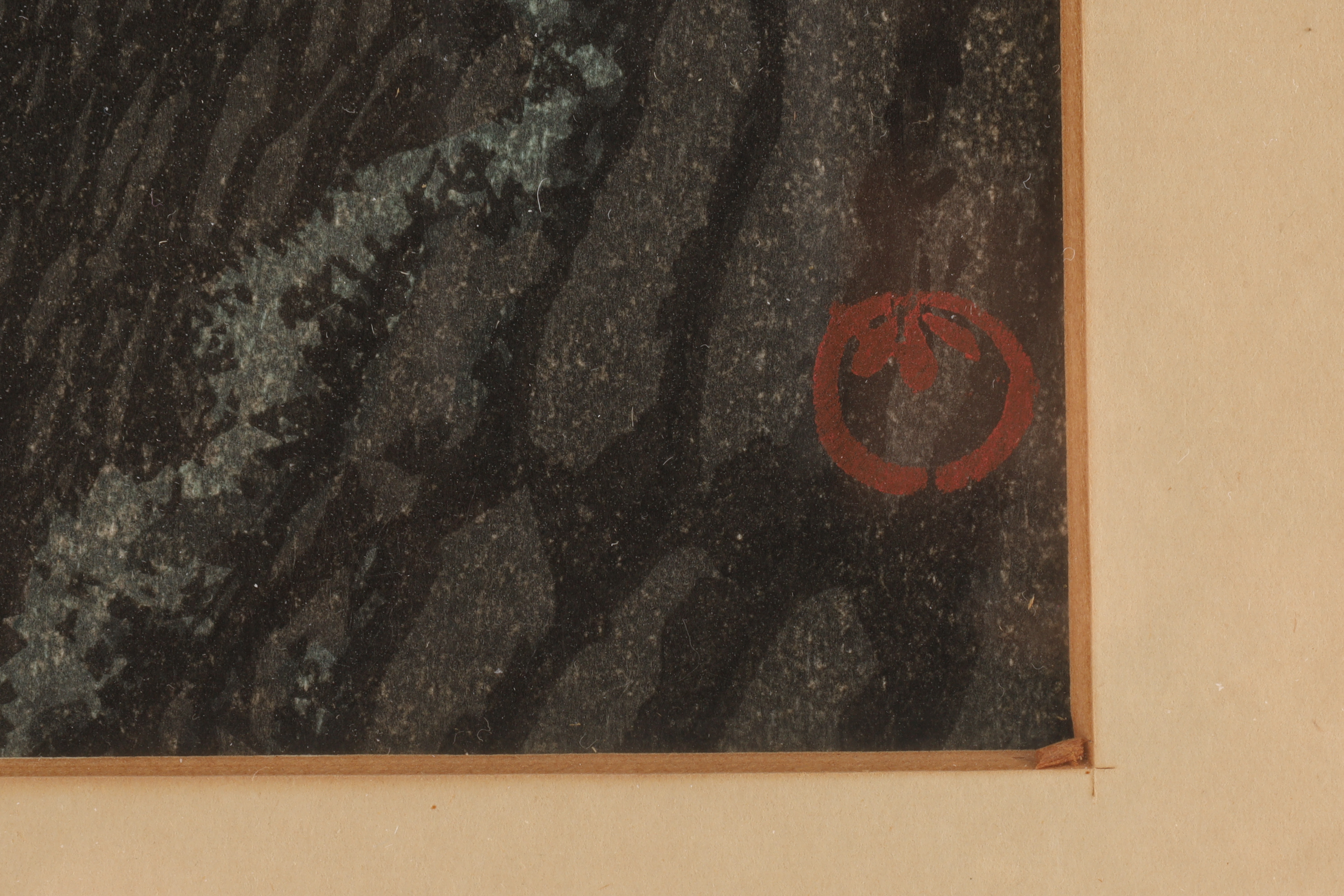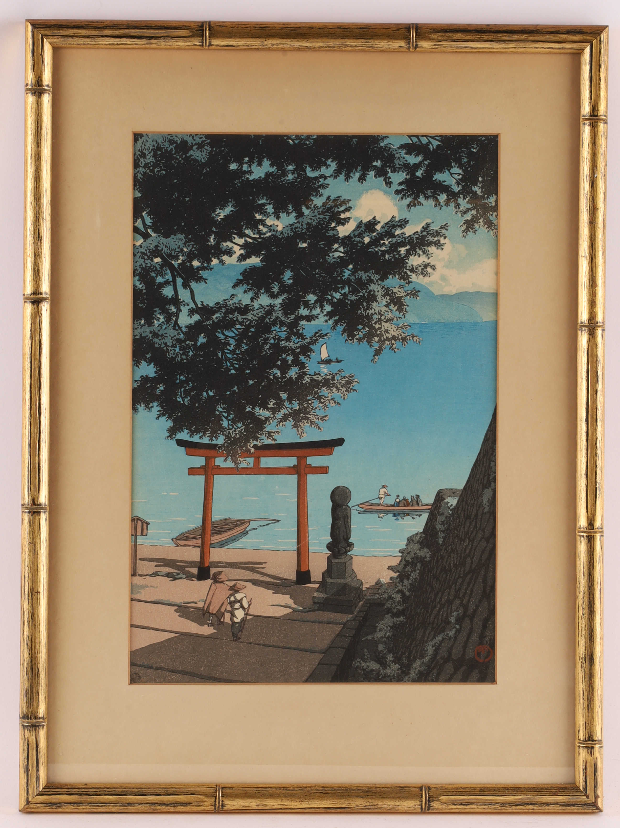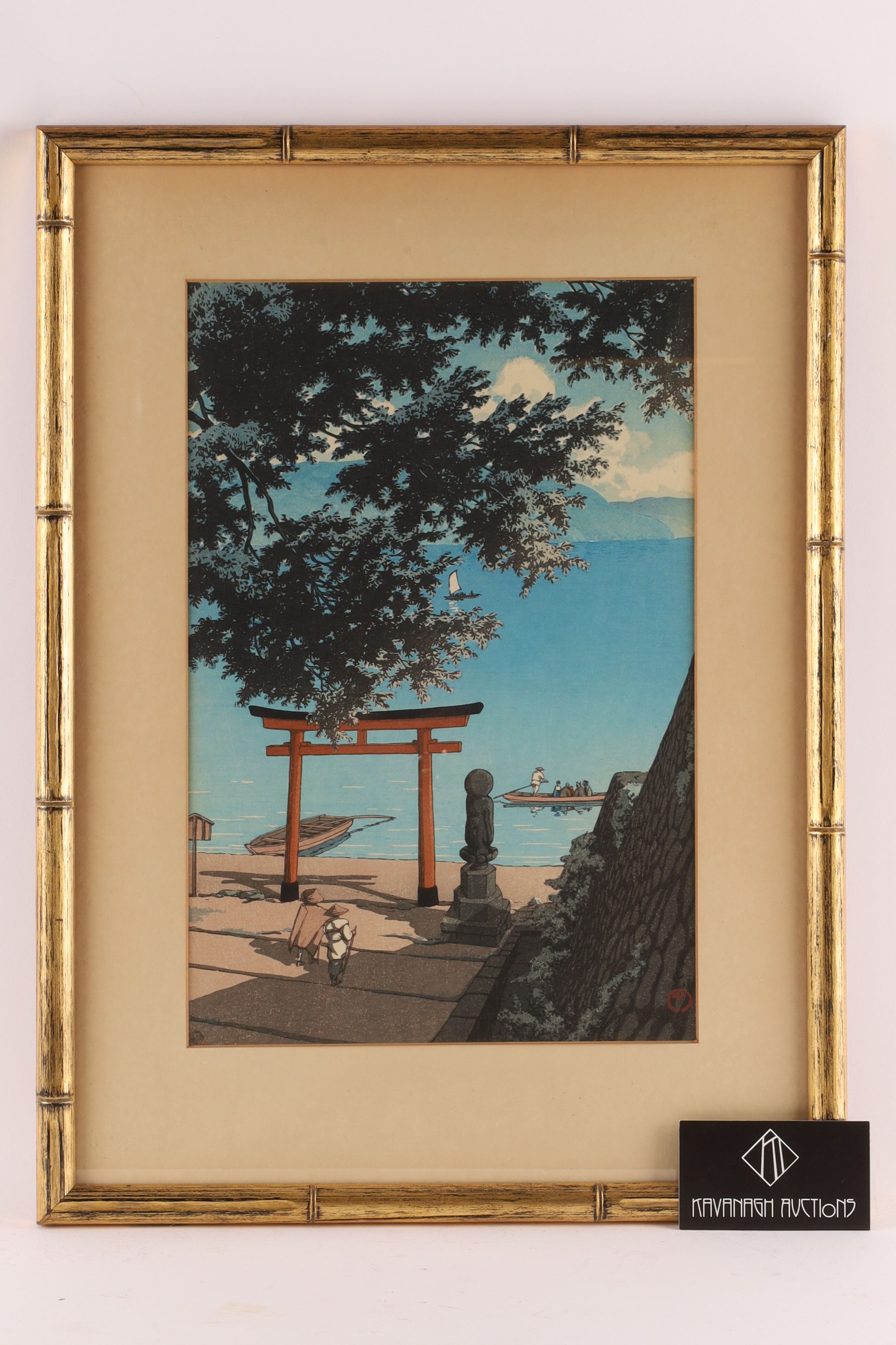 Antique Japanese Woodblock Print Kawase Hasui (1883-1957), Chuzenji Temple in Utagahama. Image measures 14 inches H x 9.5 W, frame measures 20 inches x 15.