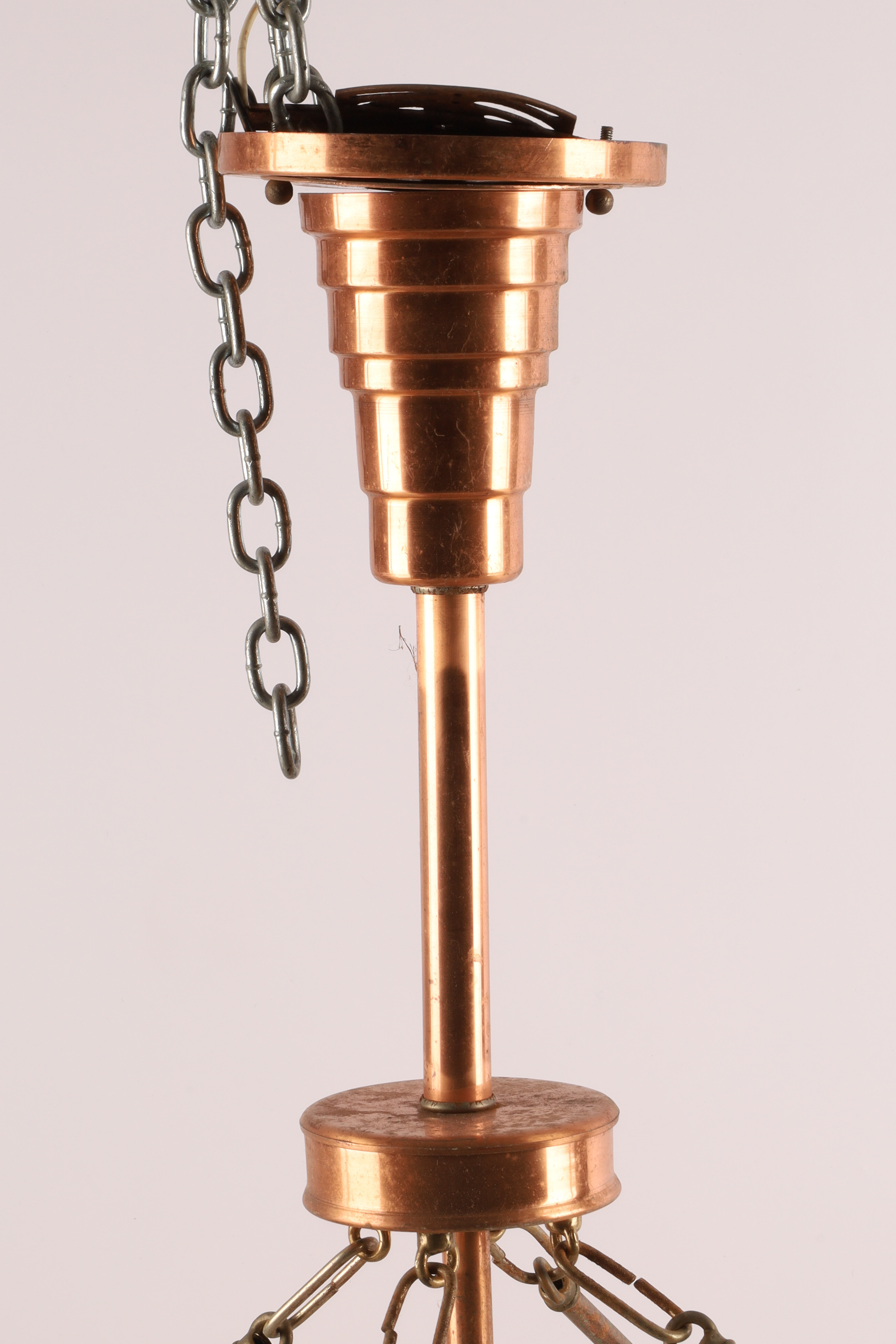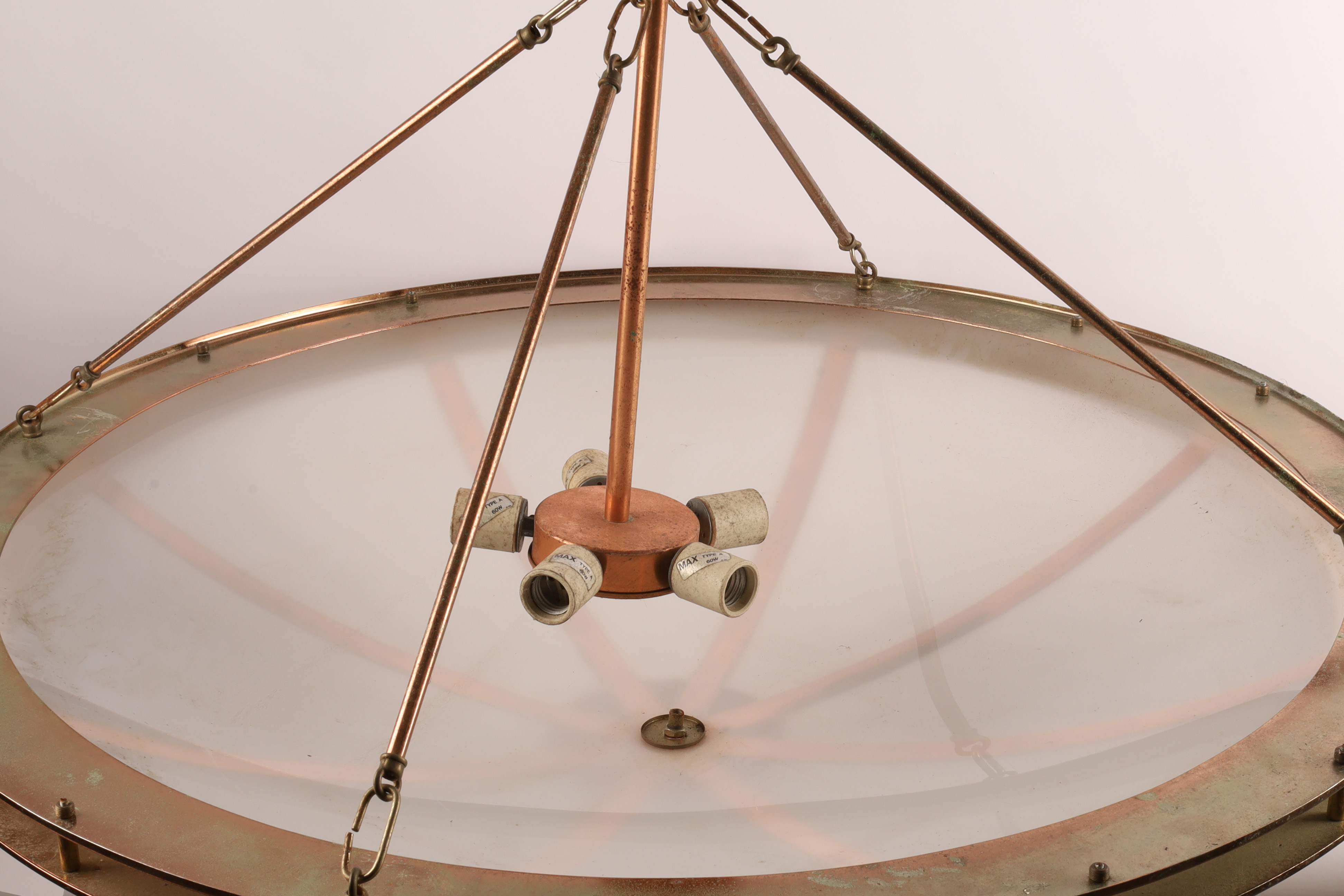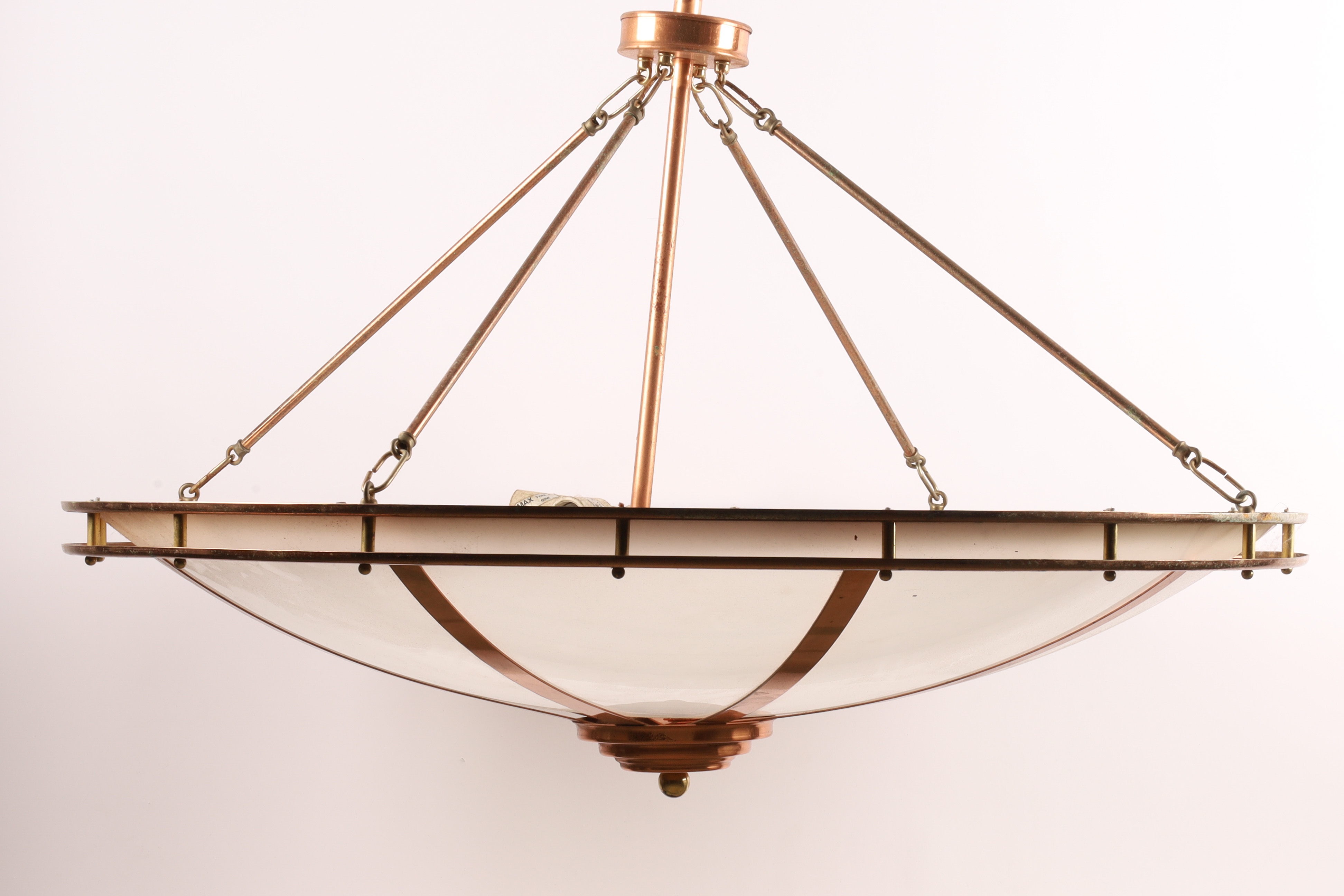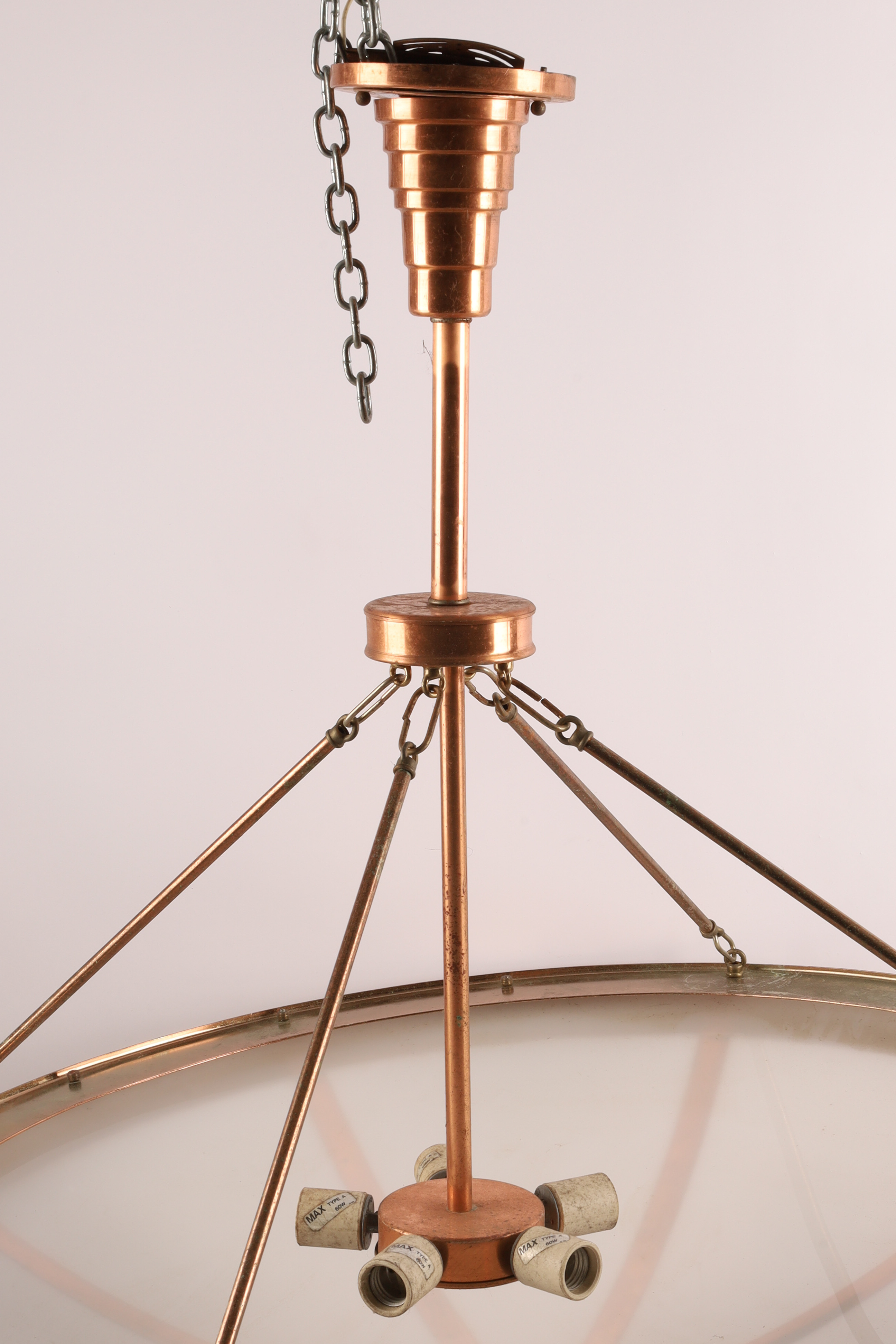 Large and Impressive Art Deco Style Copper Ceiling Light Fixture Chandelier with Frosted Moulded Plastic Shade. Hanging from four arms leading to a stepped copper fitting. 40 inches W x approximately 36 H.