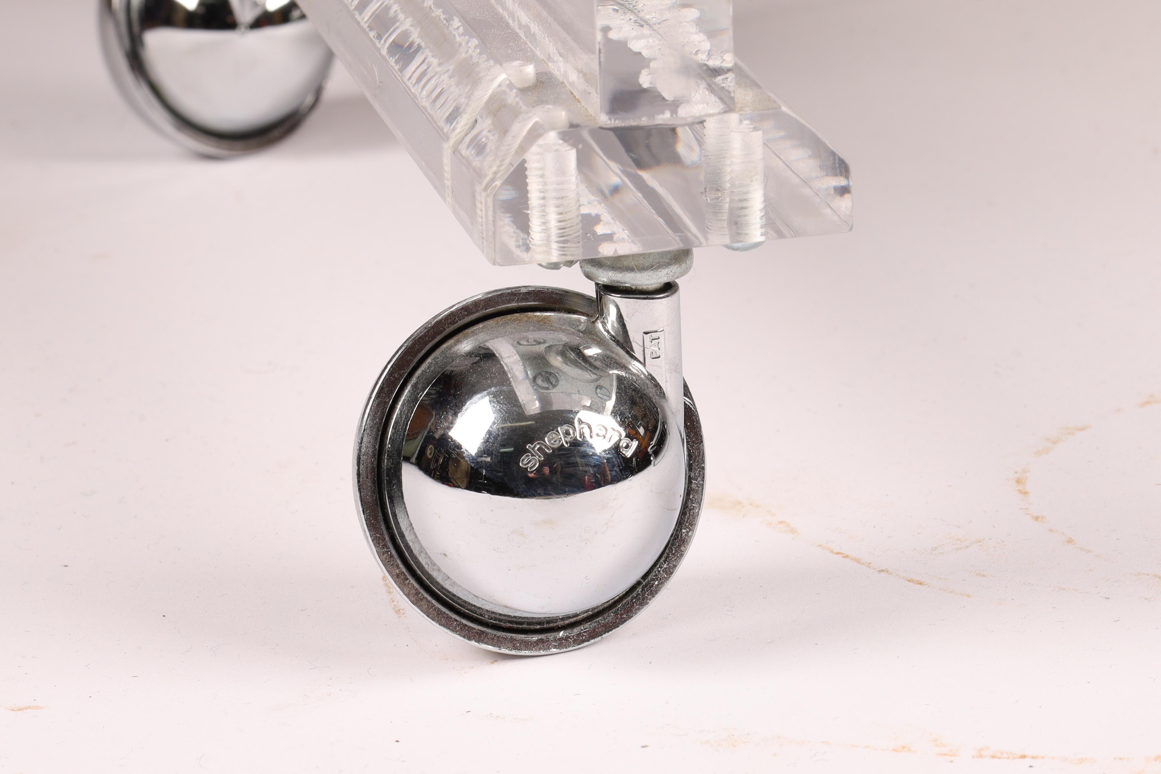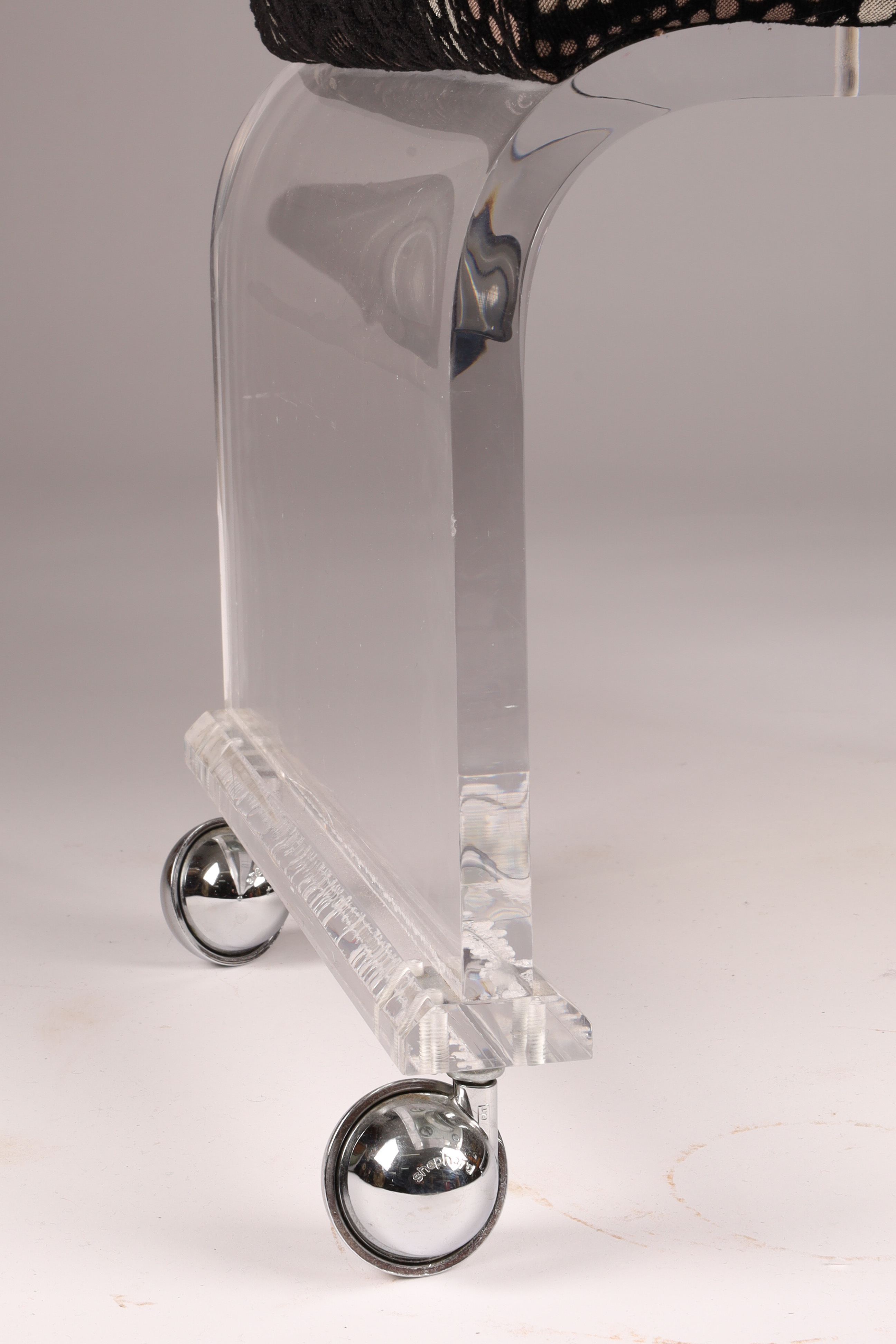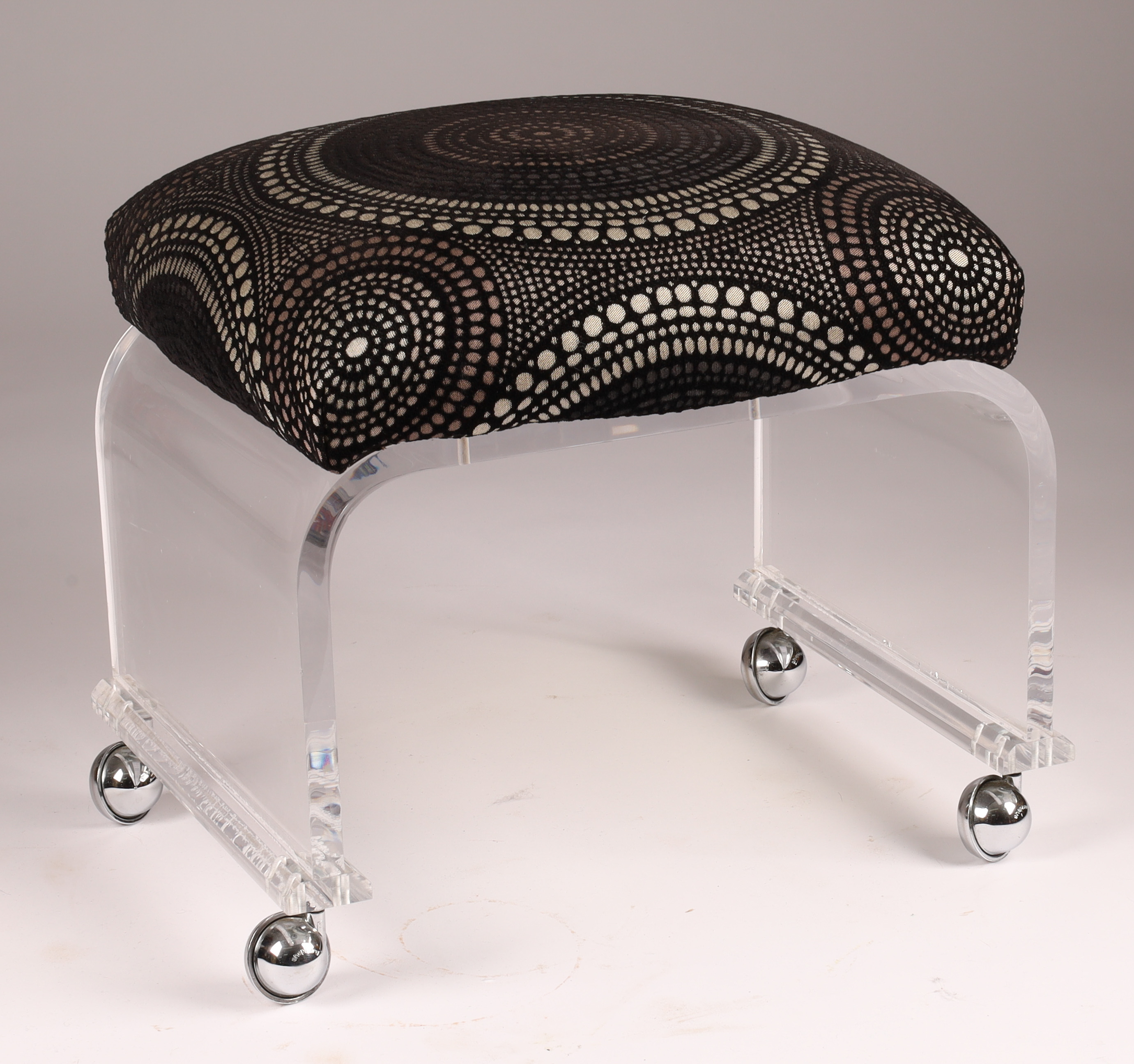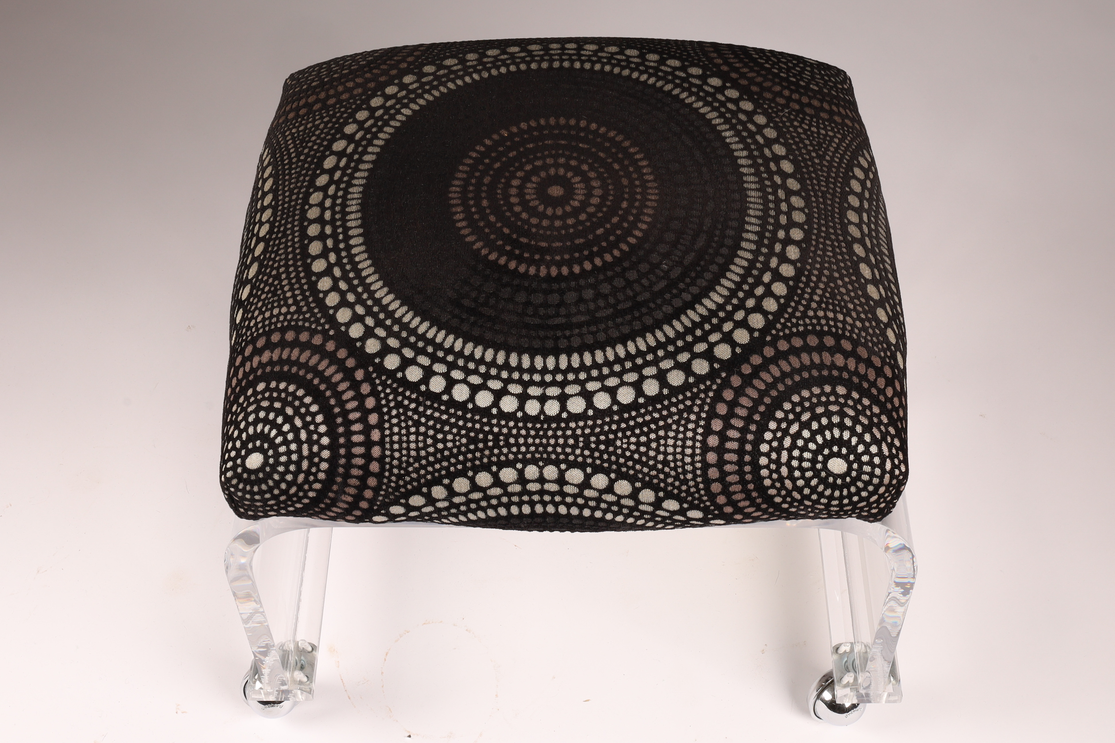 Lucite Stool with Patterned Upholstery Modern lucite stool with transparent legs and wheels, upholstered in circular patterned navy and white fabric. Measuring 16 inches H x 17 W x 15 deep.