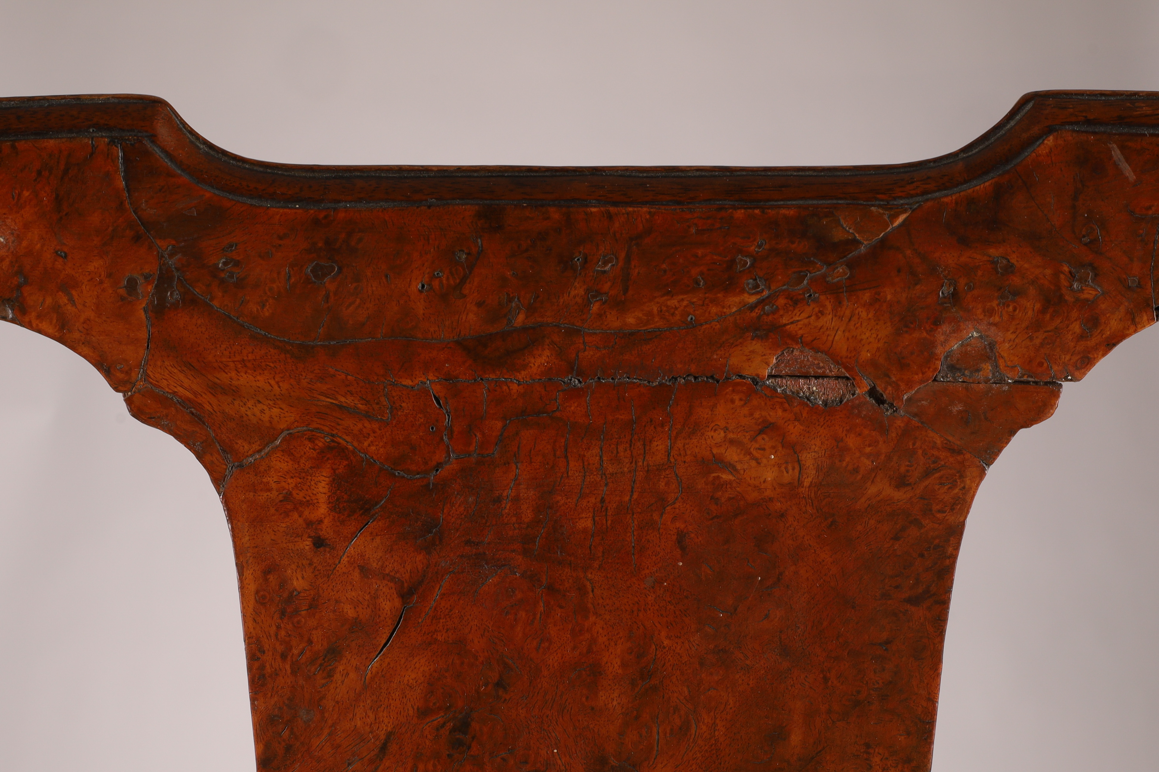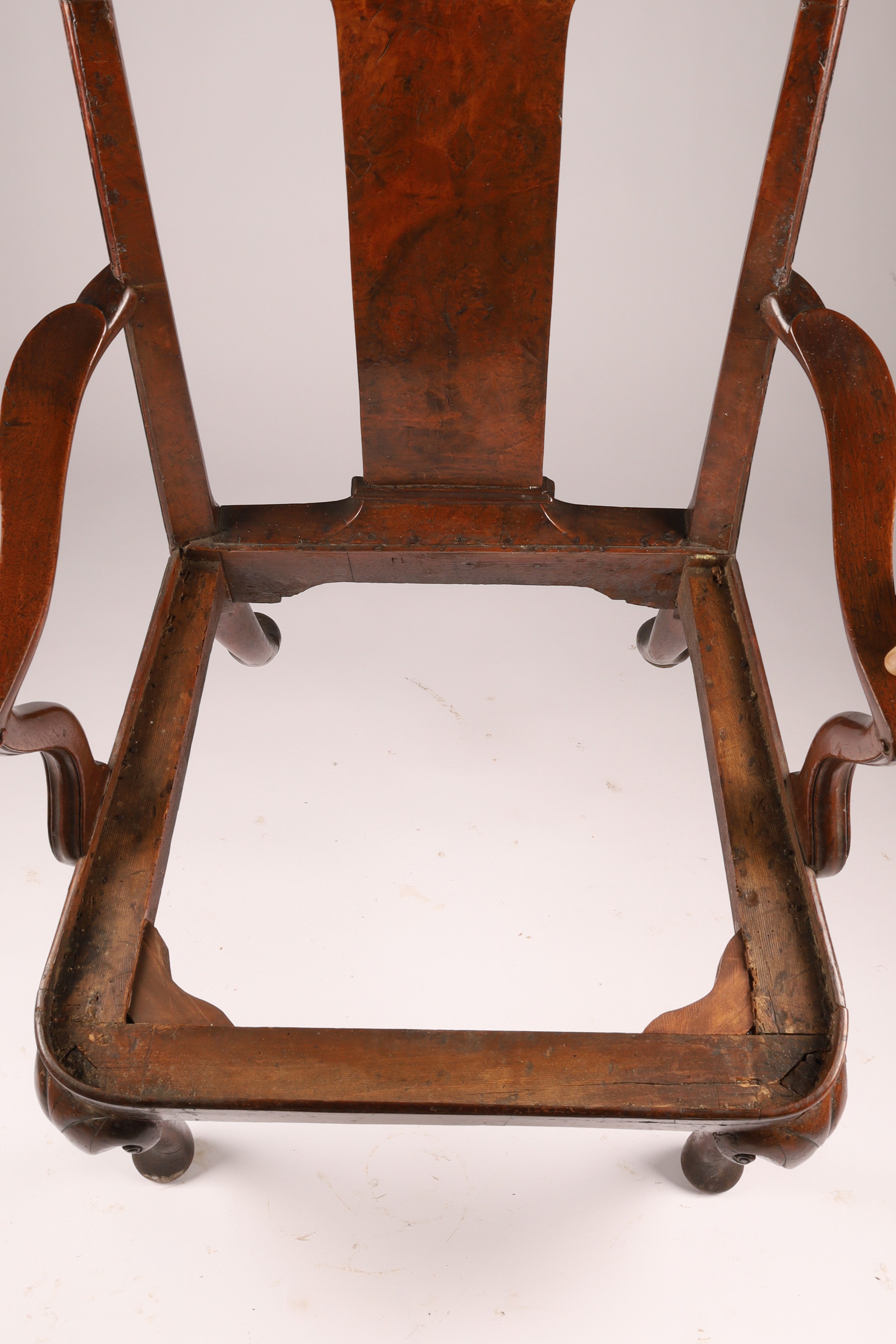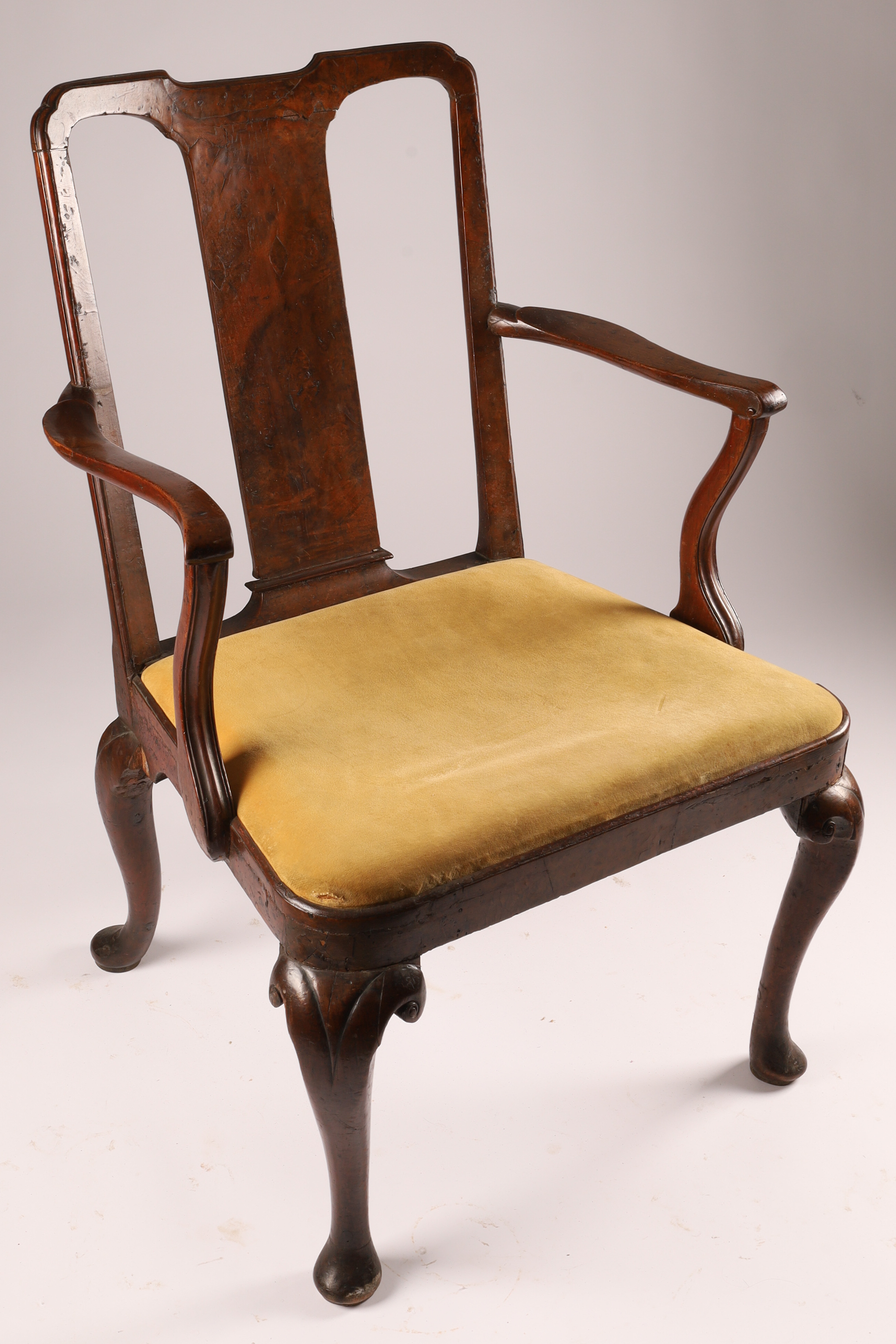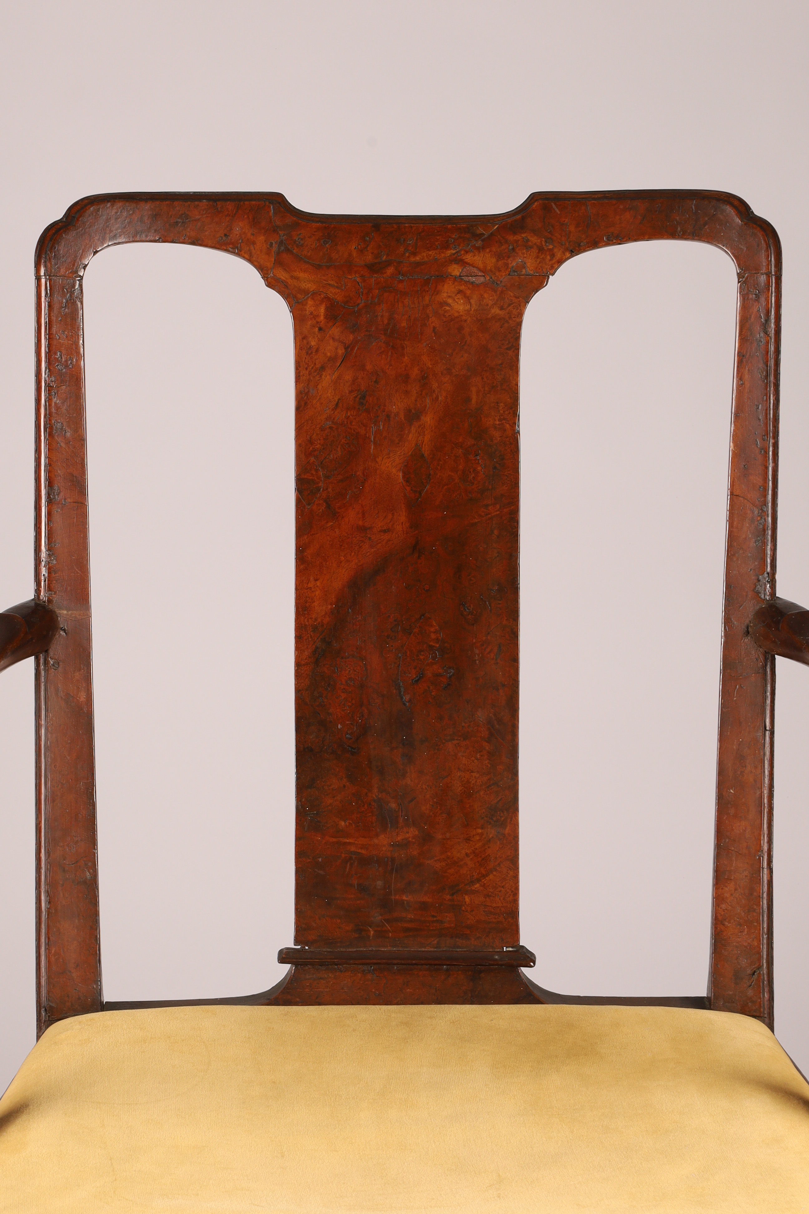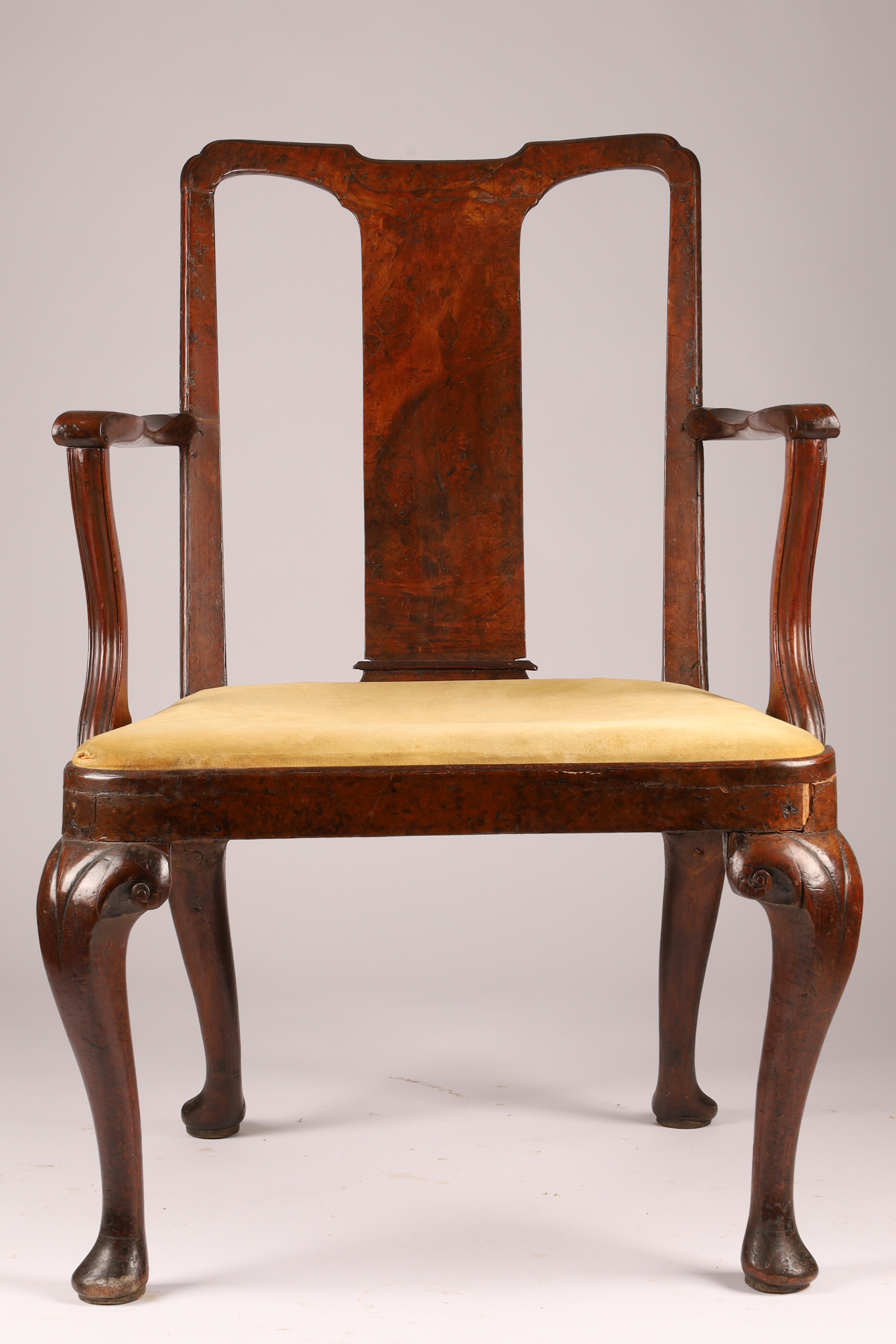 George II Burr Walnut and Mahogany Arm Chair with drop seat and some loss to back leg and restored. Some loss to veneer on backrest and skirt. 37.5 inches H x 26 W x 19 inches deep, seat height 18 inches.