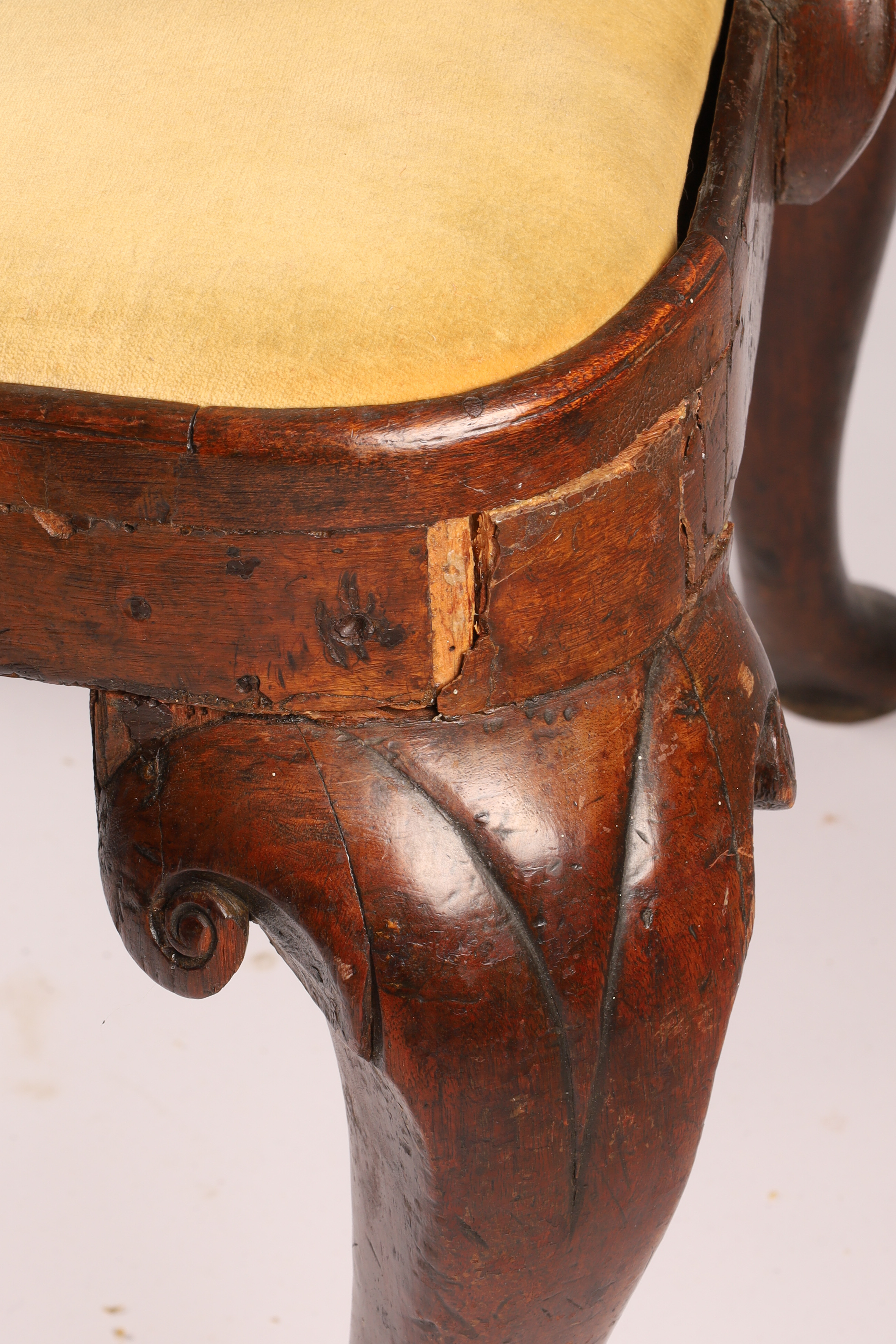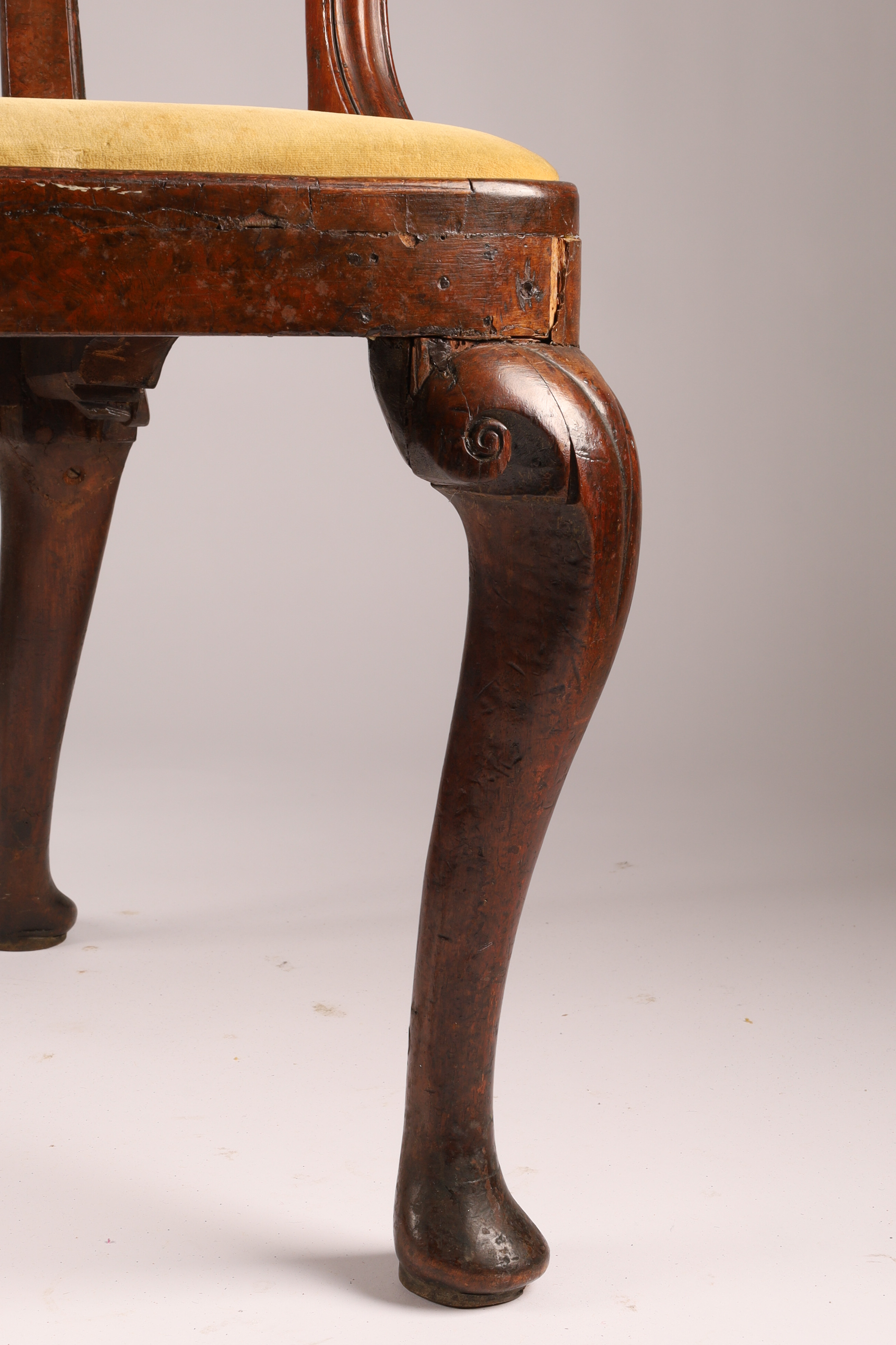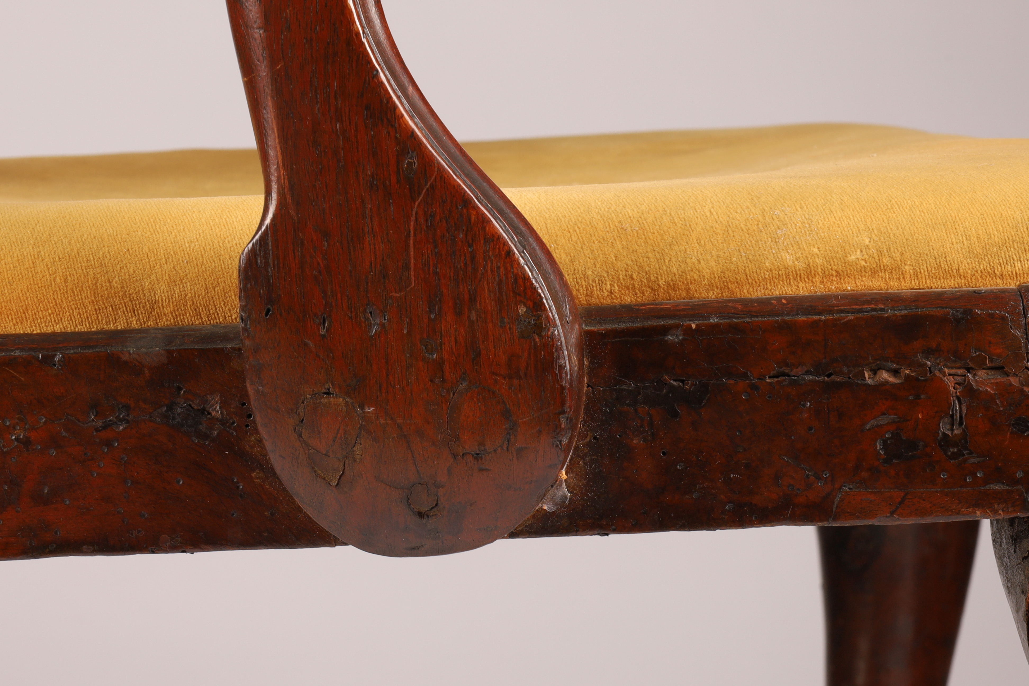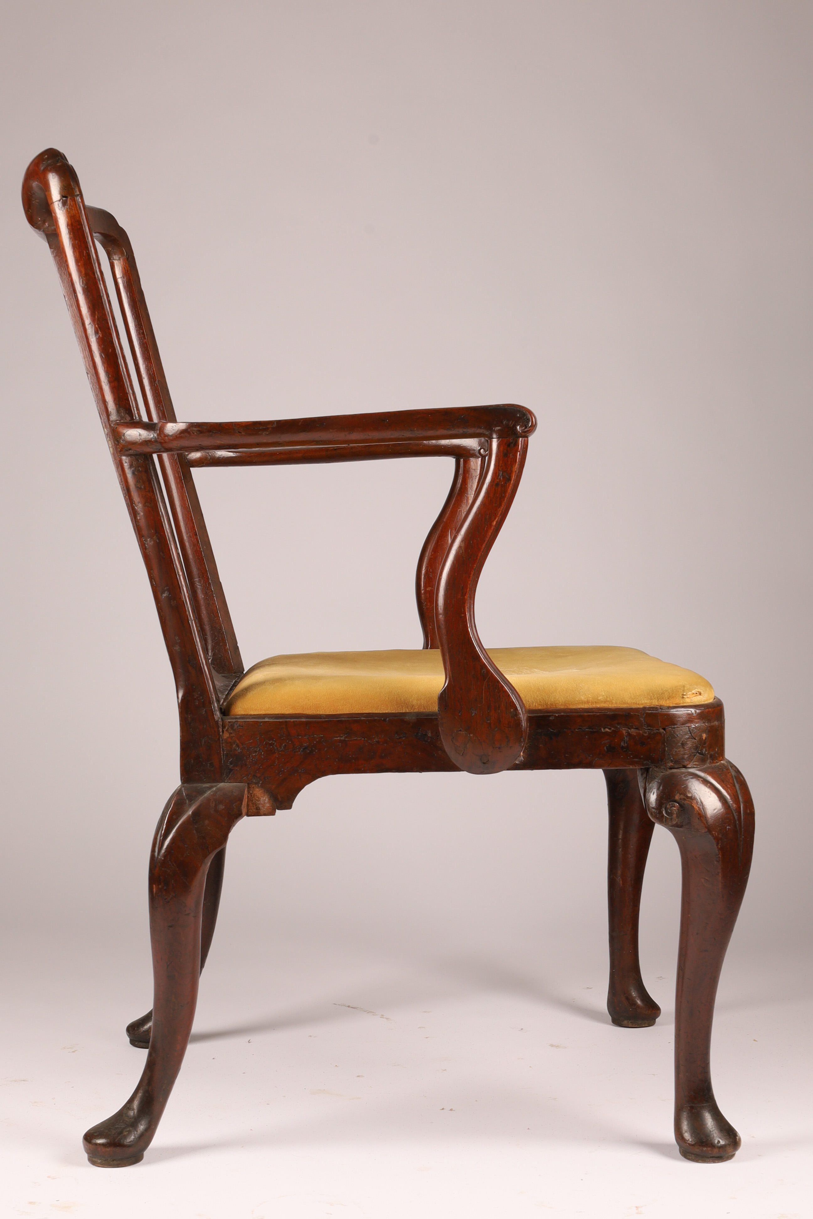 George II Burr Walnut and Mahogany Arm Chair with drop seat and some loss to back leg and restored. Some loss to veneer on backrest and skirt. 37.5 inches H x 26 W x 19 inches deep, seat height 18 inches.