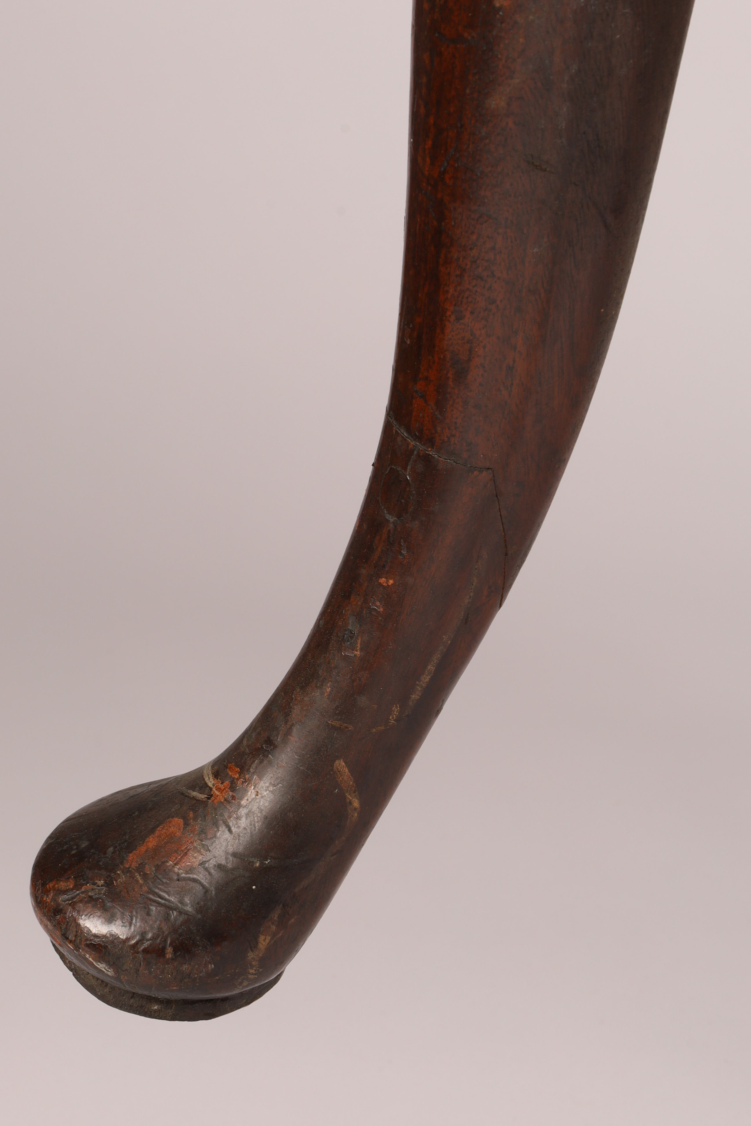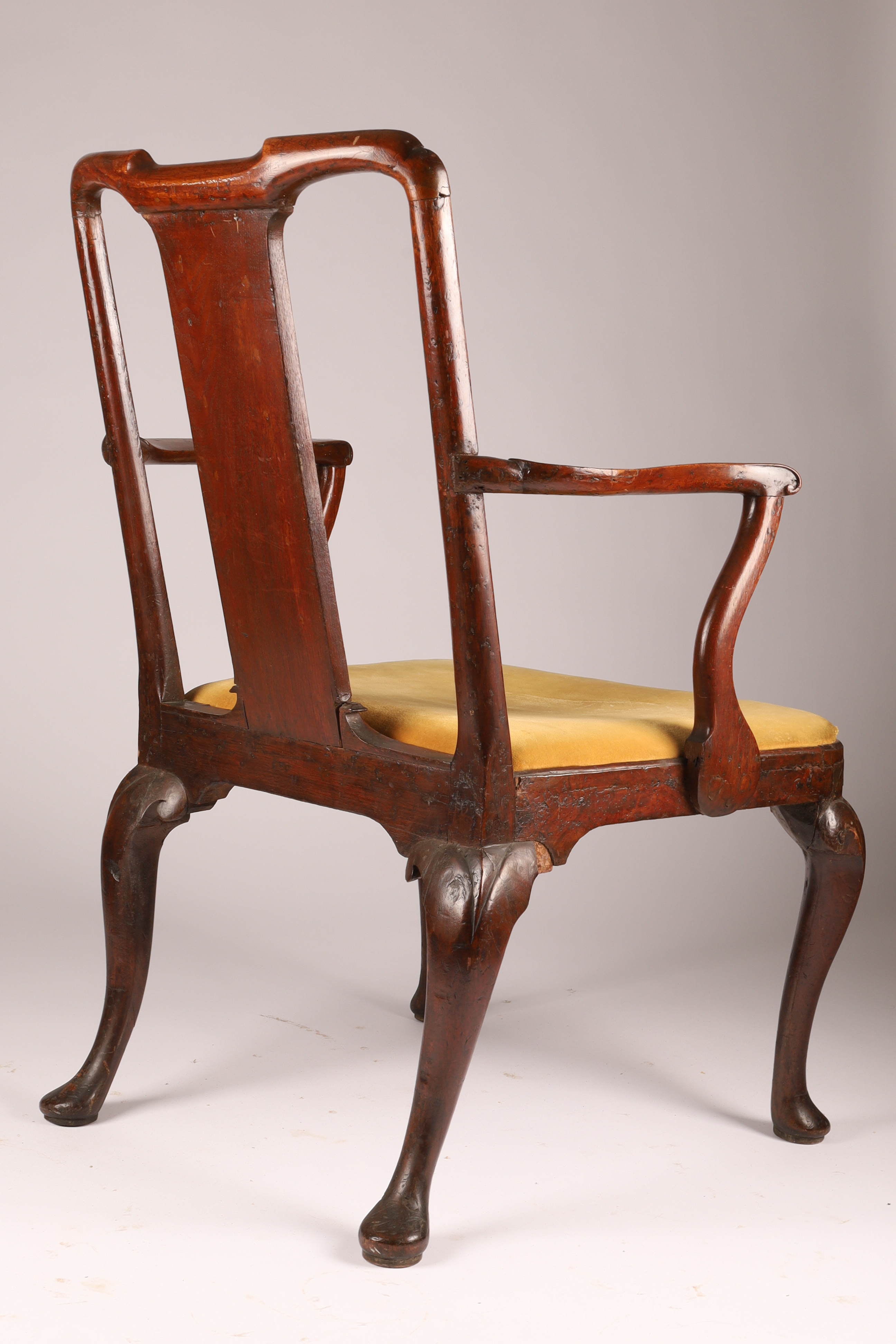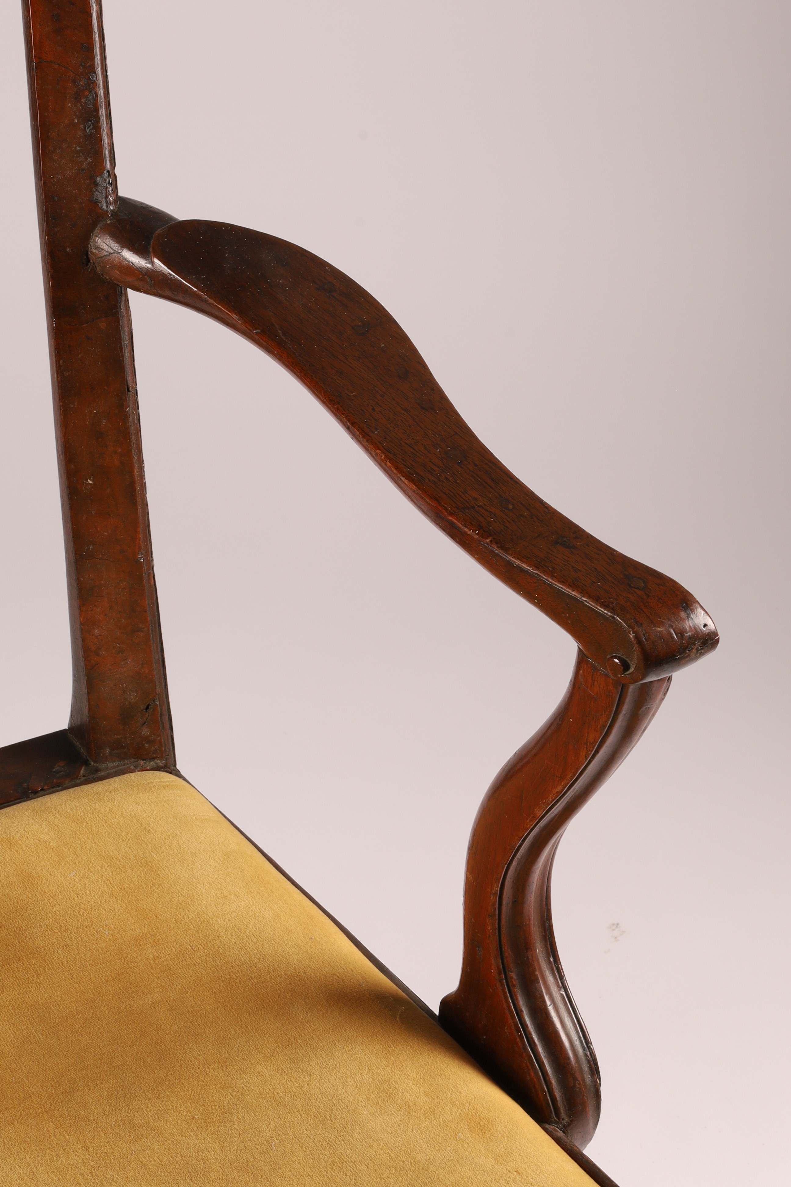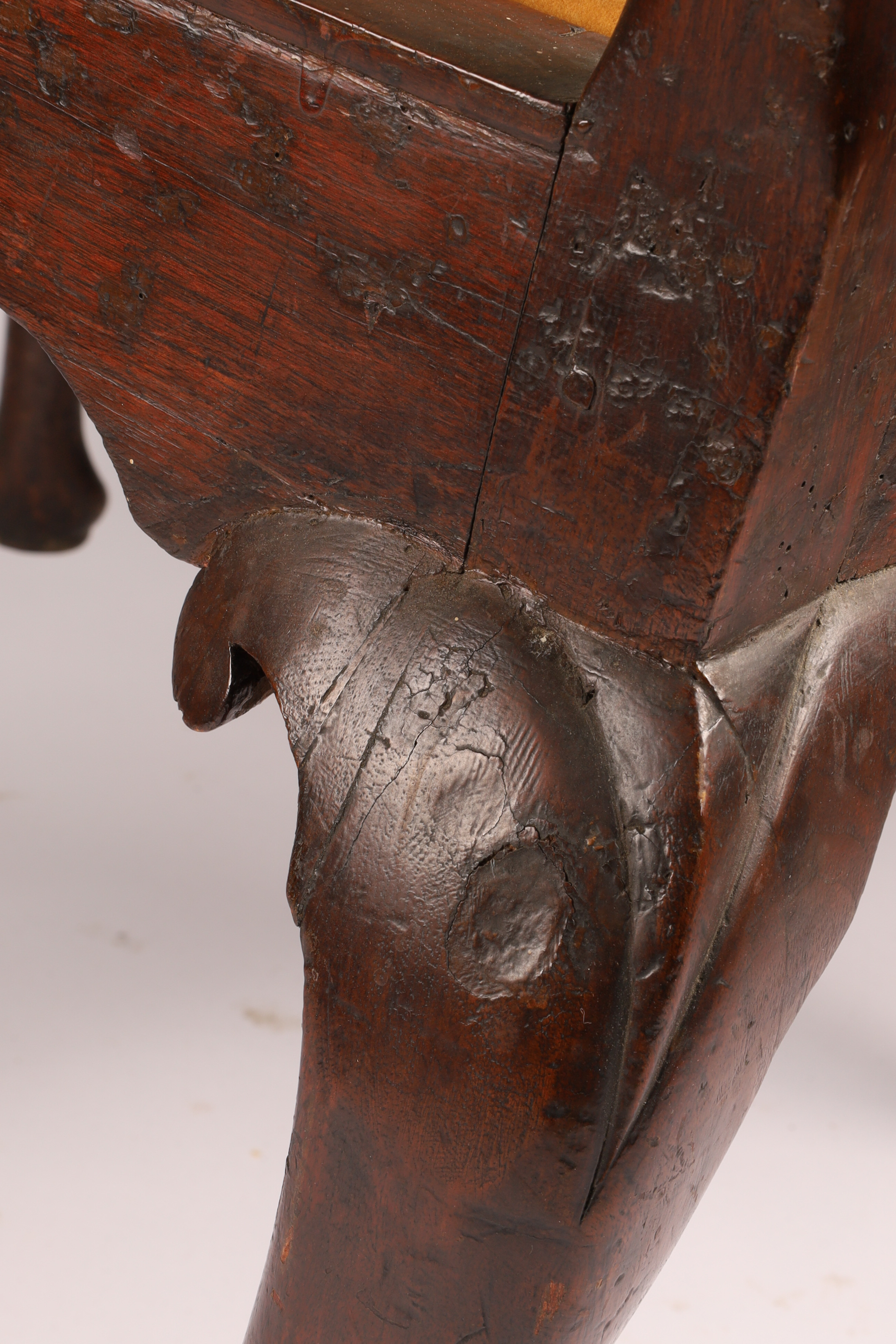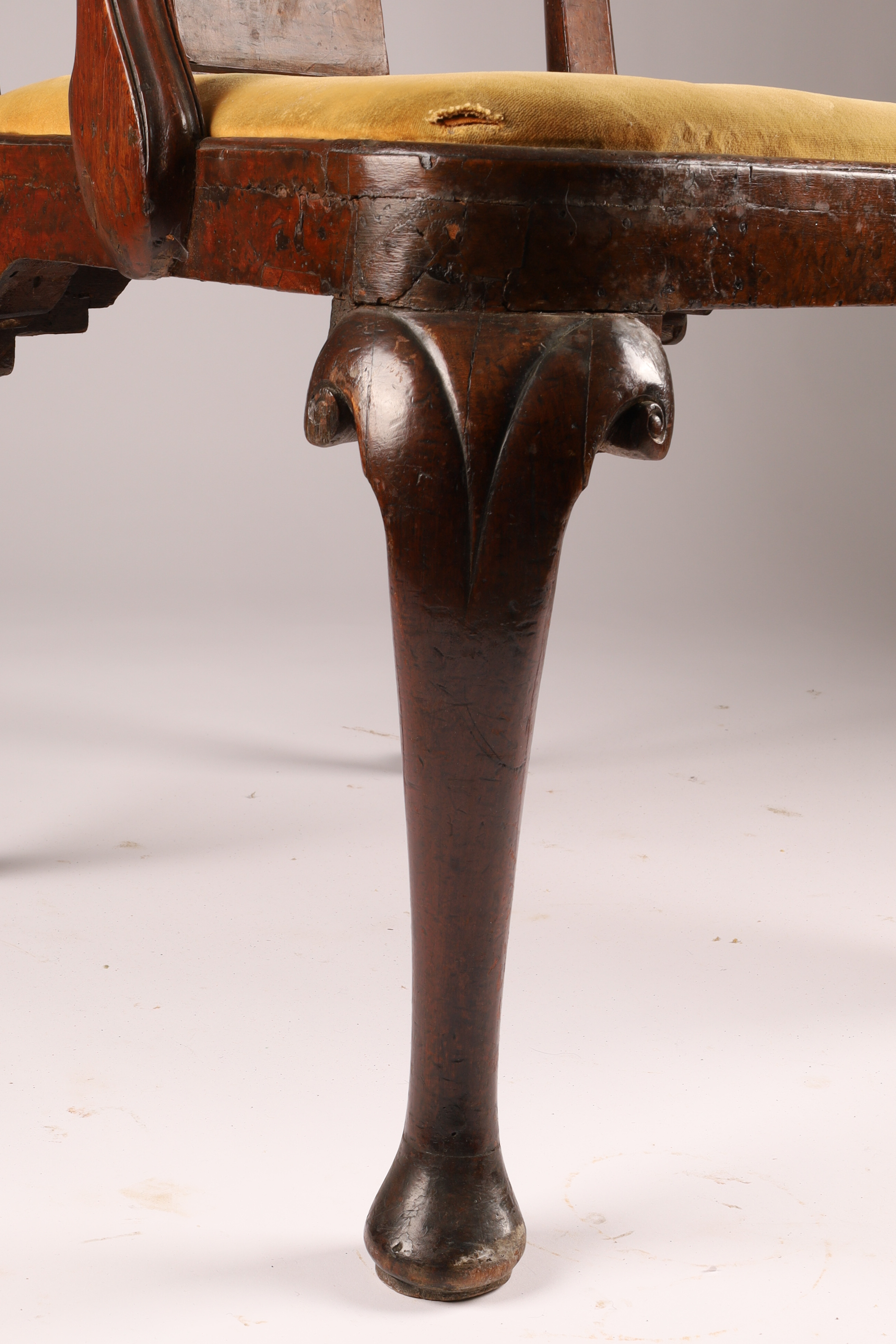 George II Burr Walnut and Mahogany Arm Chair with drop seat and some loss to back leg and restored. Some loss to veneer on backrest and skirt. 37.5 inches H x 26 W x 19 inches deep, seat height 18 inches.