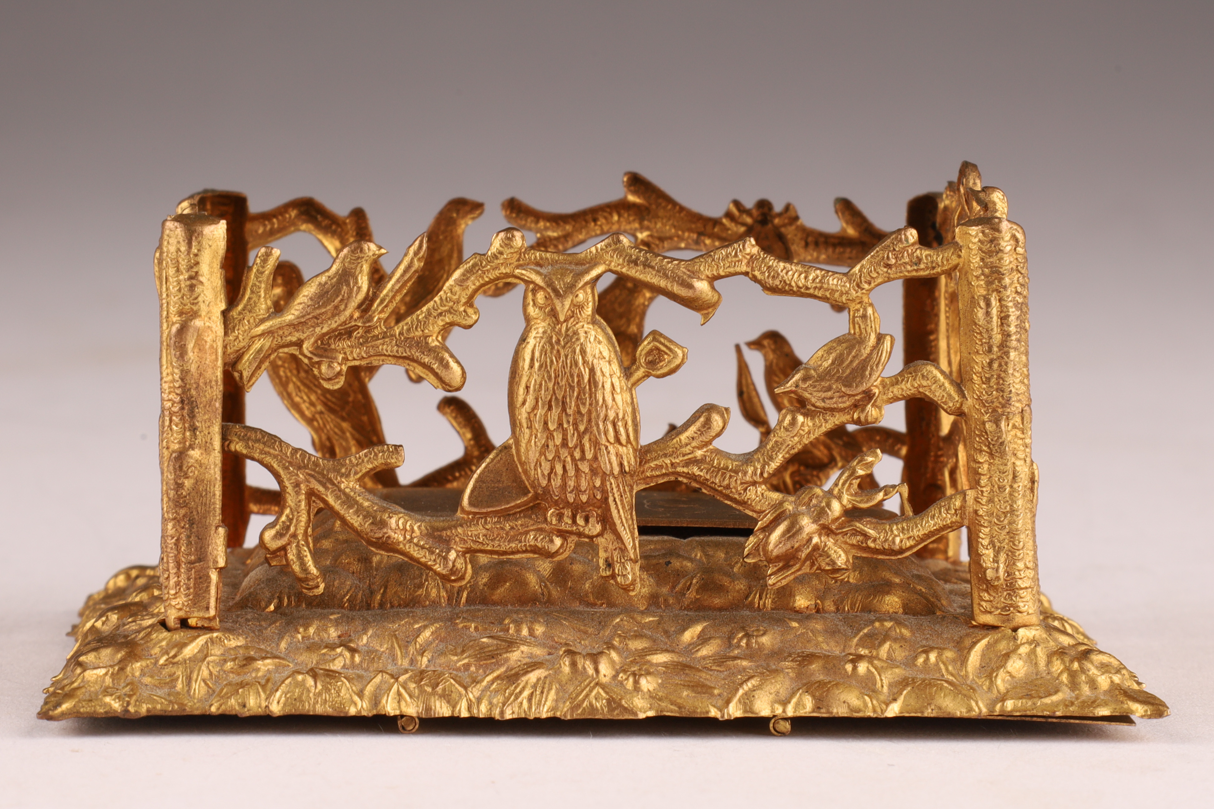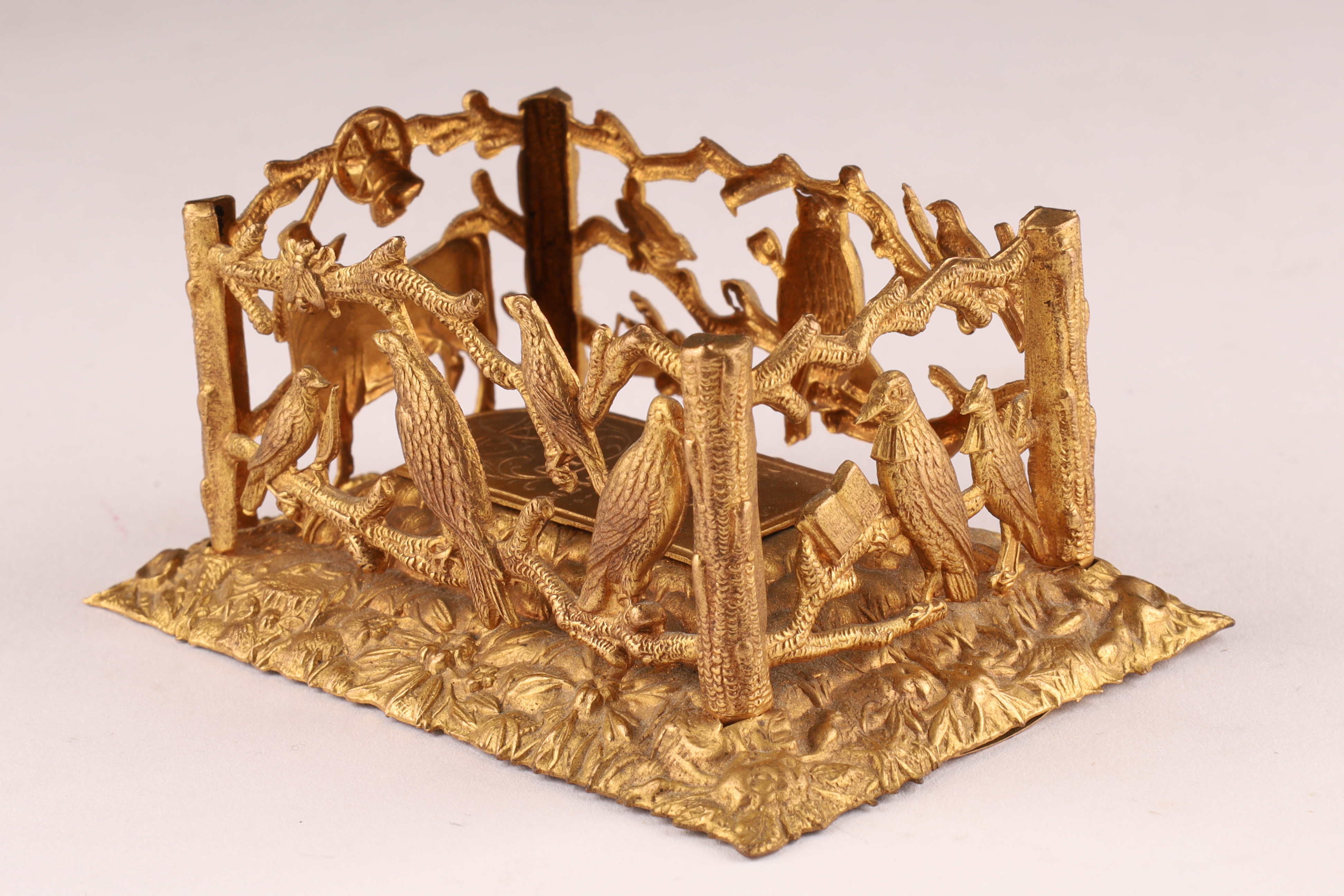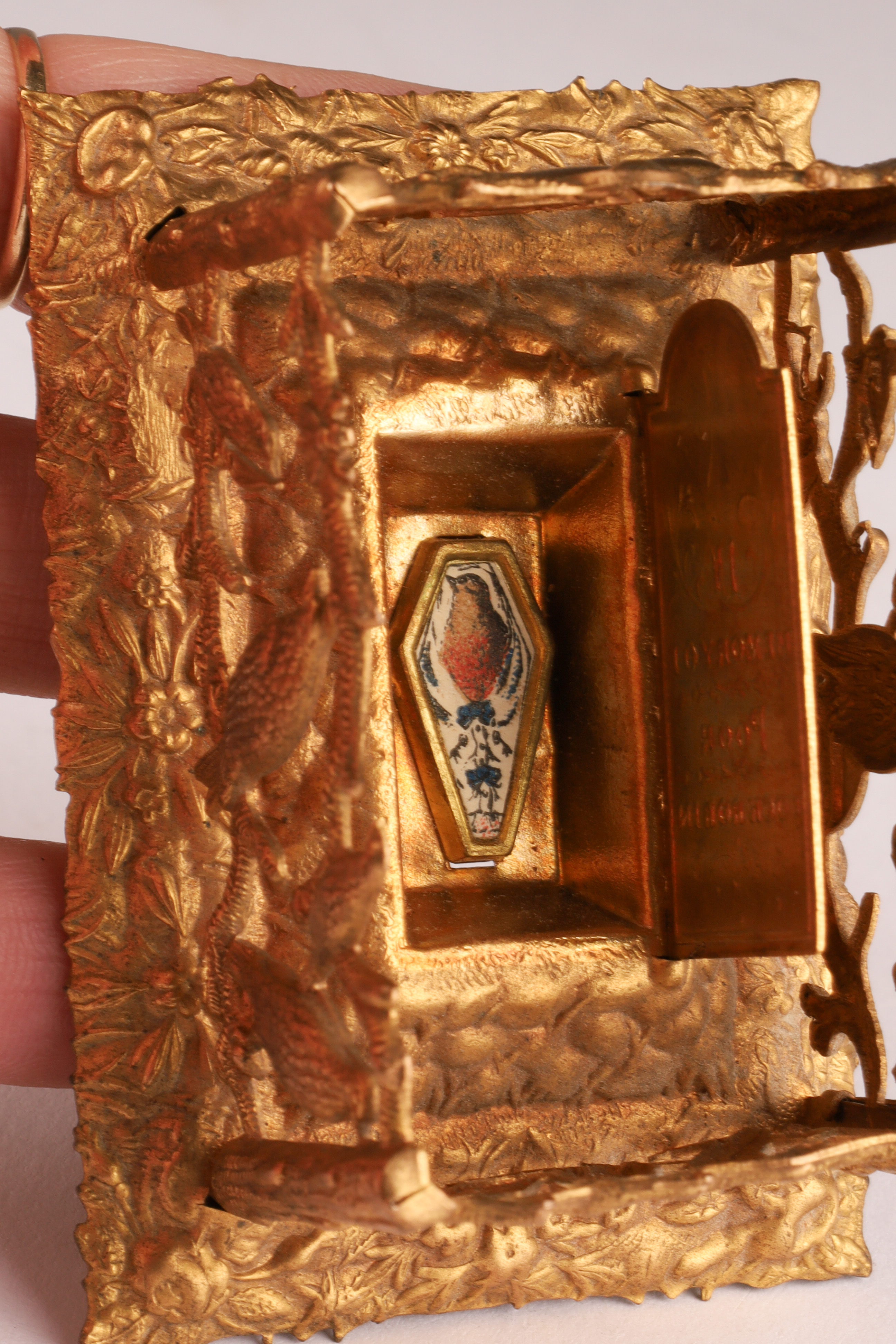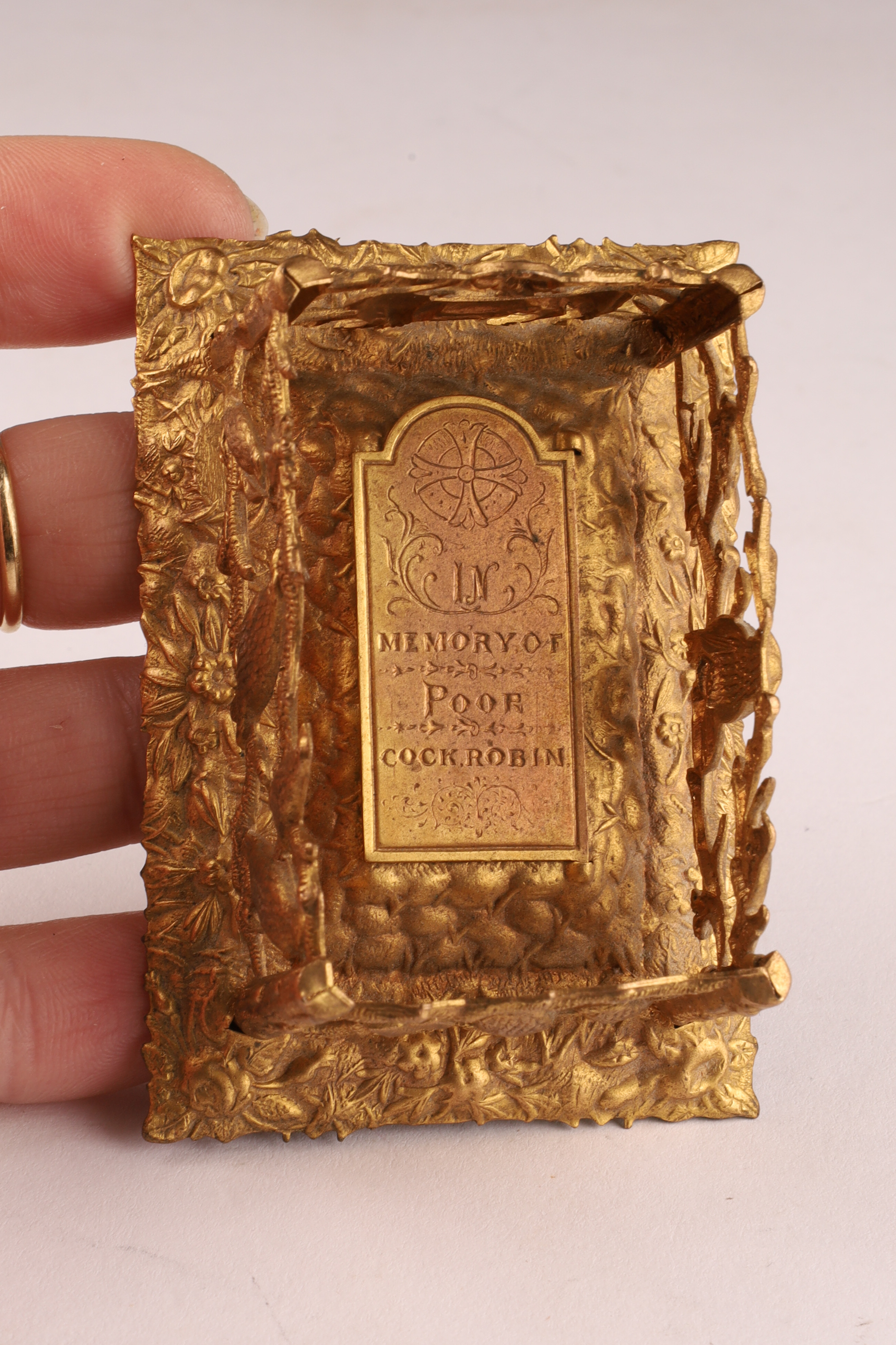 W. Avery and Son Victorian Brass Pin / Needle Holder, in the shape of a grave and casket, hinged lid "In memory of poor Cock Robin", with pierced bird and branch work border, interior including coloured print of Cock Robin. Measuring 3 inches L x 2 W x 1.5 H.