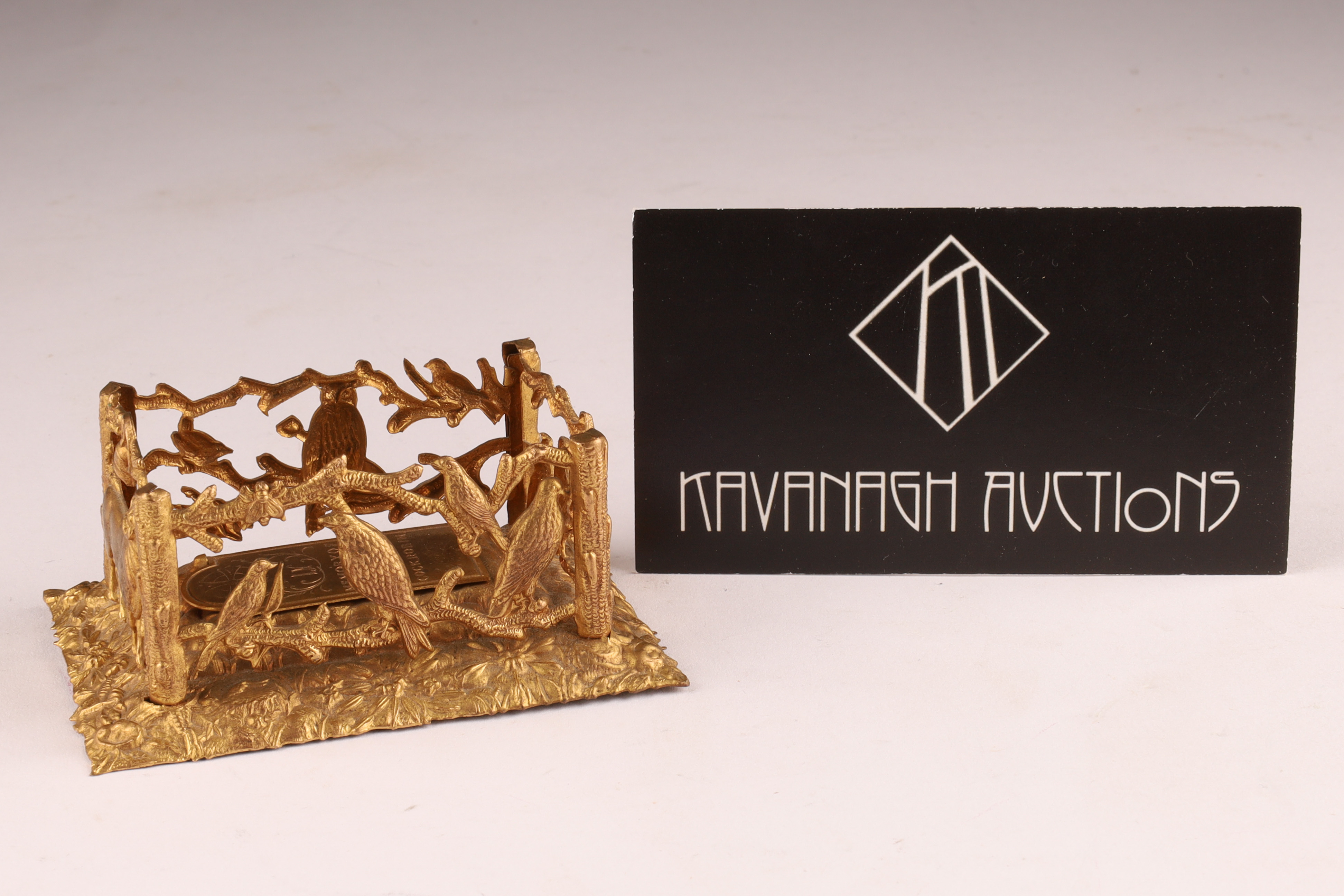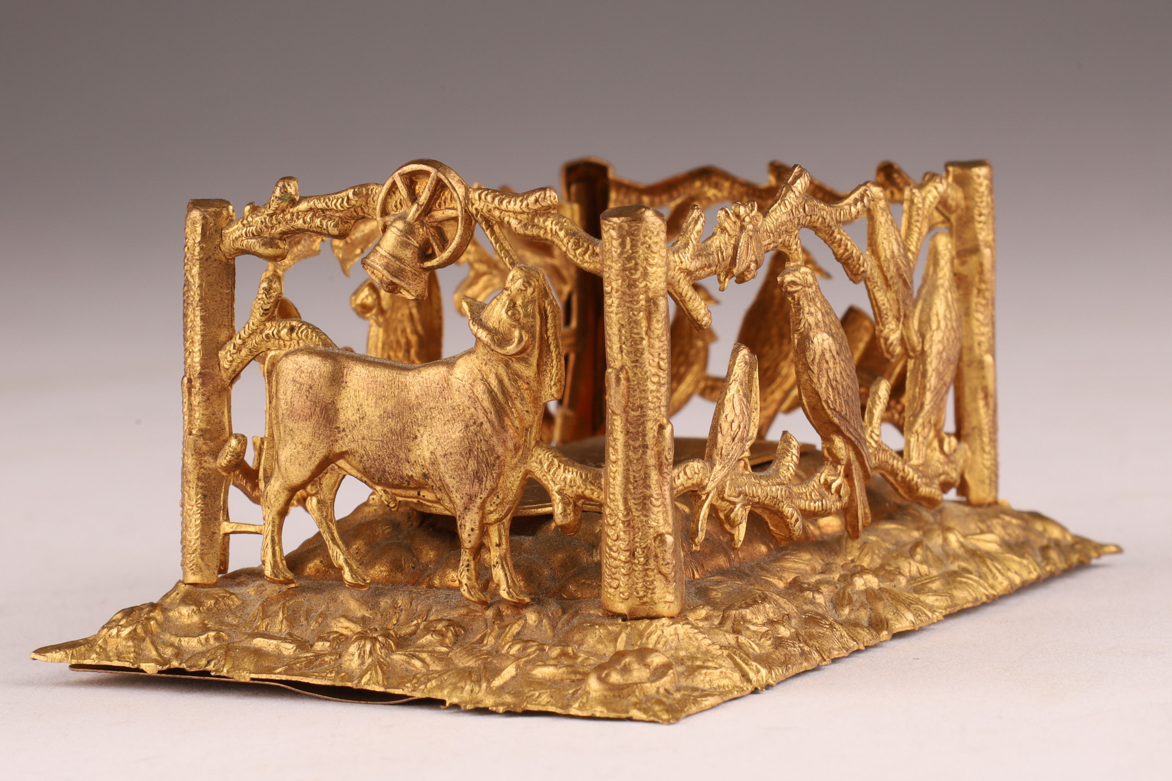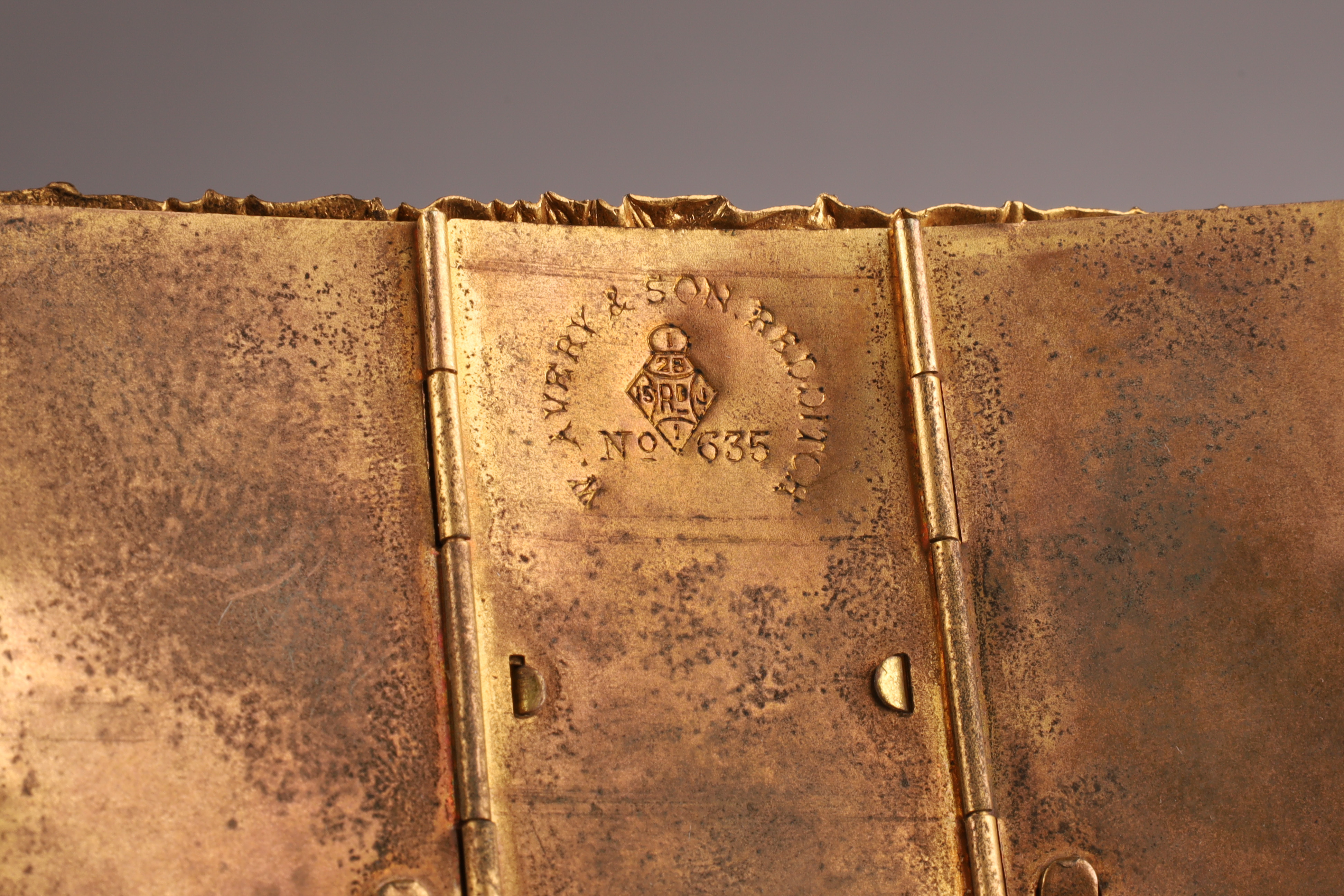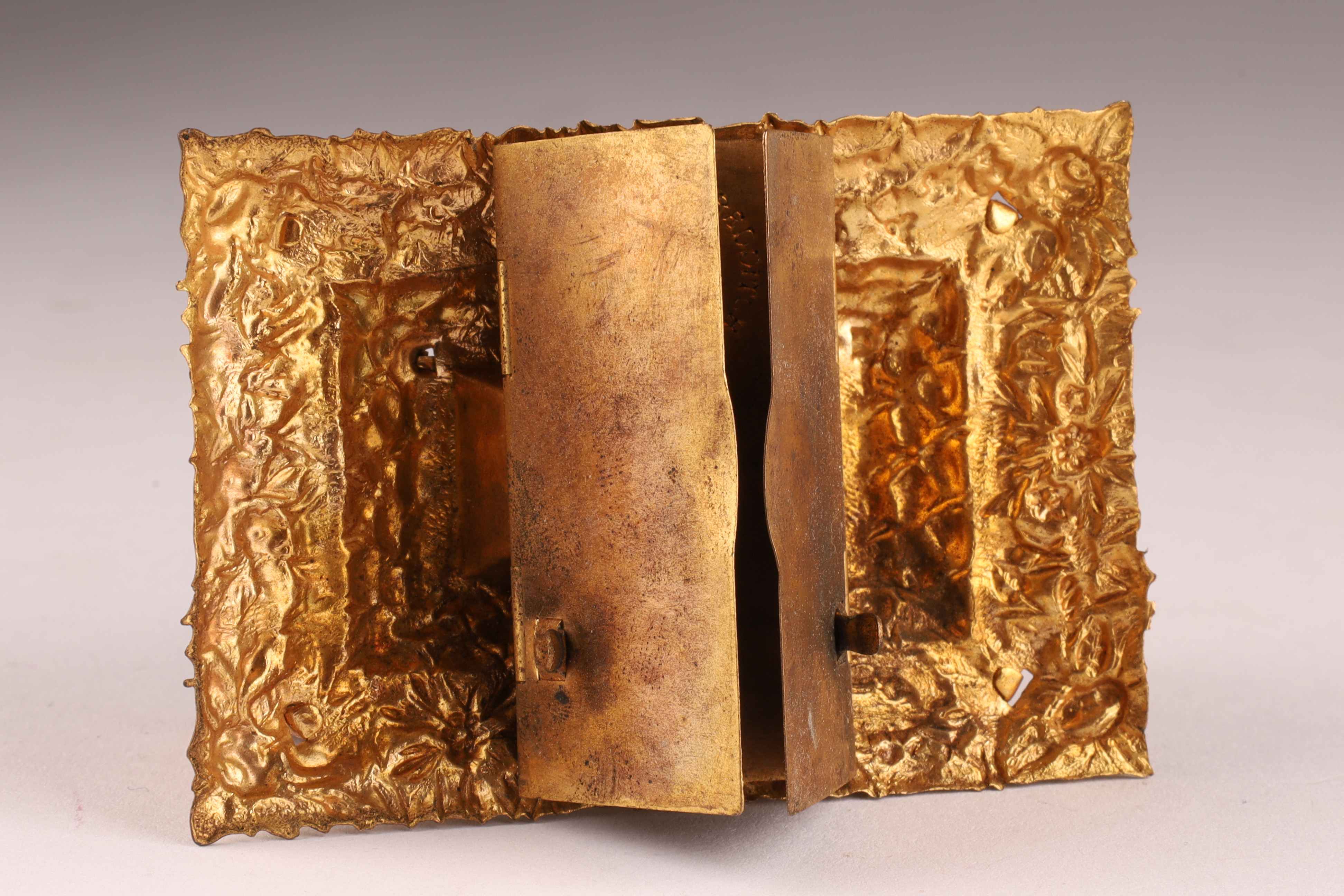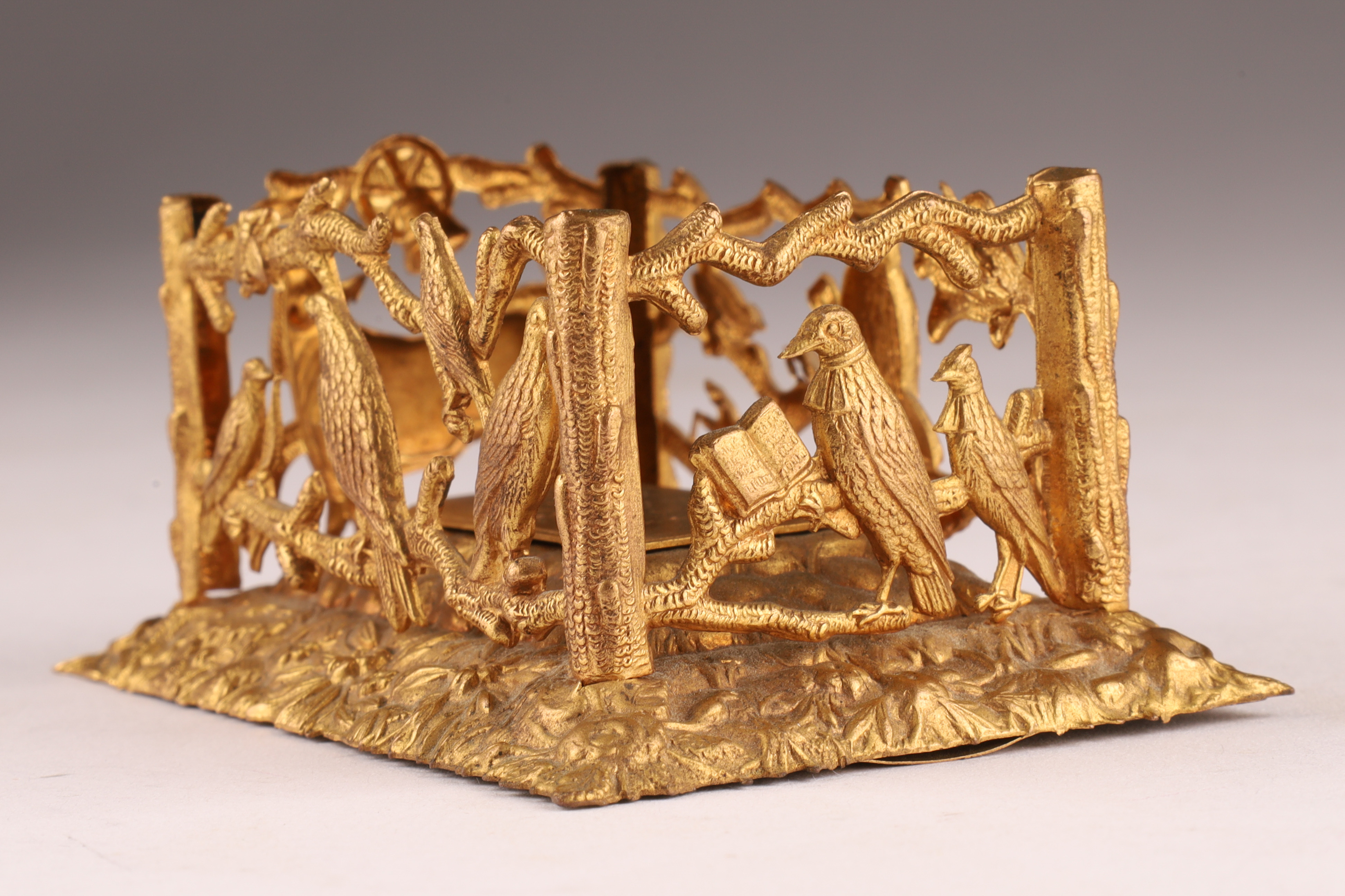 W. Avery and Son Victorian Brass Pin / Needle Holder, in the shape of a grave and casket, hinged lid "In memory of poor Cock Robin", with pierced bird and branch work border, interior including coloured print of Cock Robin. Measuring 3 inches L x 2 W x 1.5 H.