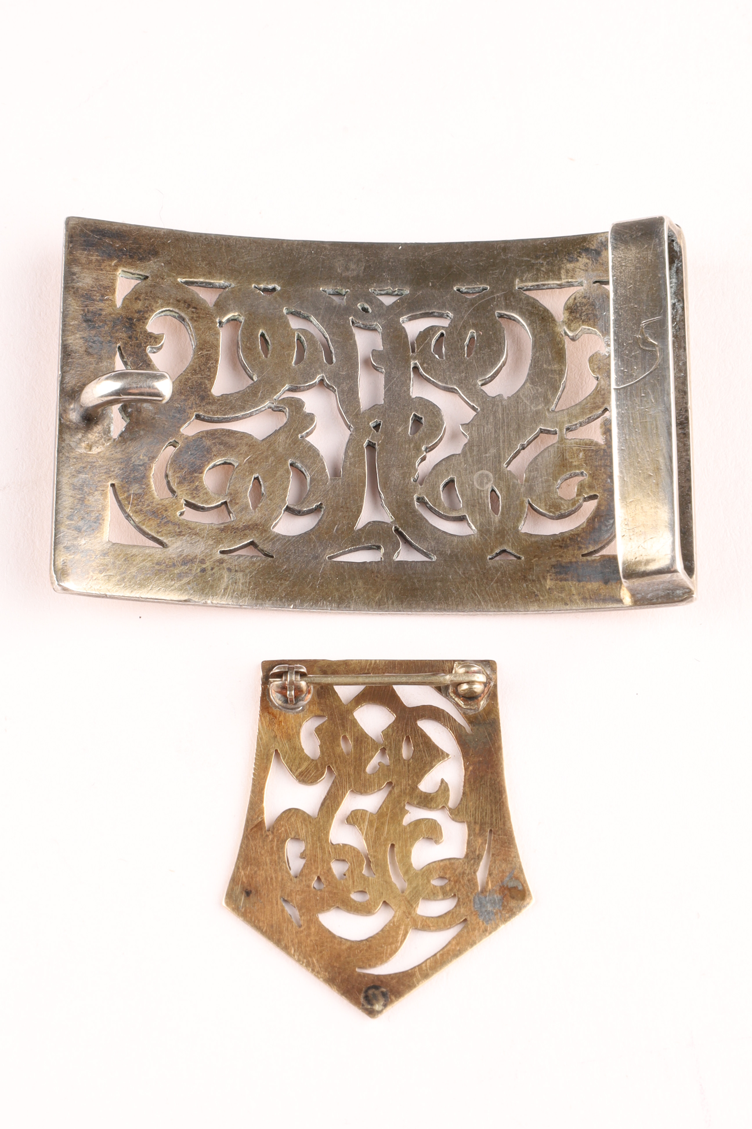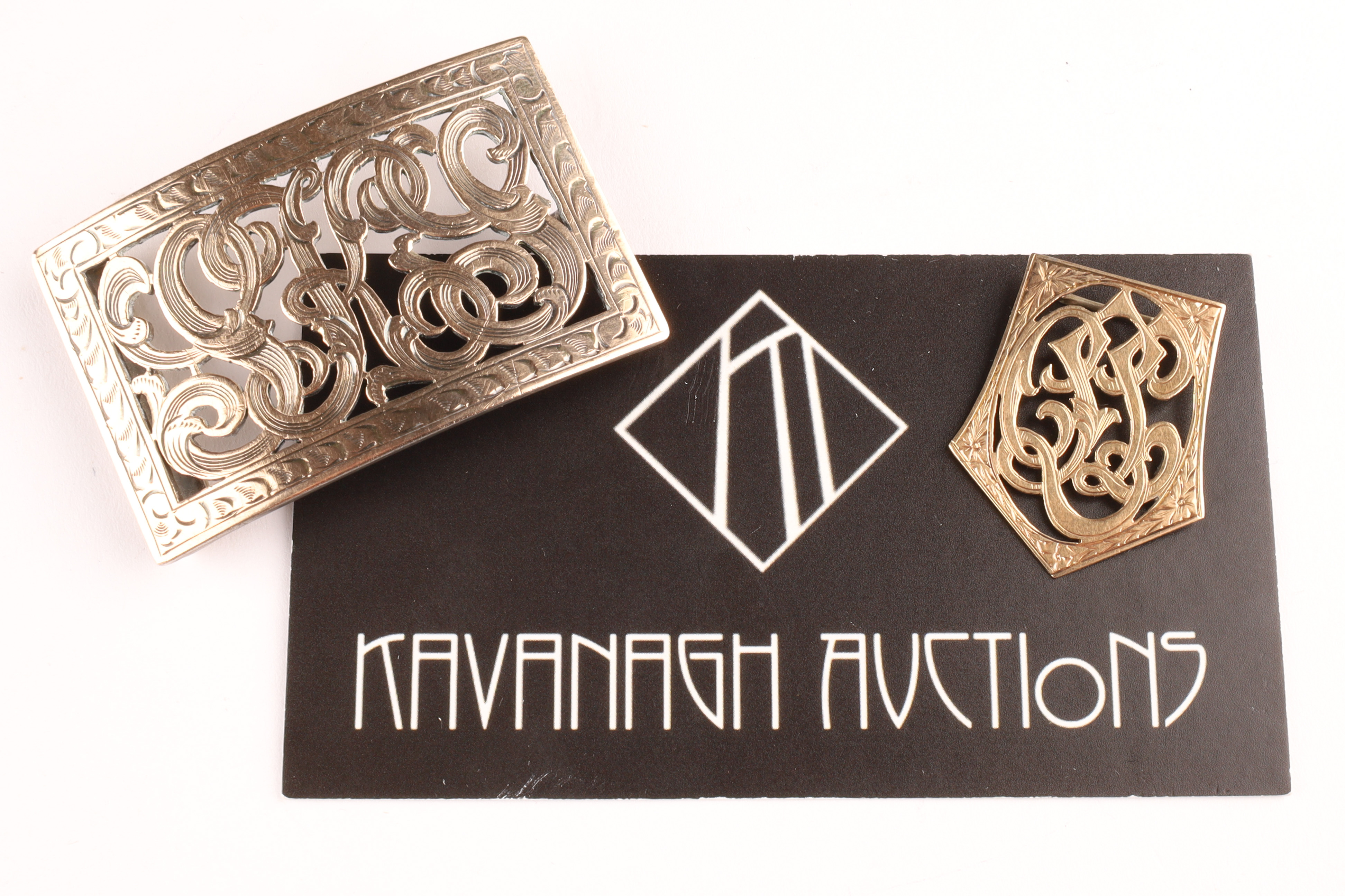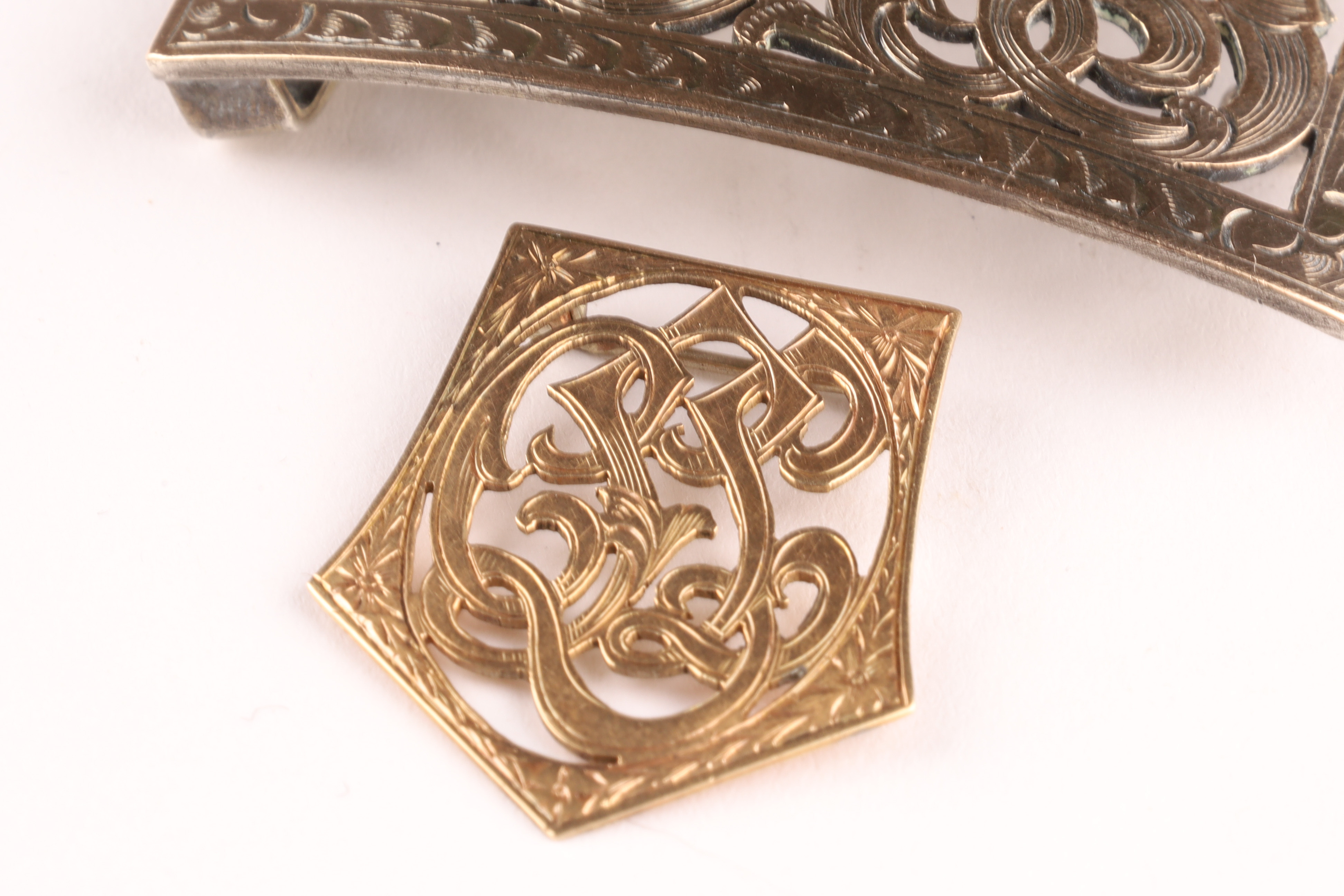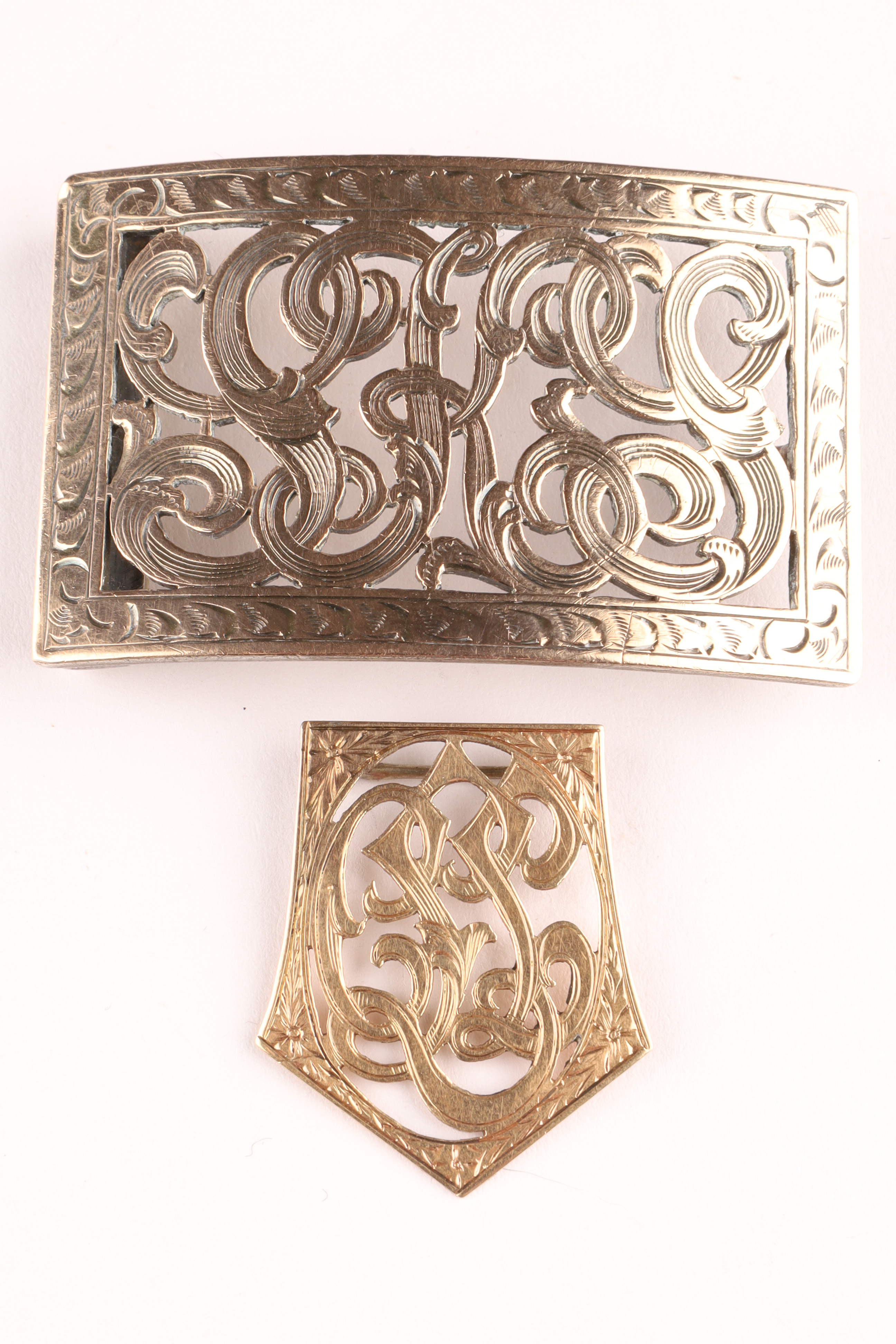 Lot Edwardian Monogram Gilt Silver and 9K Gold Brooches / Buckles