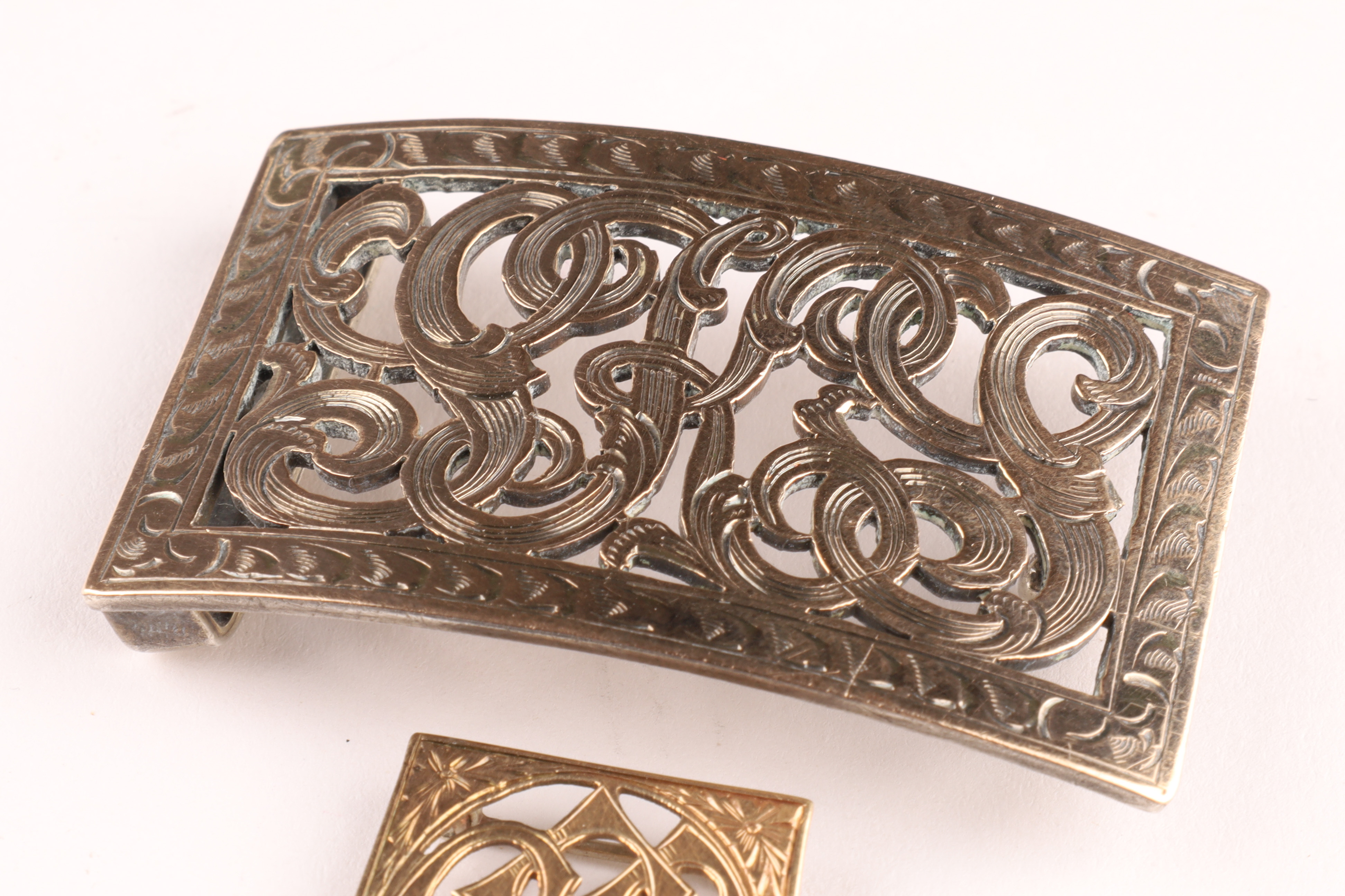 Lot Edwardian Monogram Gilt Silver and 9K Gold Brooches / Buckles. 9K gold pin weighs 2.7 grams, measures 1 inch. Gilt silver buckle measures 2 inches L x 1 W, 18.9 grams.
