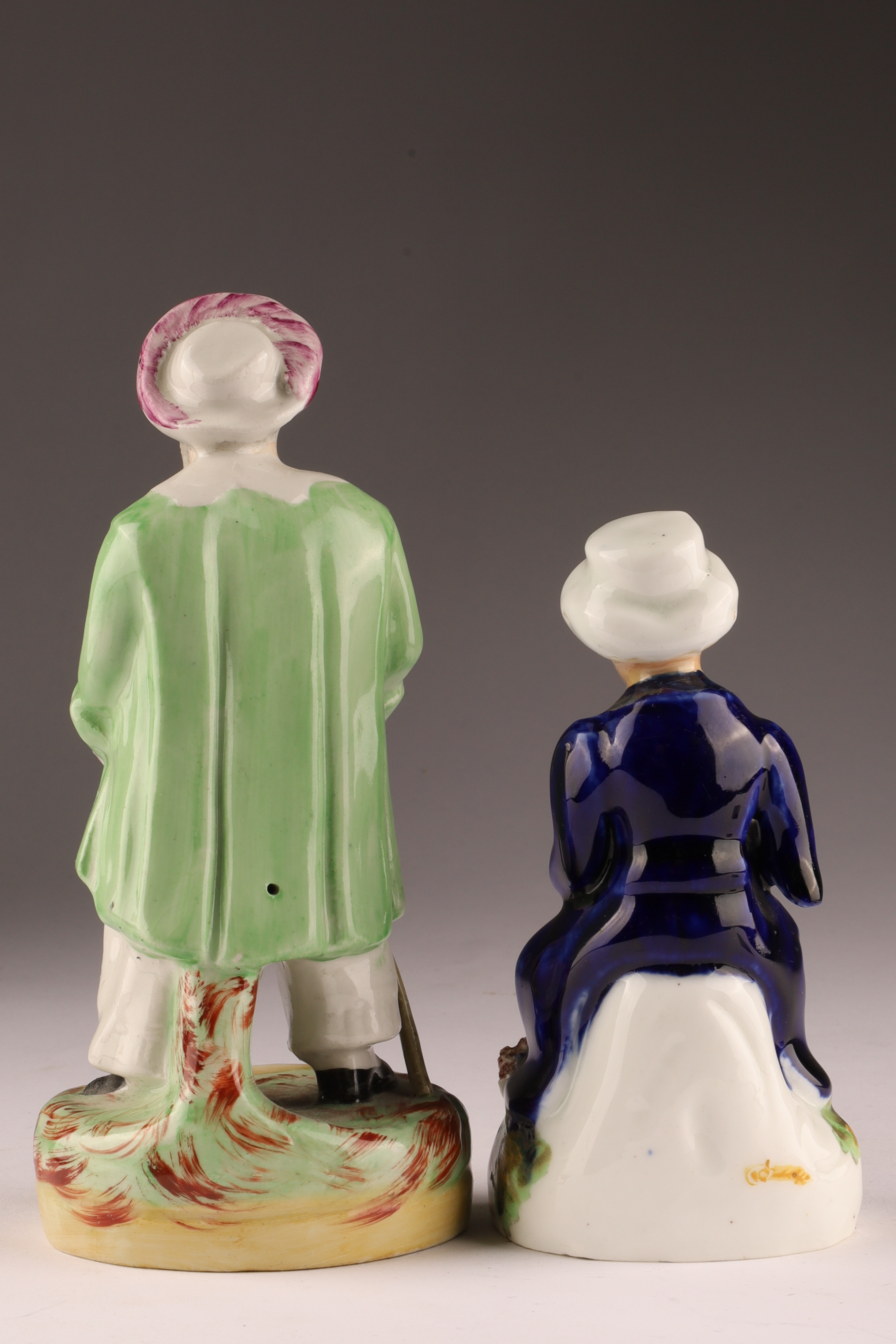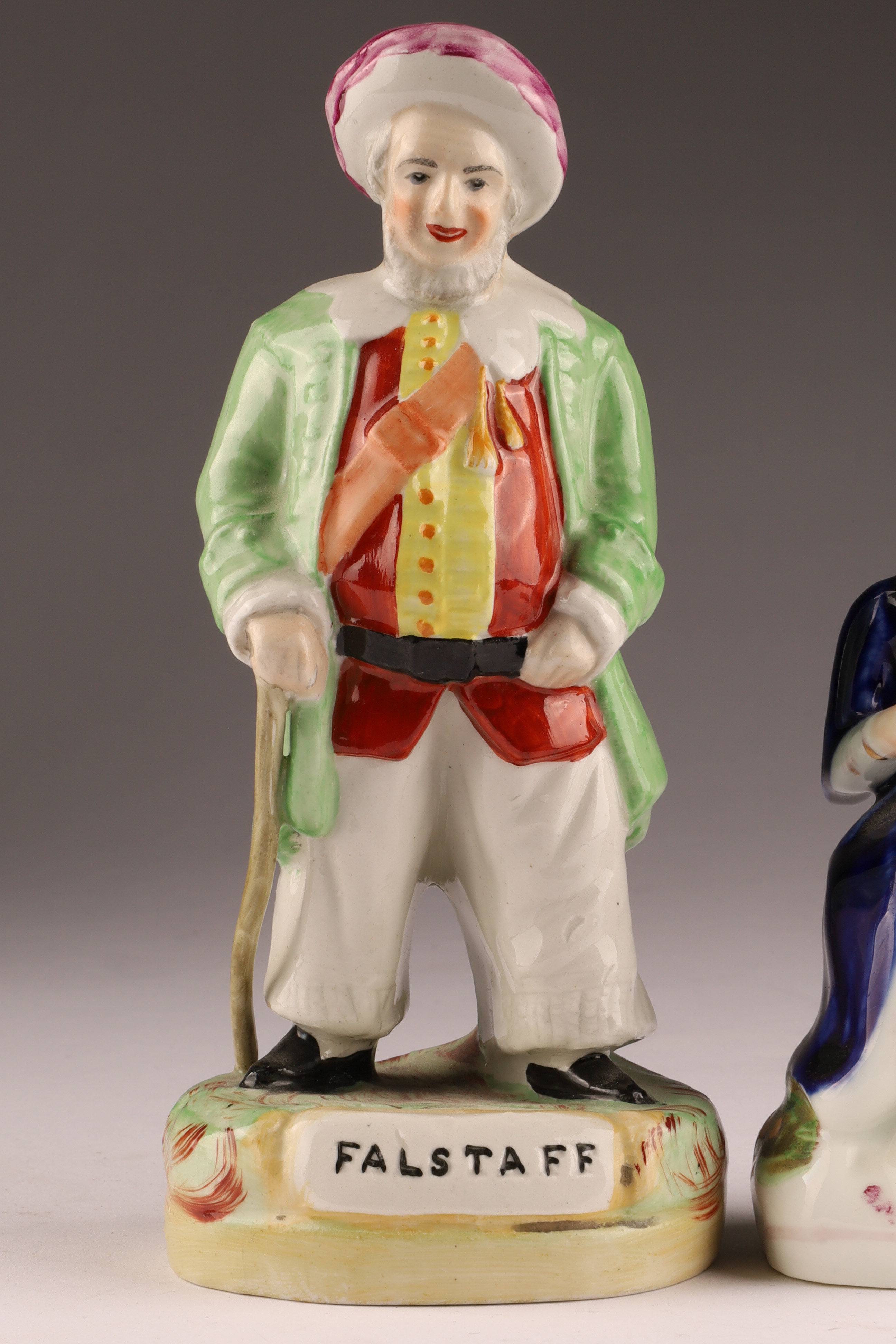 Pair of antique Victorian Staffordshire pottery figurines. One figure of Sir John Falstaff, a character from several Shakespeare plays, measures 7 inches H.