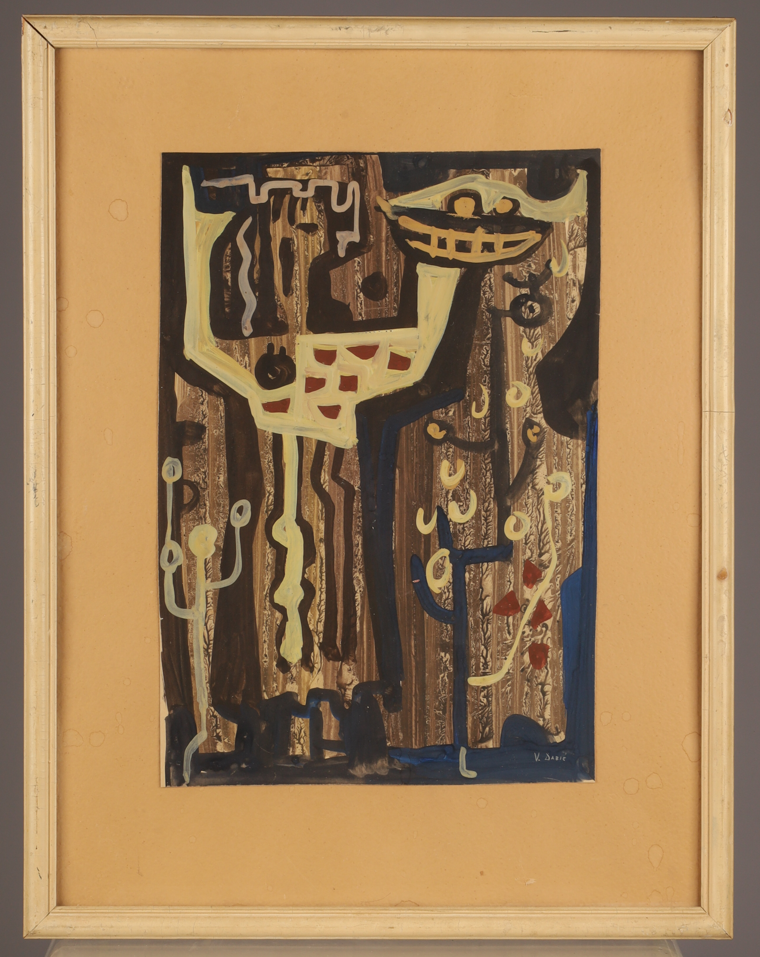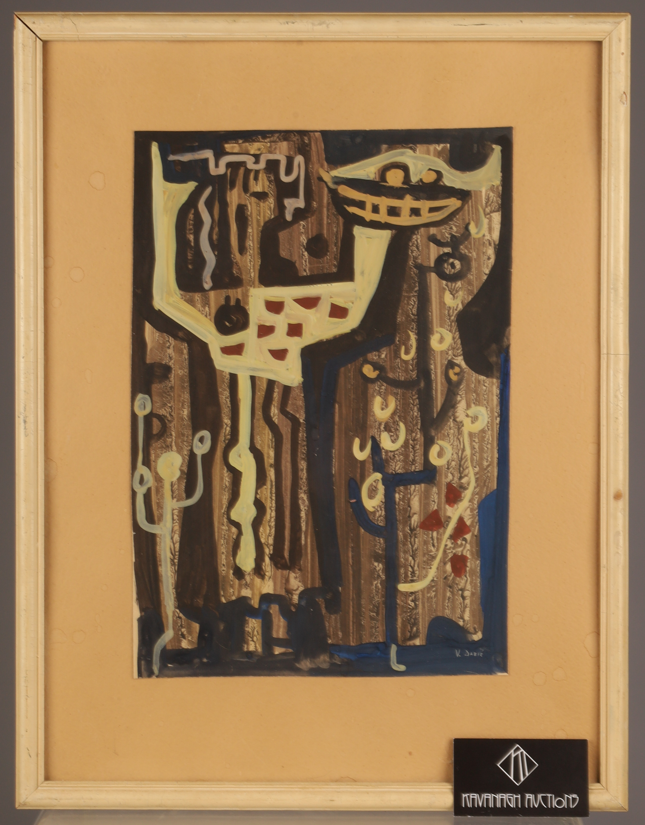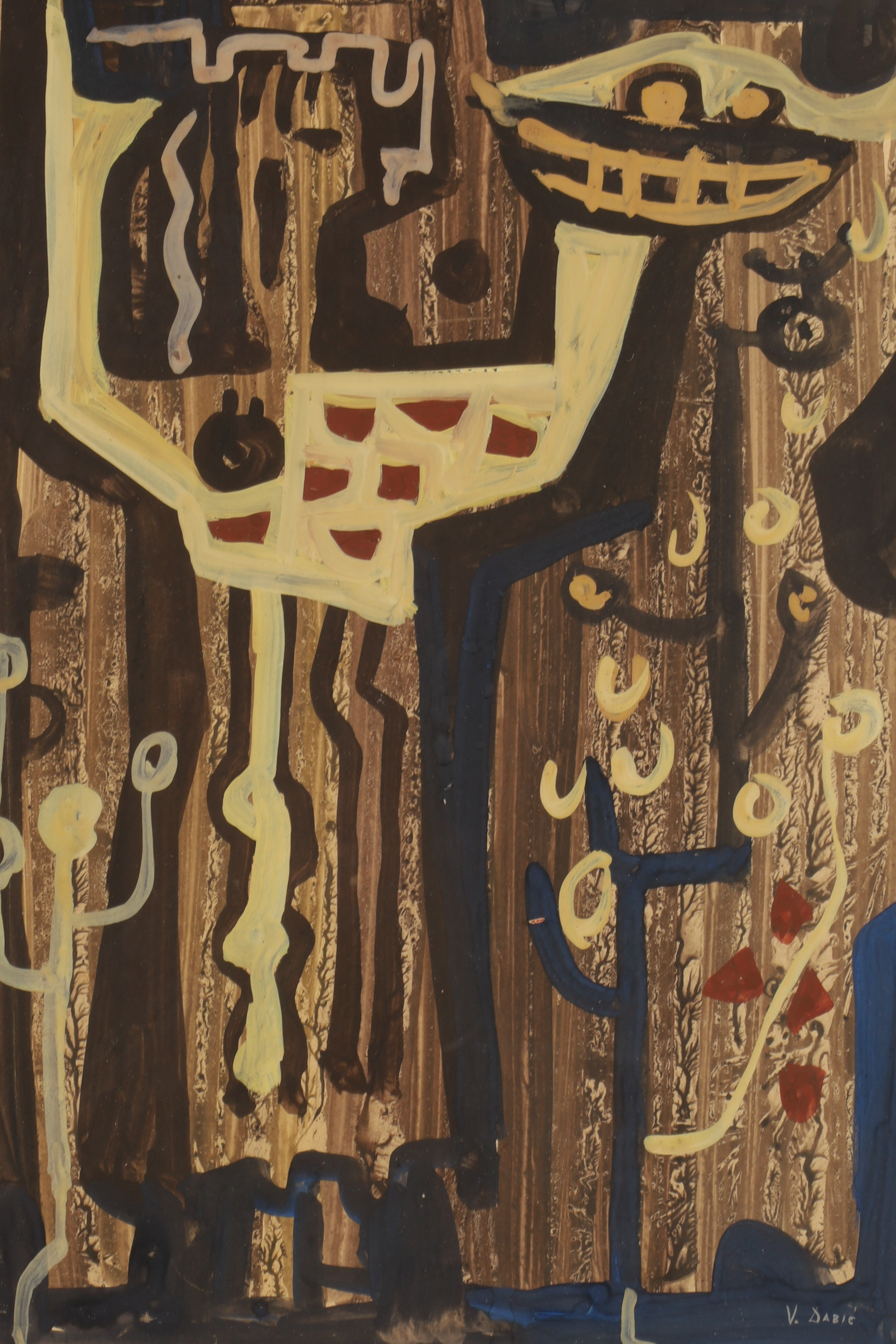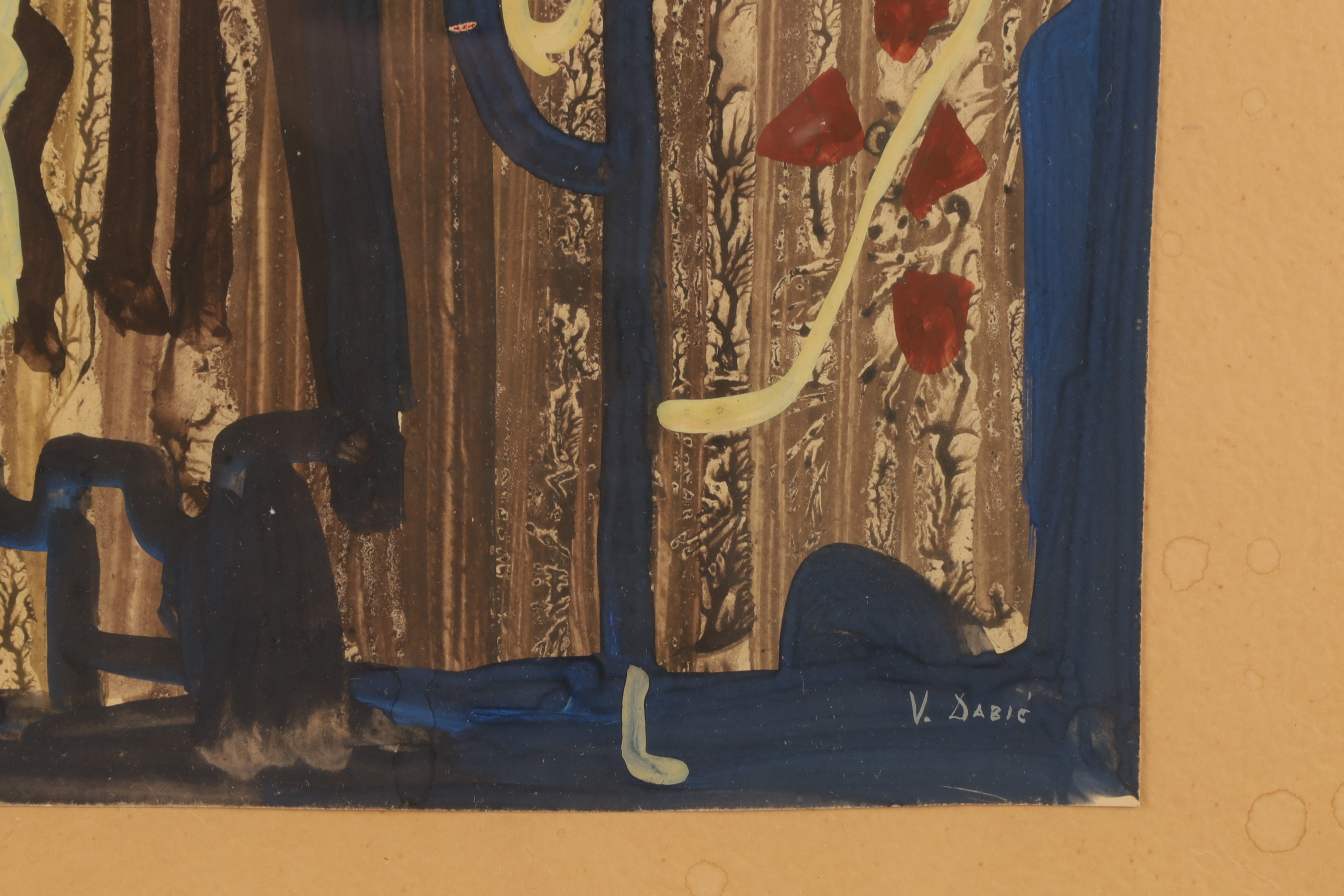Mid Century Abstract Expressionist Mixed Media on Paper Signed V. Dabic. Paper measures 14 inches H x 10 W, frame measures 21 x 16 inches.