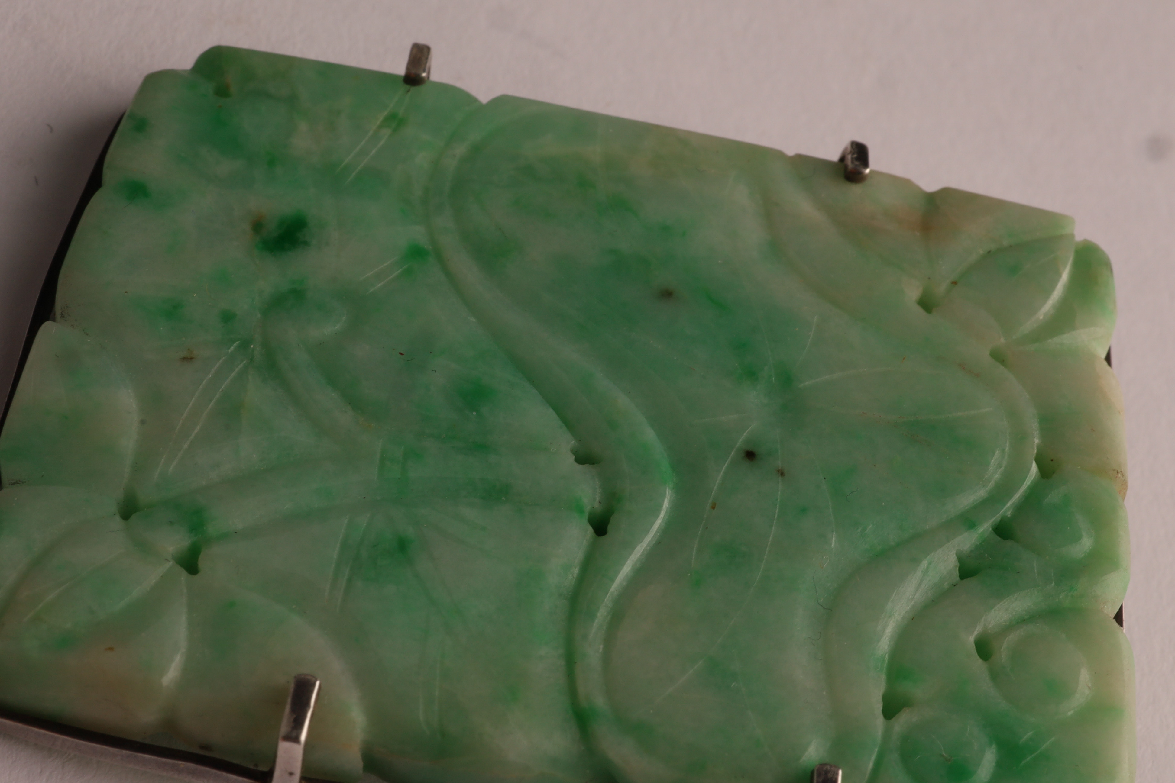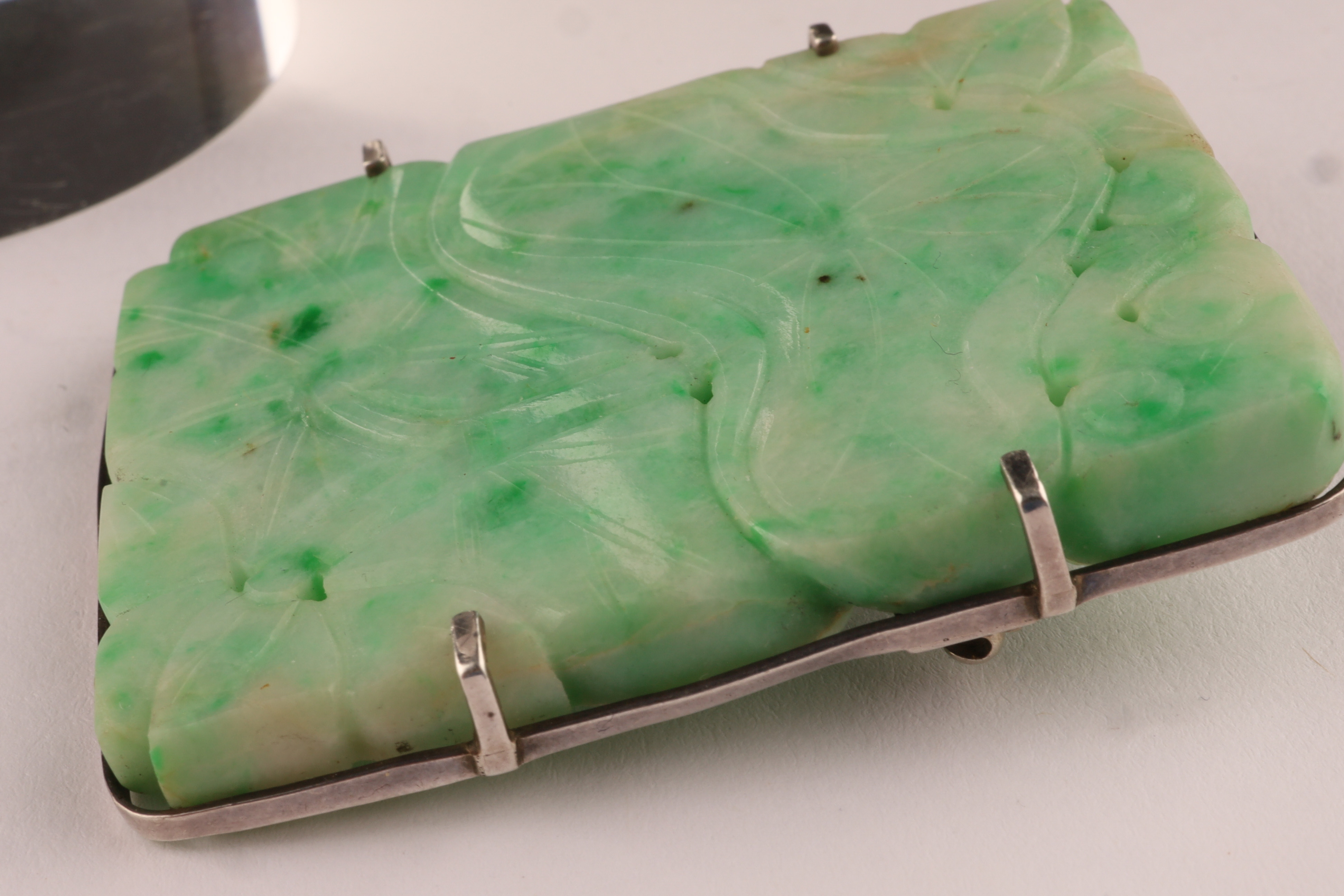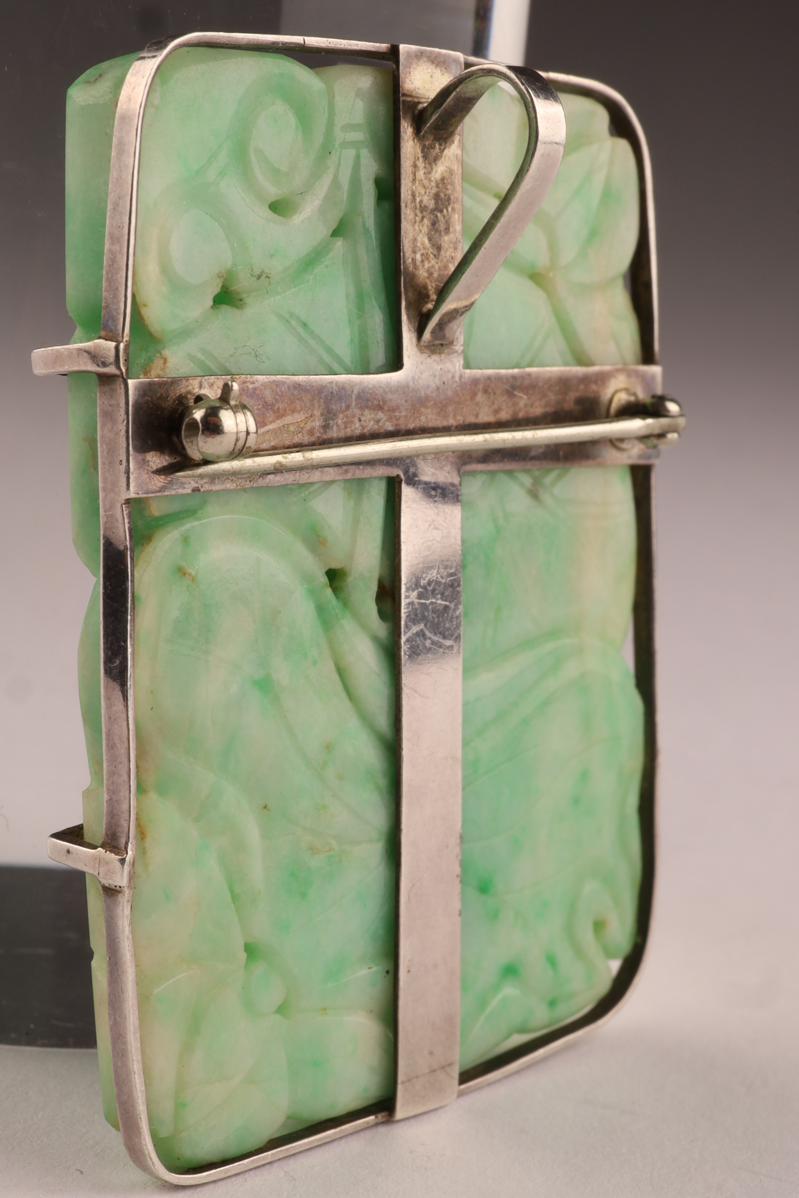 Antique carved jade pendant brooch of rectangular form, worked in translucent pale green jade with darker inclusions. The front carved in low relief with flowing foliate and scrolling motifs, pierced in places. The reverse mounted in a silver frame fitted with a hinged pin and catch, allowing the piece to be worn either as a brooch or pendant.