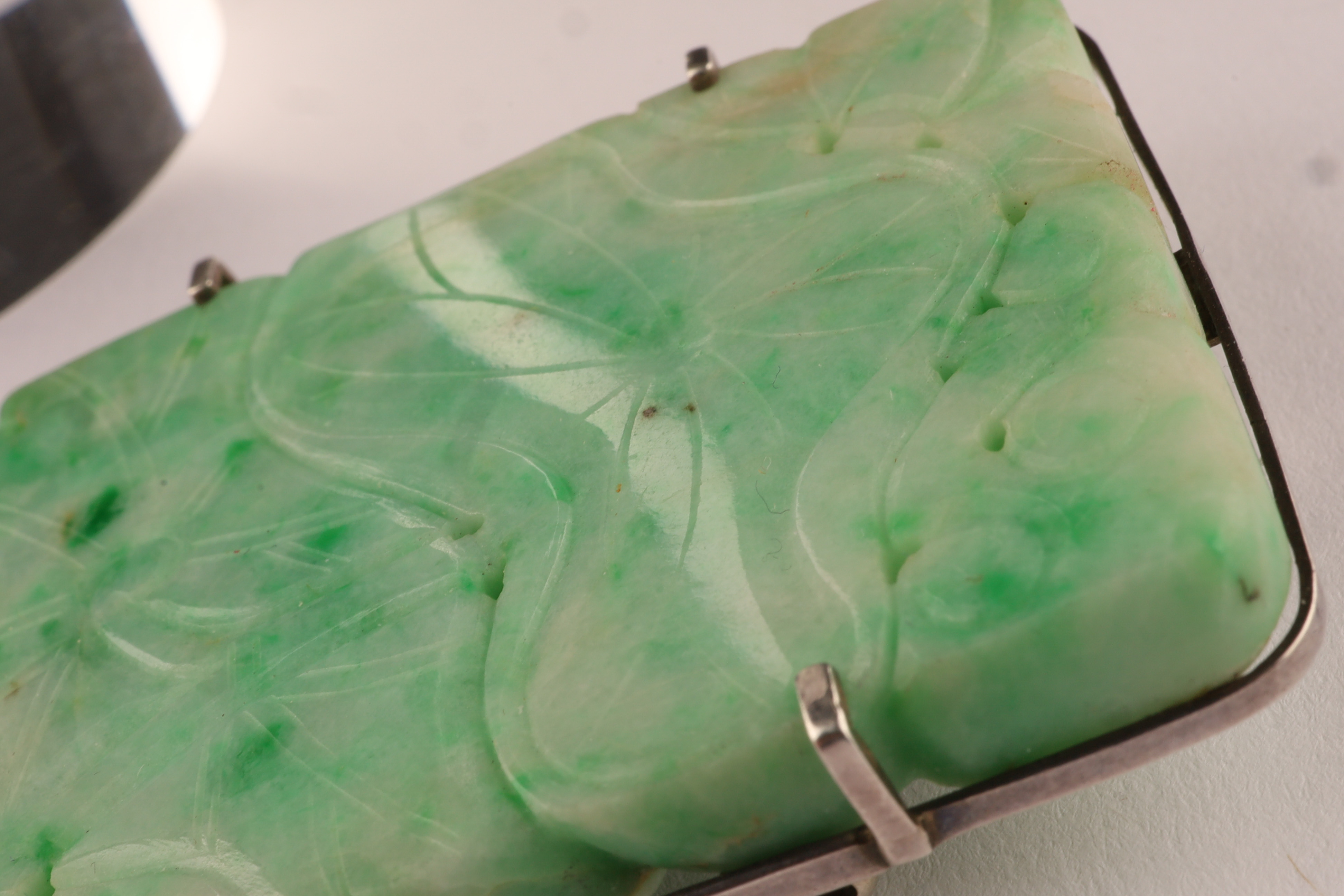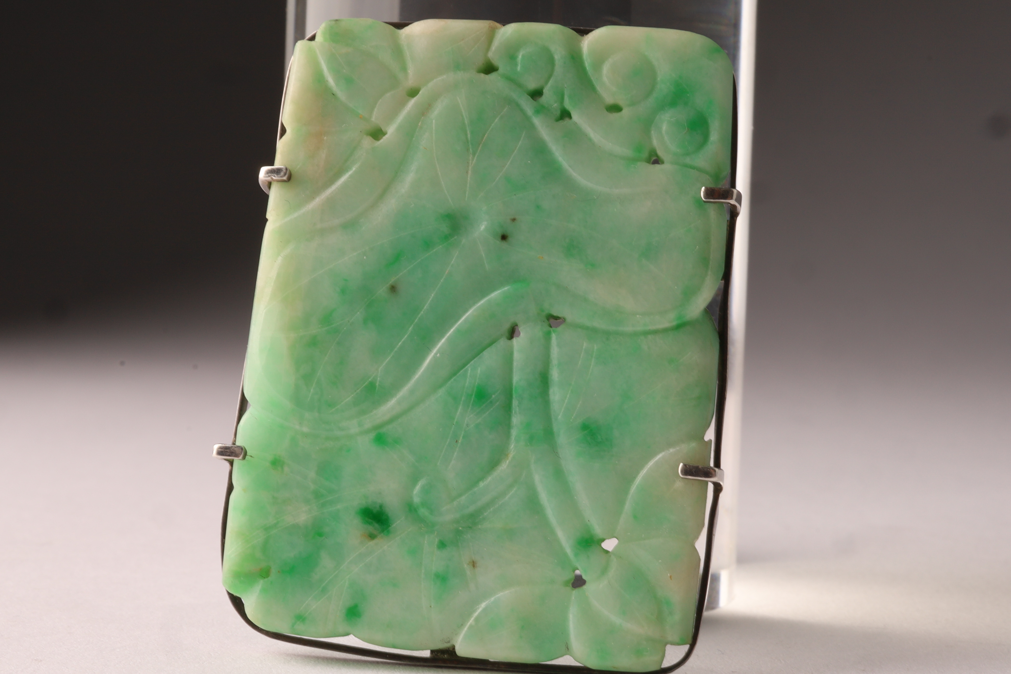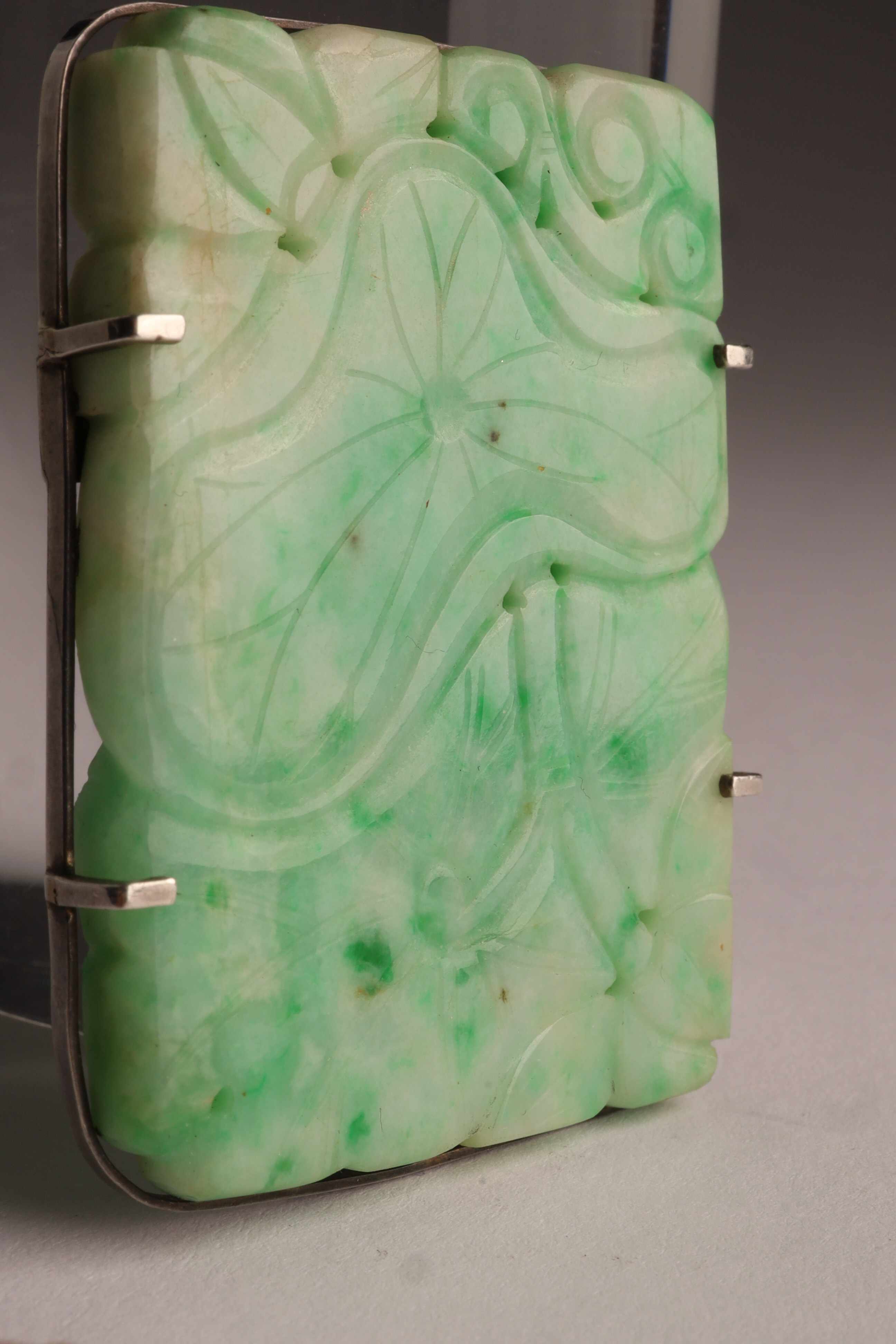 Antique carved jade pendant brooch of rectangular form, worked in translucent pale green jade with darker inclusions. The front carved in low relief with flowing foliate and scrolling motifs, pierced in places. The reverse mounted in a silver frame fitted with a hinged pin and catch, allowing the piece to be worn either as a brooch or pendant.